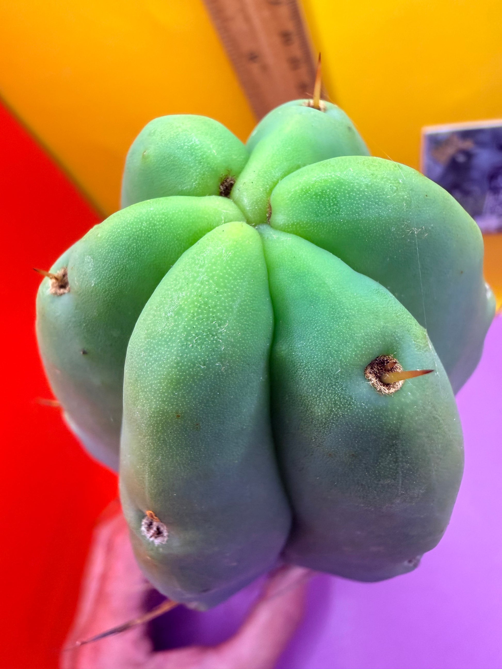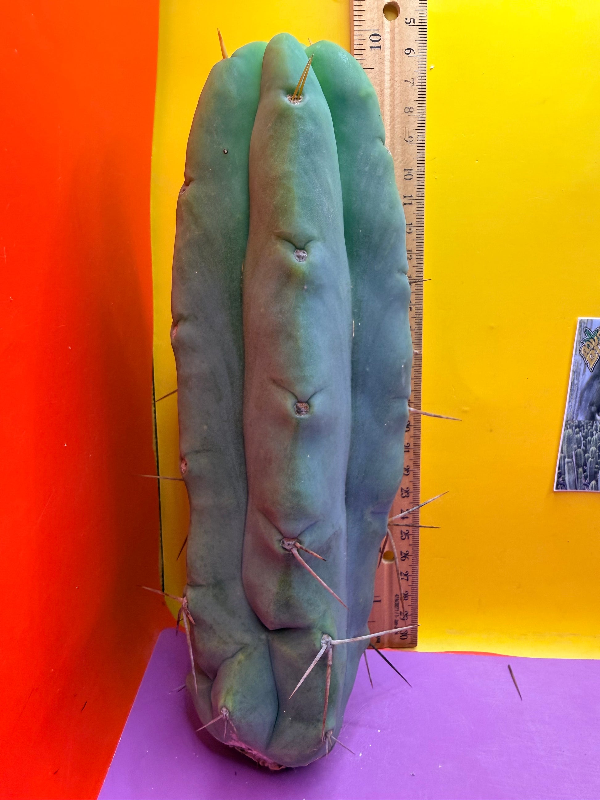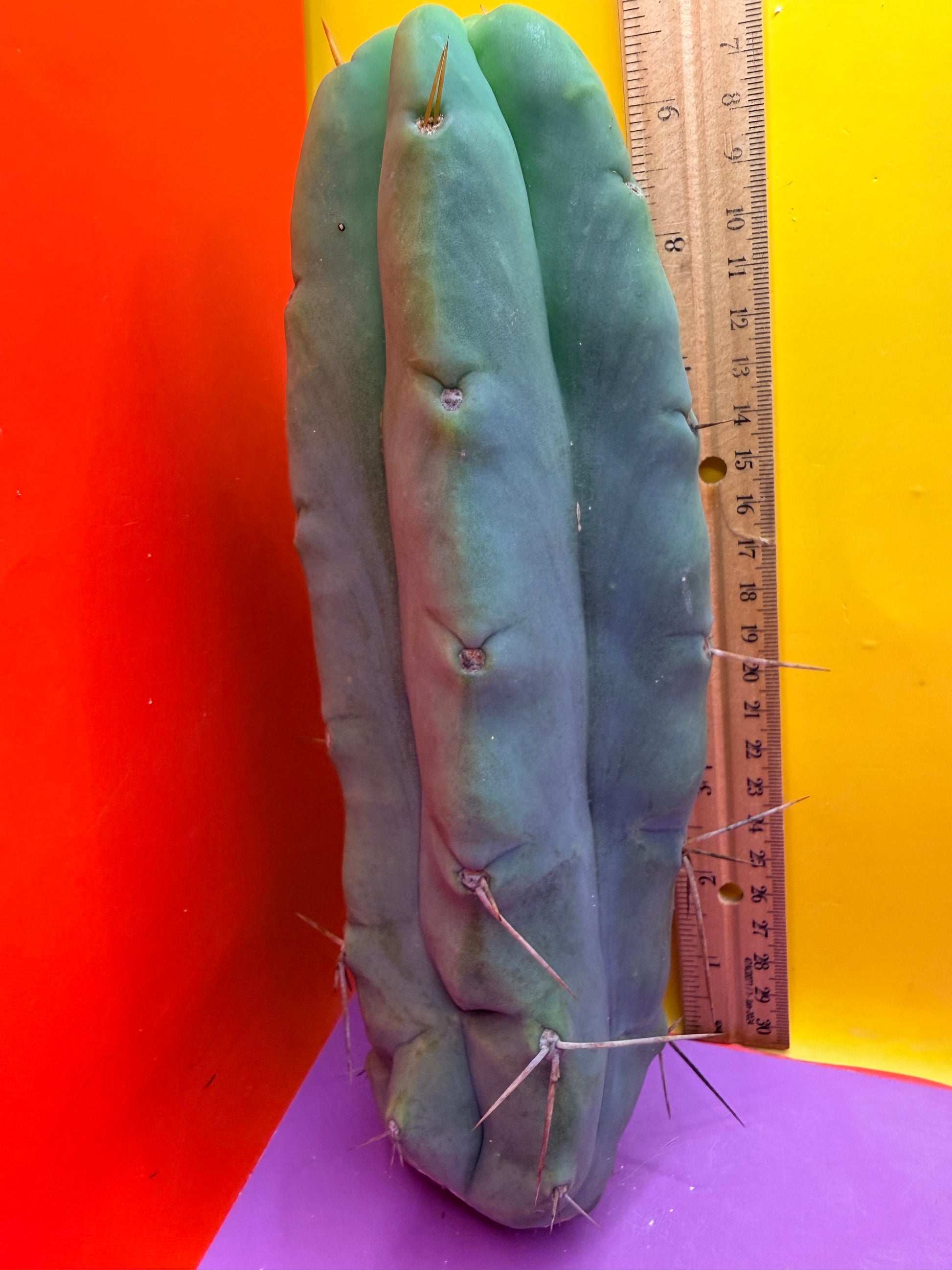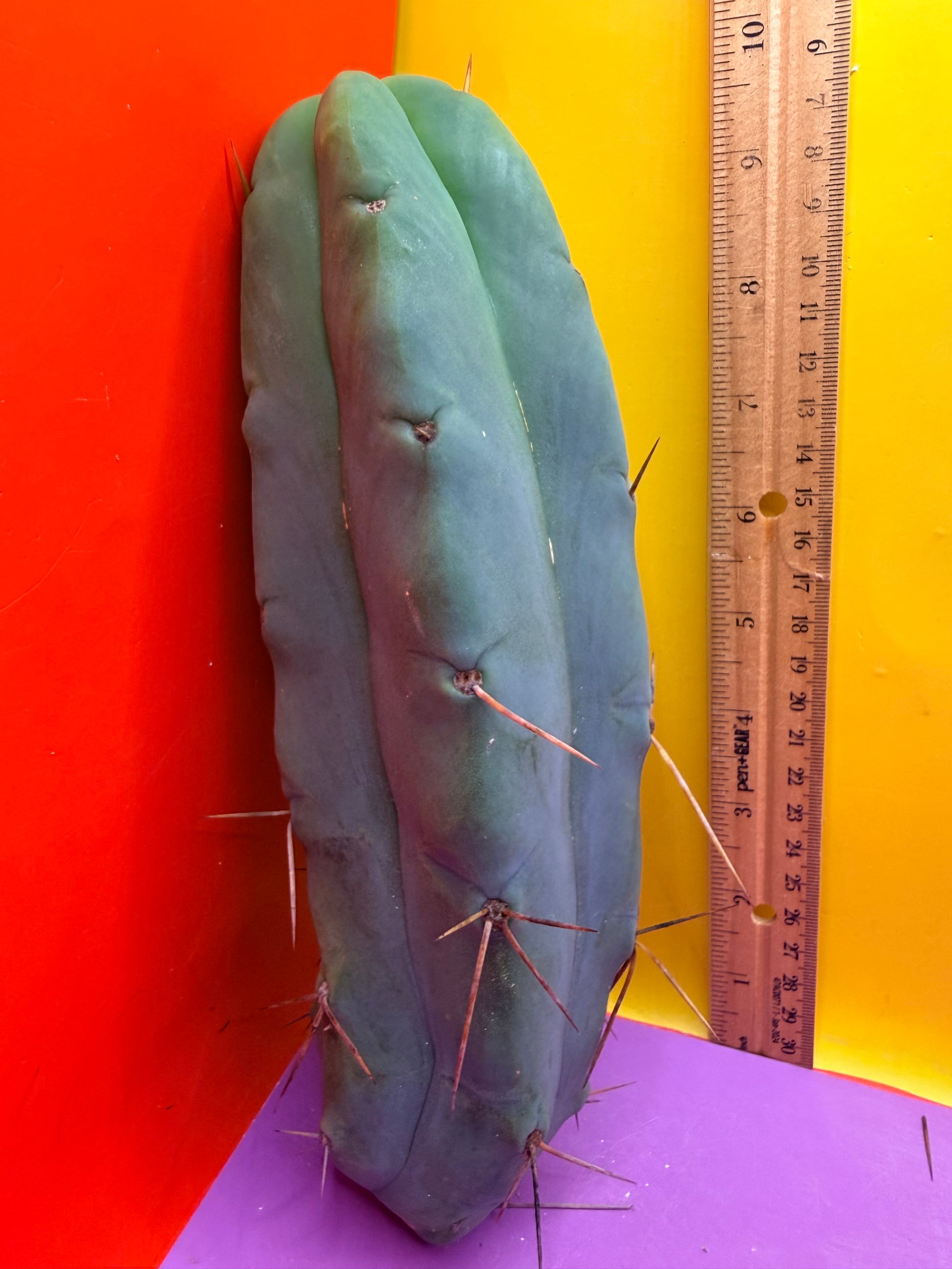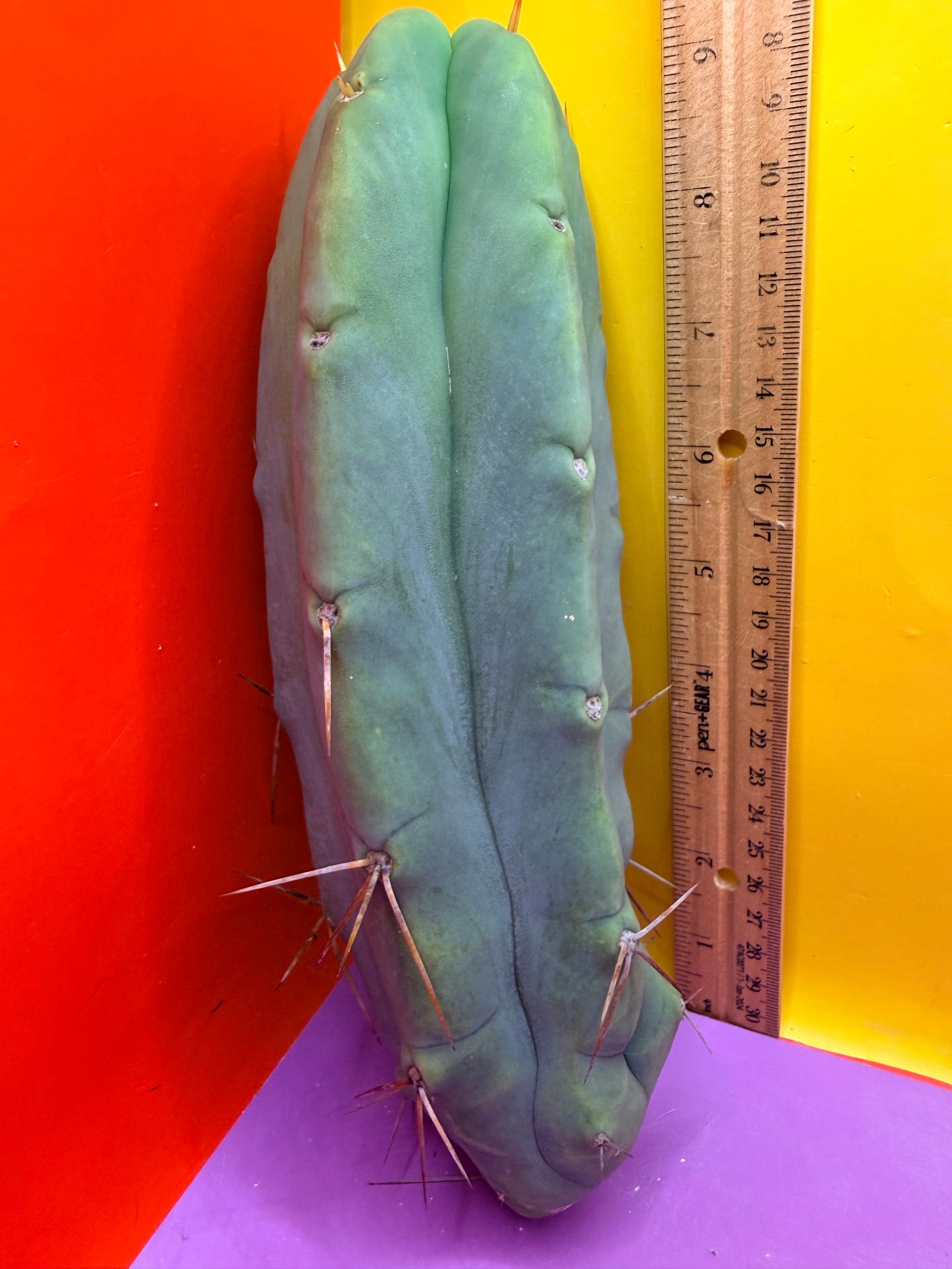 You will receive this exact cactus cutting ! This is very healthy . “LMA” is a Trichocereus Bridgesii, the name LMA is an abbreviation for La Mirada Angelo . The original motherstand was originally cared for in the town of La Mirada by a man named Angelo who has sadly passed away . Angelo’s memory lives on through his phenomenal clone that gets awesome strange growth ,has a cool wavy rib pattern , rib shifts and often losses its spines growing as a bald bridgesii . I’ve personally grown this exact cutting with care and done my best to preserve all of its spines and will carefully ship it to you , doing my best to keep the spines intact , but the spines do easily brush off . The bald look of this cactus is quite appealing and unlike many skinny bridgesii this spicy beast loves to grow fat and thick ! This particular cutting is fully hydrated and all sides are pictured- ruler is a foot long in both inches and centimeters.