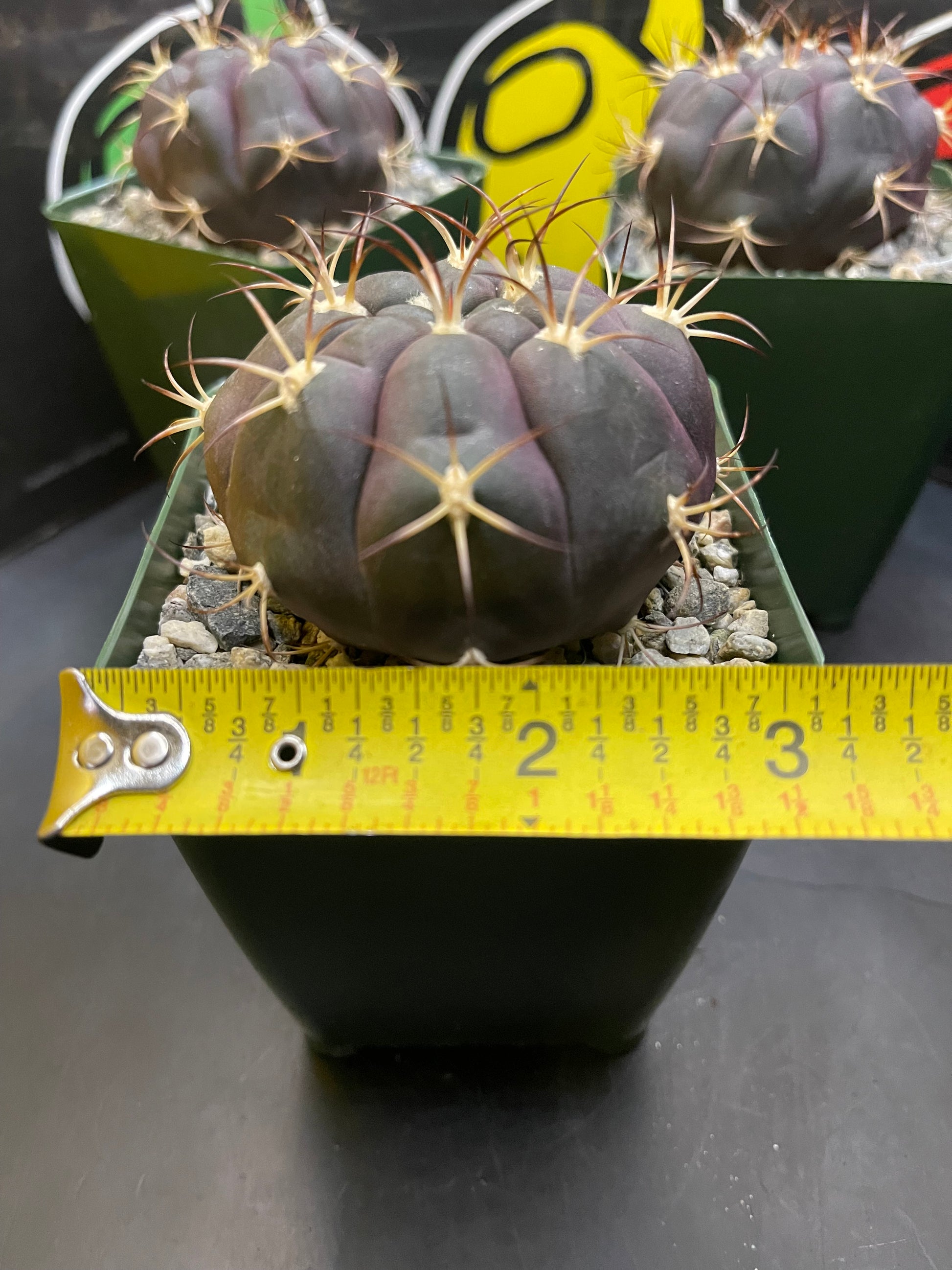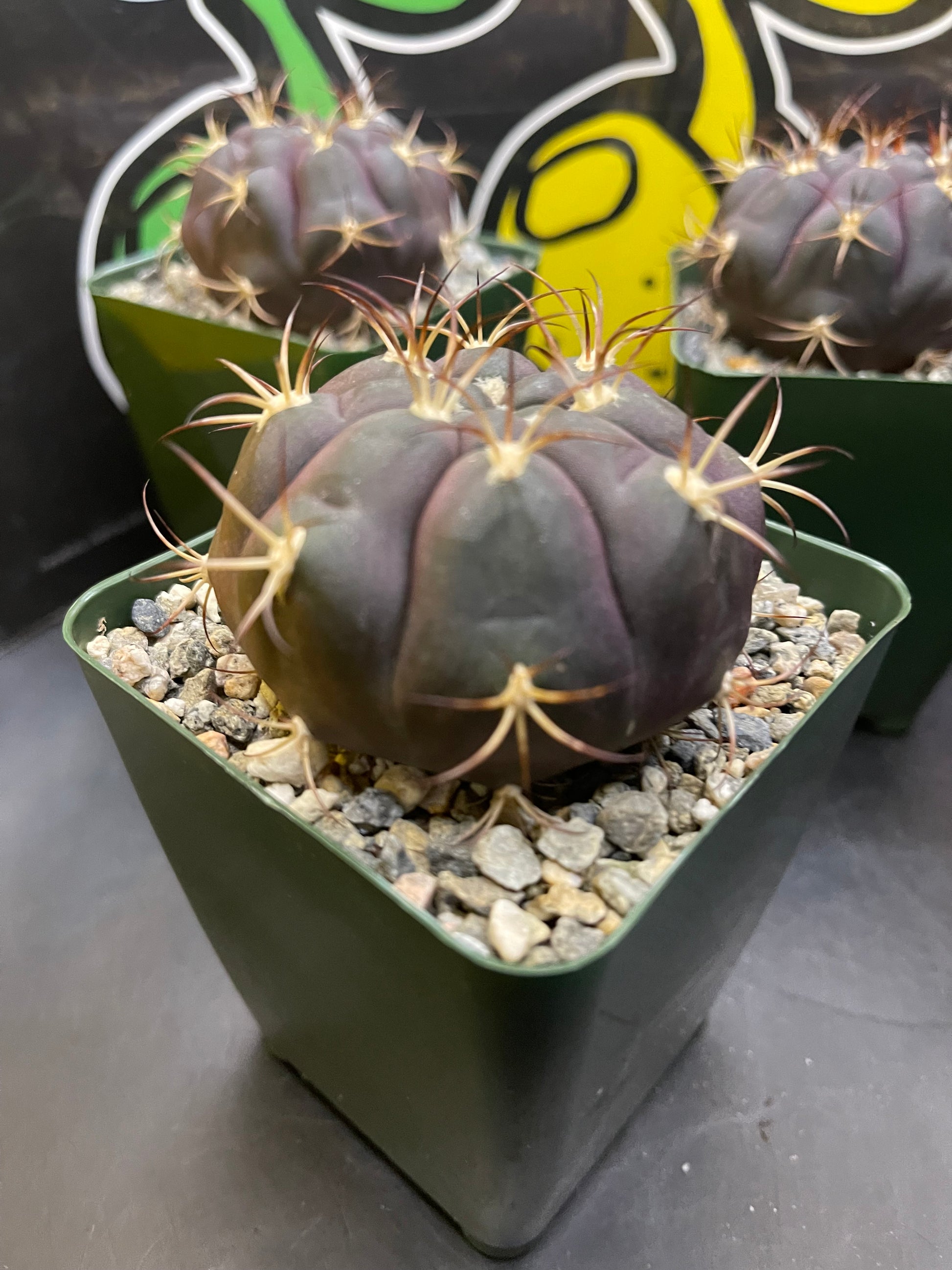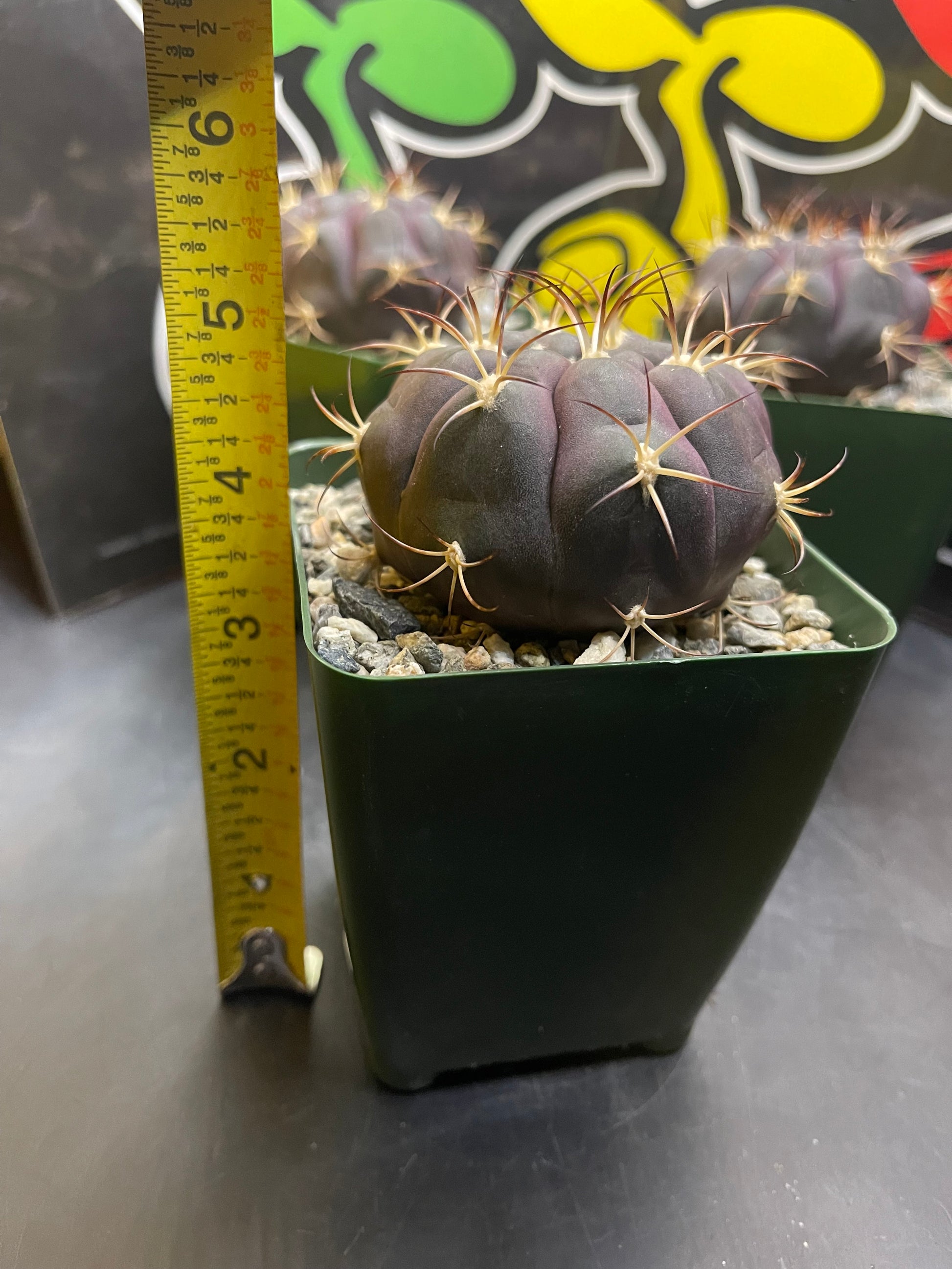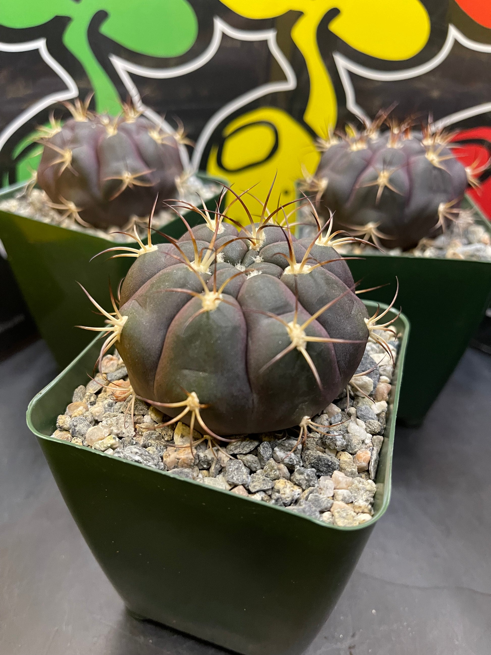 Great for in the home or on the patio! These cactus stay relatively small and are very enjoyable to grow ! The white , red and black spines give a vivid contrast against its velvety purple flesh ! These are planted in a well draining cactus mix and come shipped to you in the pot ! They will do fine in there pot for awhile and would also grow and bloom in a new decritive container !! The botanical Latin name of this cactus is “Gymnocalycium pflanzii albipulpa” and it’s lovingly referred to as a “purple gymno” !