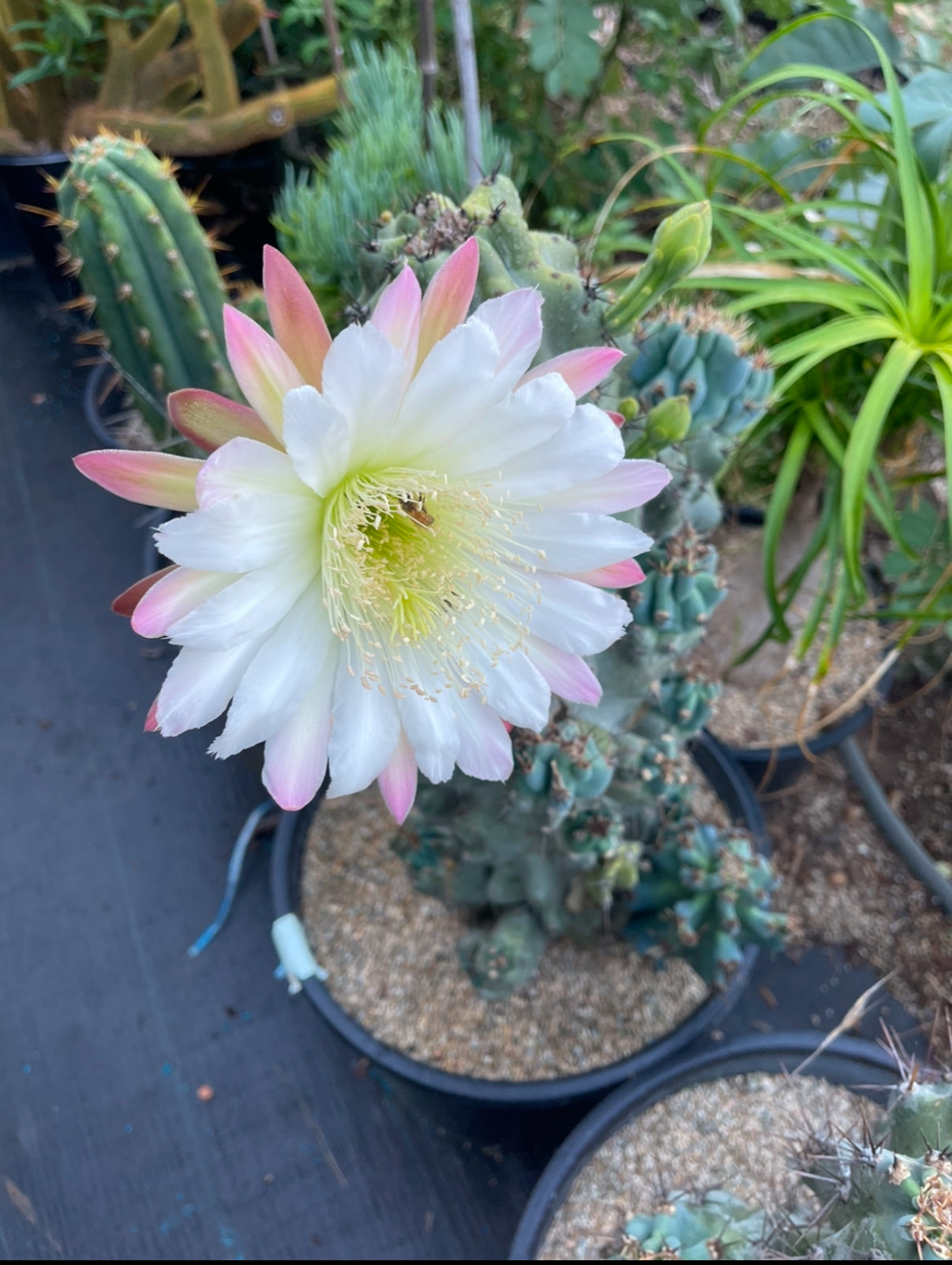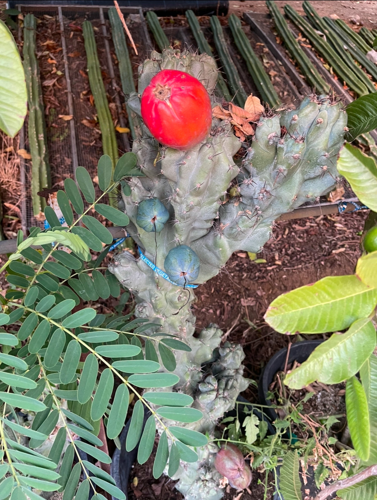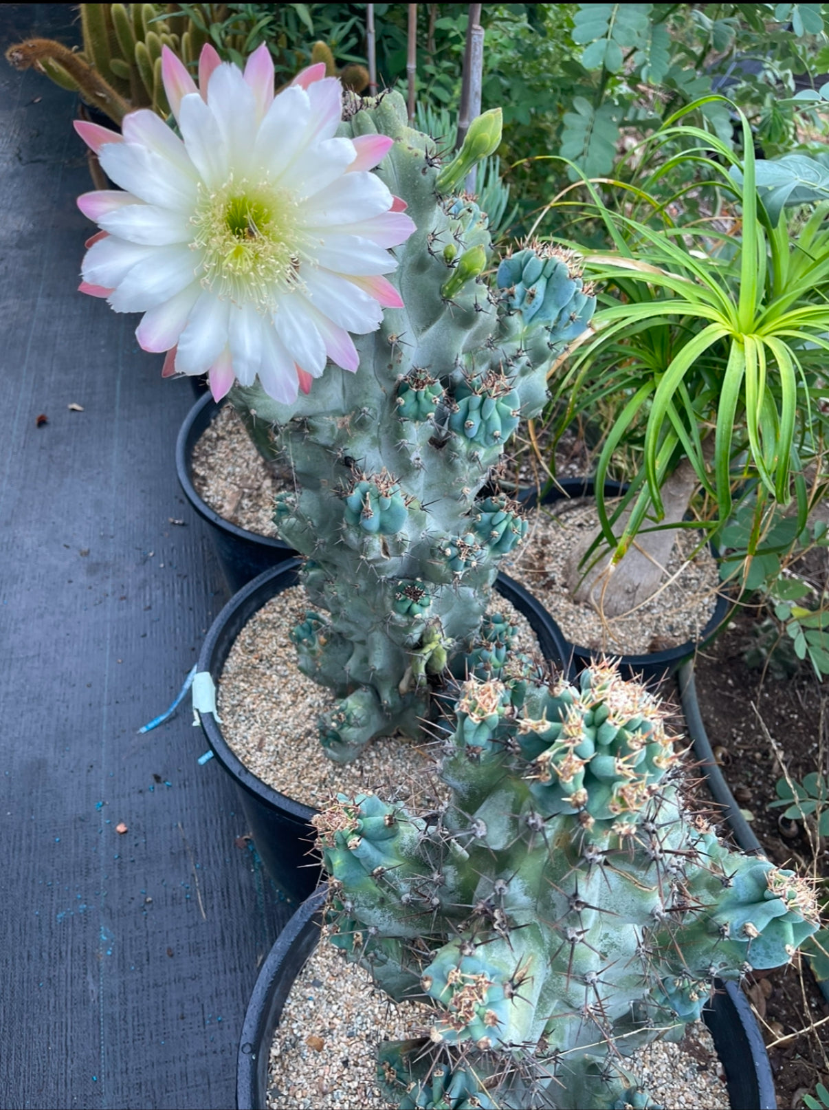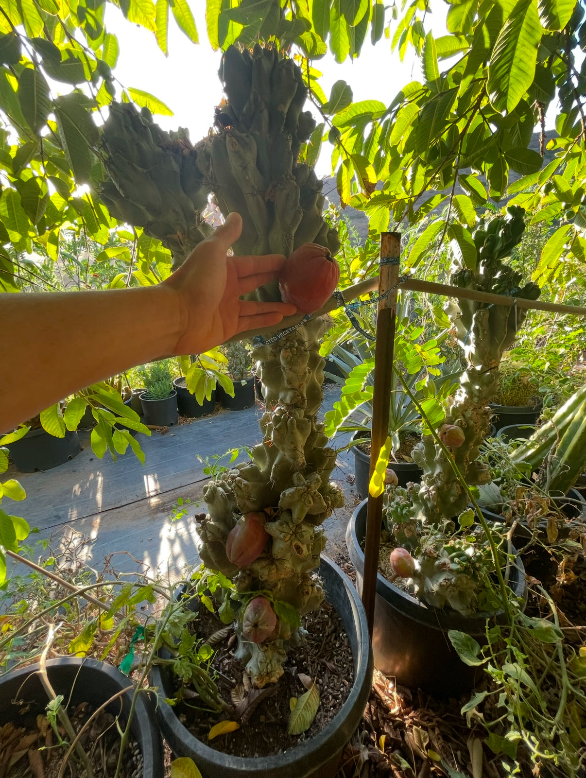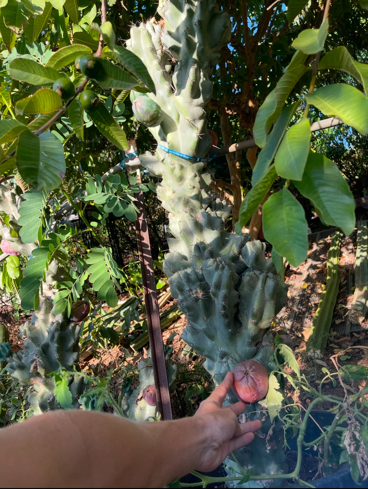 Produces an edible fruit at a very young age - very fragrant with delicious texture! Very easy to grow , gets a beautiful flower with pink outer petal and a white center face ! This flower gets HUGE ! The fruit is also quite large , earning its common name of the cactus apple , fruits are completely thornless with absolutely no prickers ! Actual cutting is pictured $ the other photos of larger stands are just examples of how it will grow