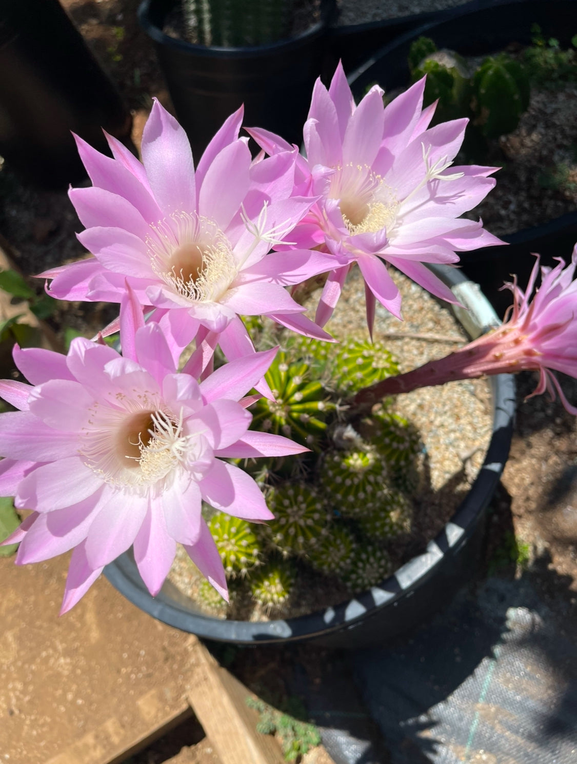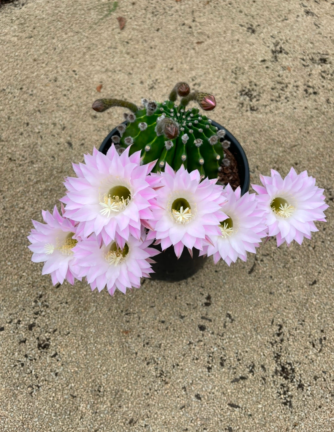 I will cut these fresh for your order- if you order 3 or more I’ll include a larger one ! These bloom young ! Their flowers are a beautiful pink with a white center , the blossoms are larger than the cactus itself!!!! Awesome cactus , very easy to care for , makes for a perfect patio container plant. I personally love these because they propagate so easily, they pup profusely and you can pop em off and repot them -Great nursery plant for potting and reselling !