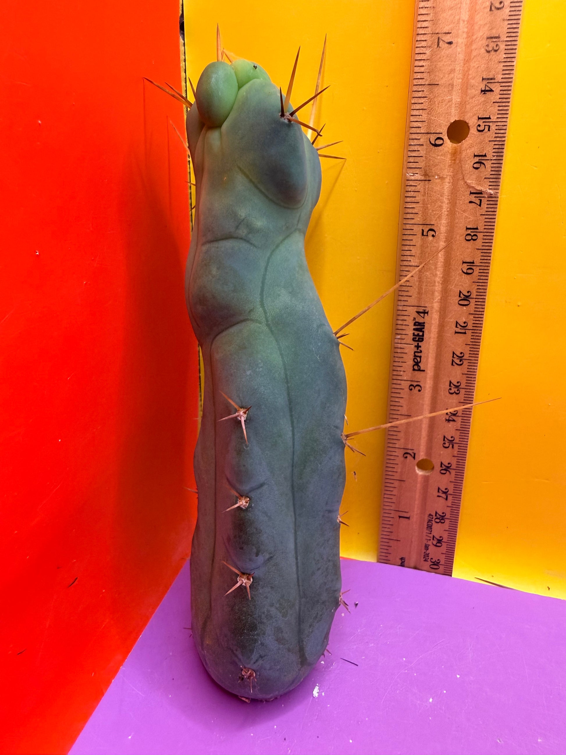 When grafted it grows much faster . Grafts can sometimes revert to 5 ribs looking more normal for a bit , spines on these can be long and spine length can be influenced by increased heat . After pupping on grafts & At about 6-7” of growth it often gets 2 fang like spines and then goes 2 ribbed before terminating then quickly pupping from the tip , giving its a stacked TBM look .