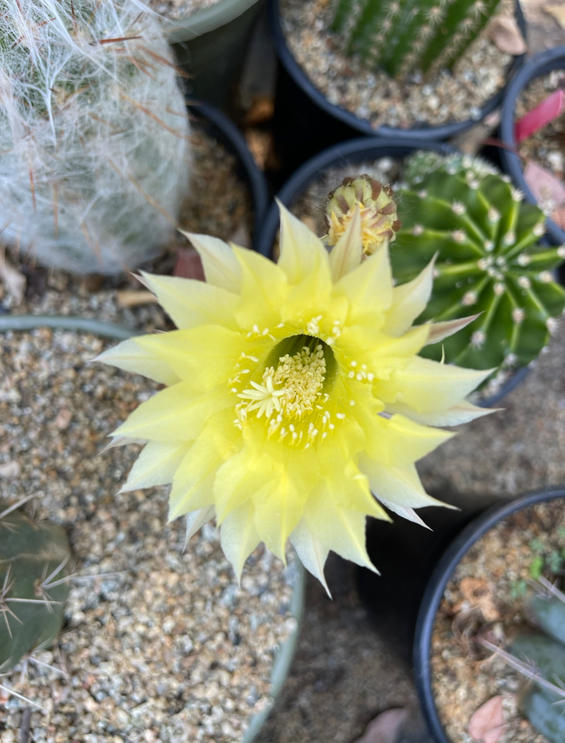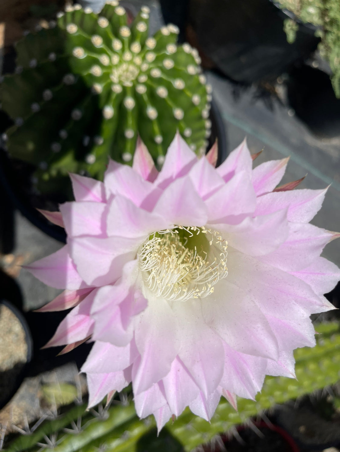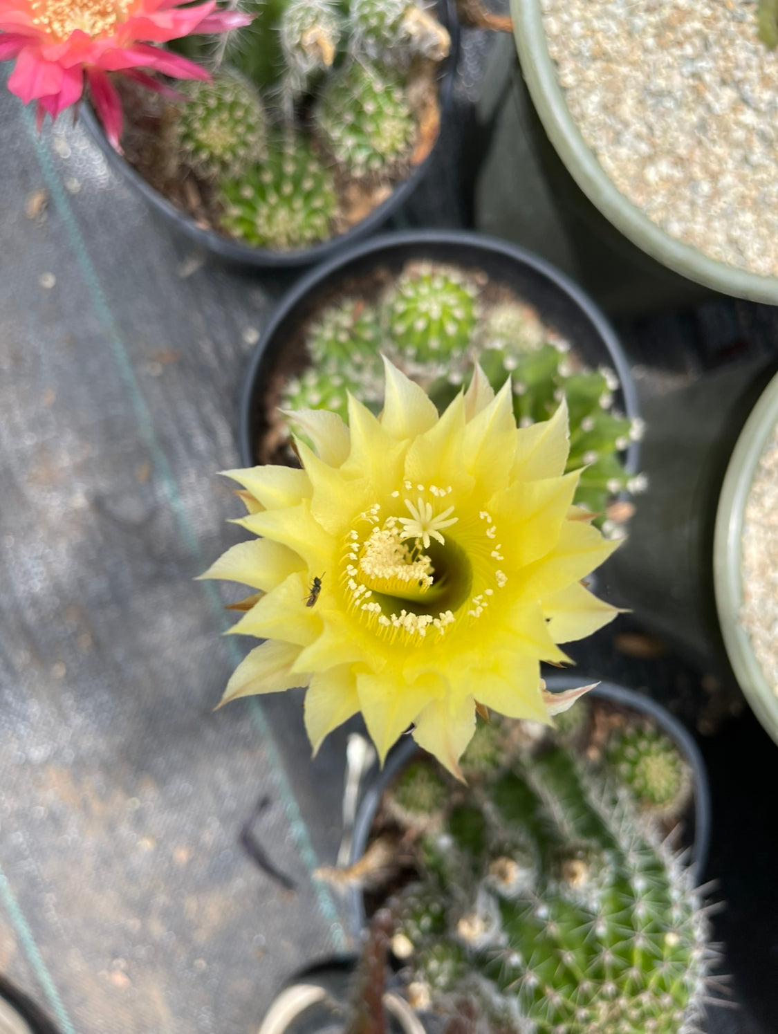 Gets a huge, beautiful flower(up to a foot long!) can be crossed pollinated with Trichocereus ! This will grow big and round like a barrel cactus and produce pups of its own around its base. These bloom profusely and guess what …….. it’s a surprise surprise because even I don’t remember if these are yellow or pink!!!!