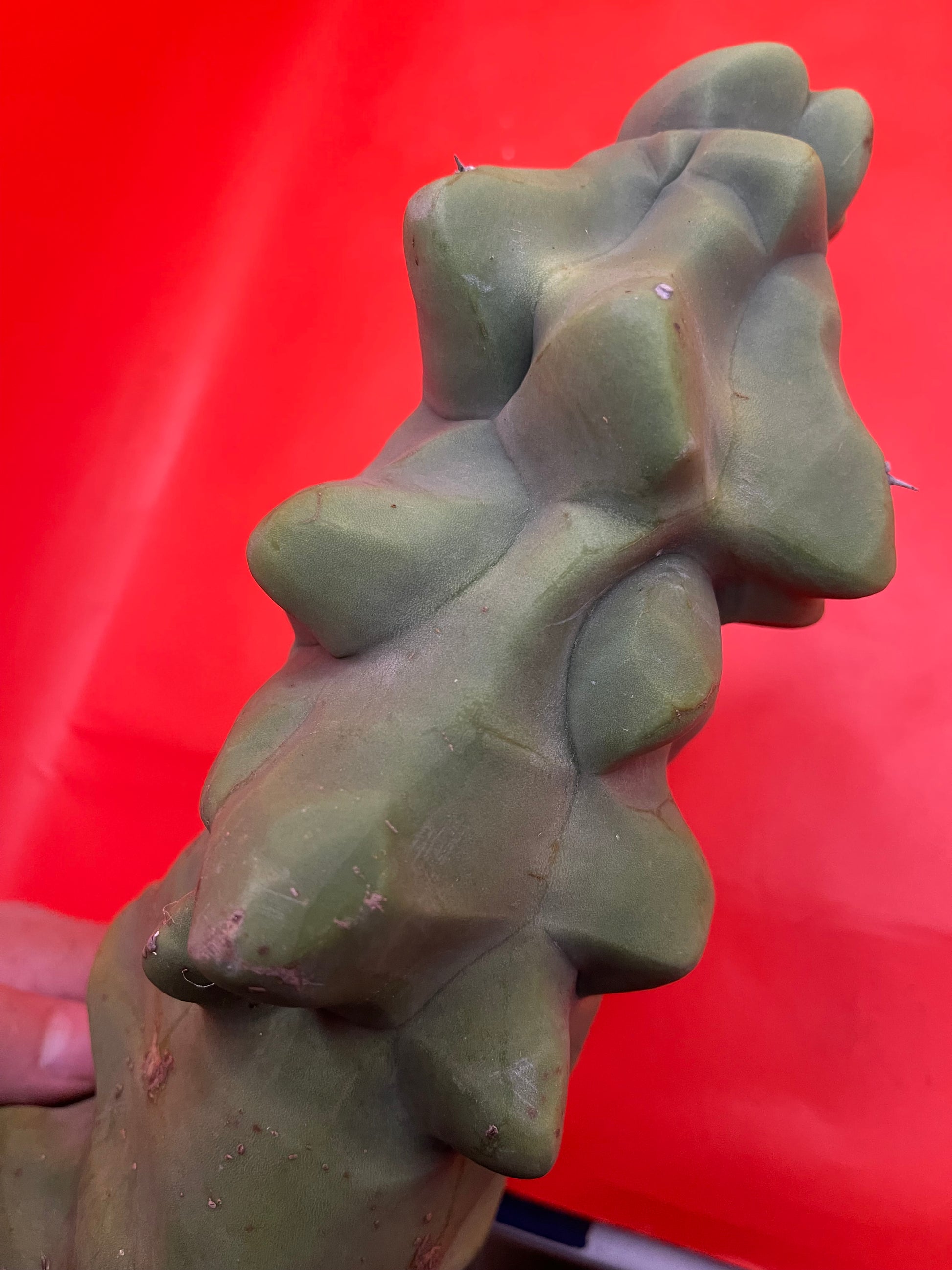 This is the Fat form totem pole cactus ! It grows very strange ,smooth , spineless growth with bumps ridges and nobs ! It is extremely drought tolerant and takes the full sun very well . This cactus does great in the heat and looks as if it belongs in Dr. Seuss’s garden !