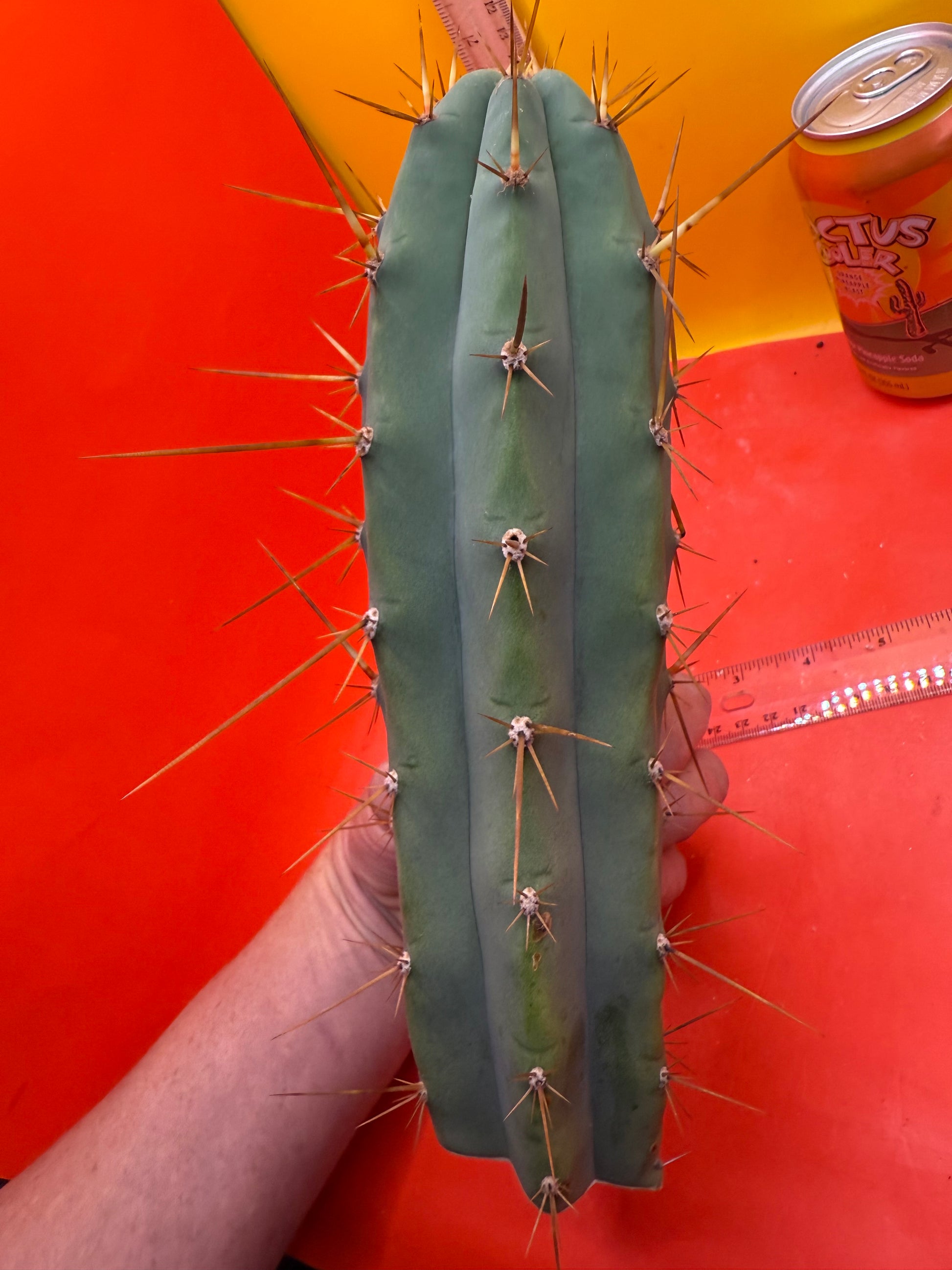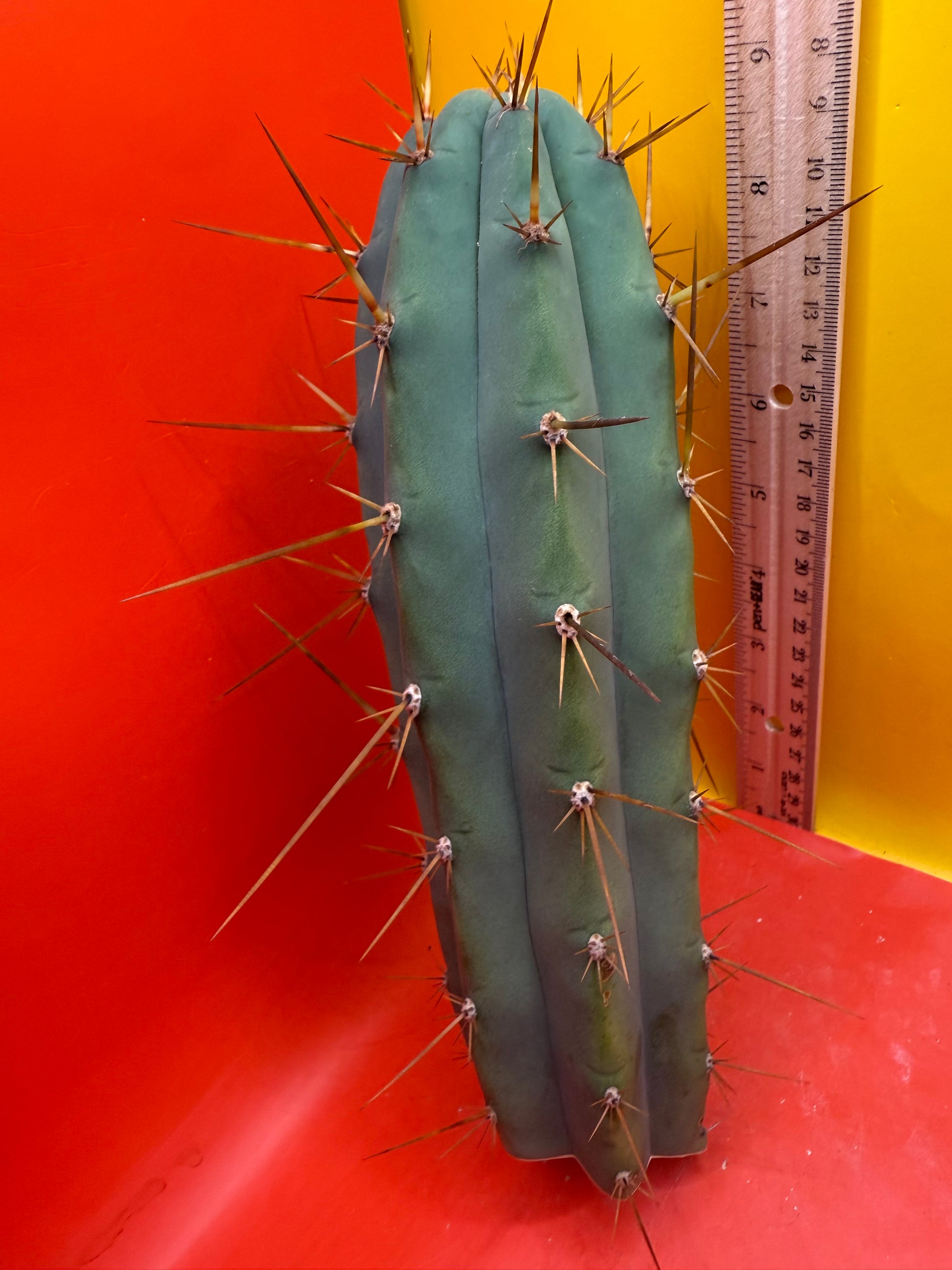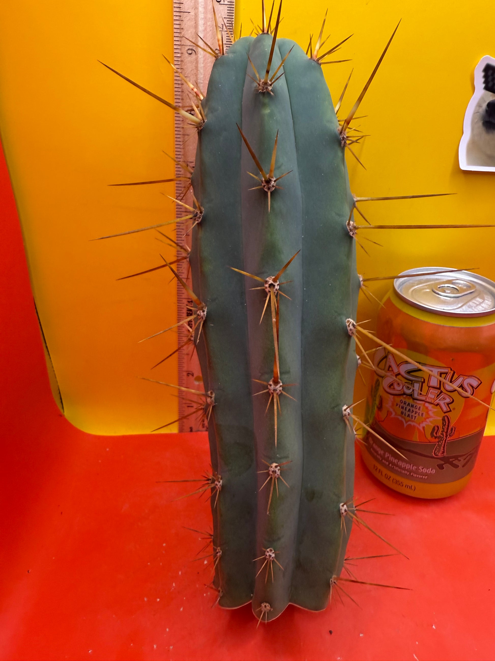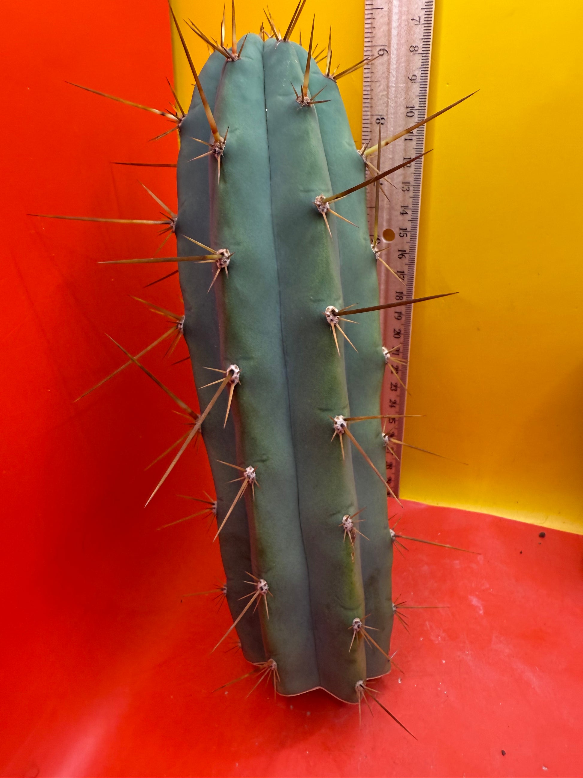 This is a hybrid between trichocereus peruvianus and trichocereus cuzcoensis , very cool cultivar with extremely long spines ! The spines have multiple colors ranging from red , orange , yellow , gold to black . The skin is vary glaucous with an aquamarine color . The notches touch each areole and it has a bit of a sawtooth pattern edge