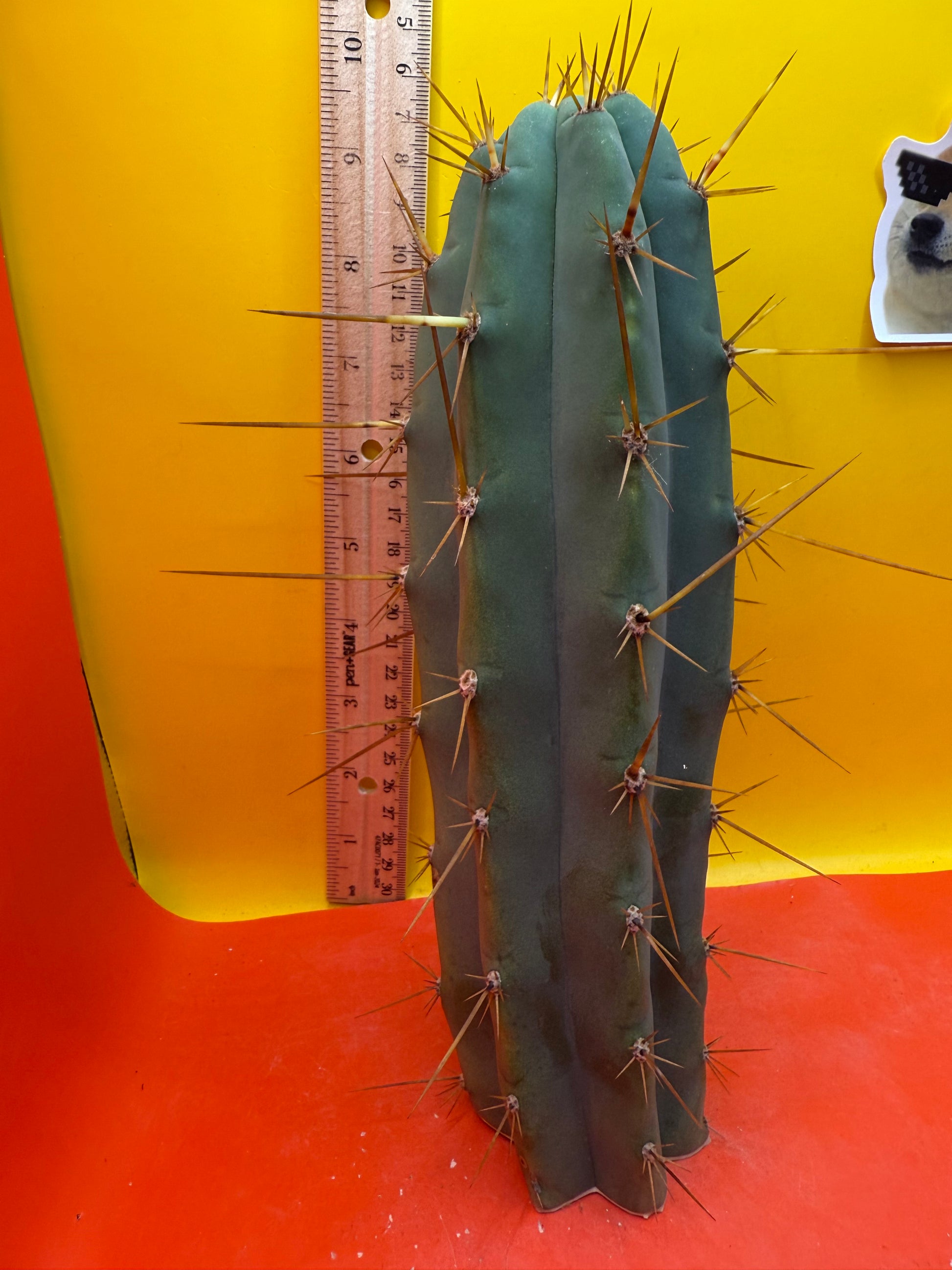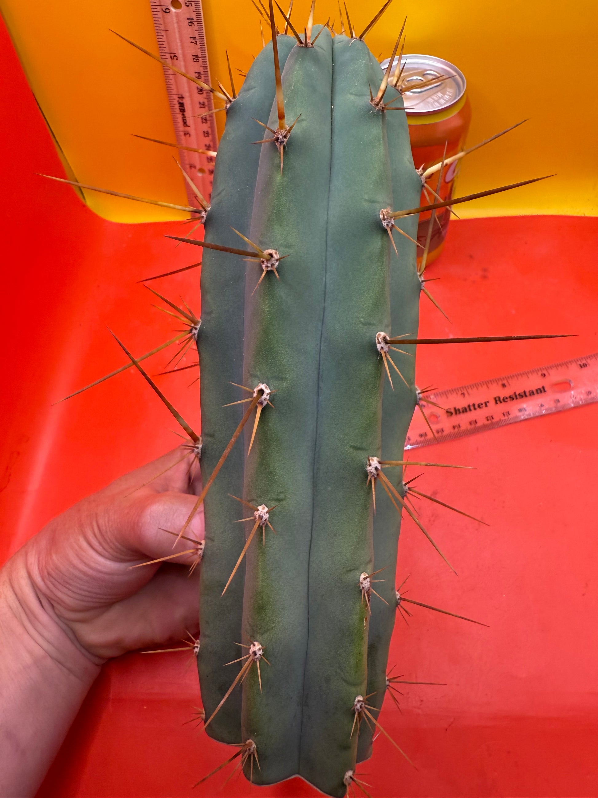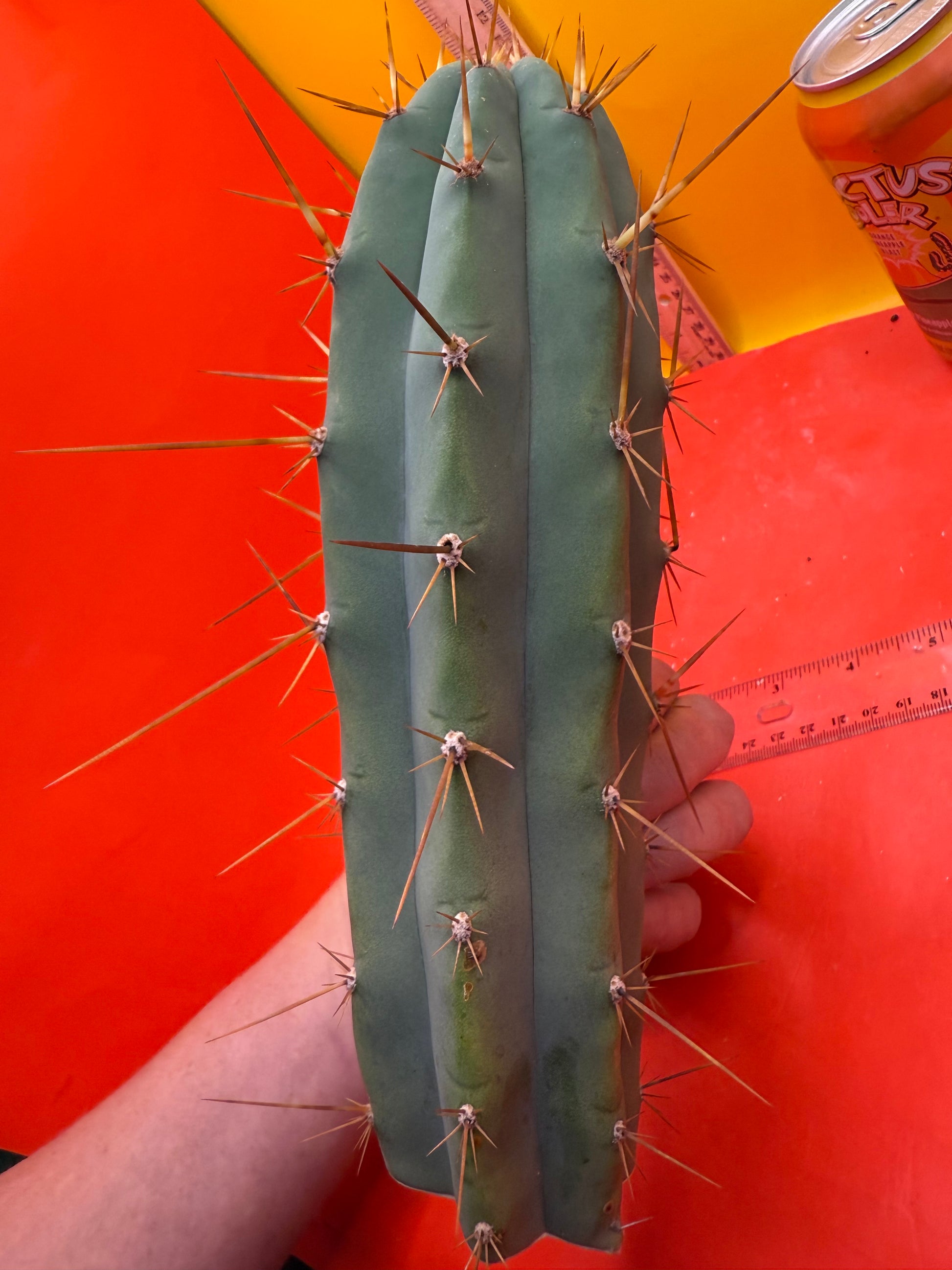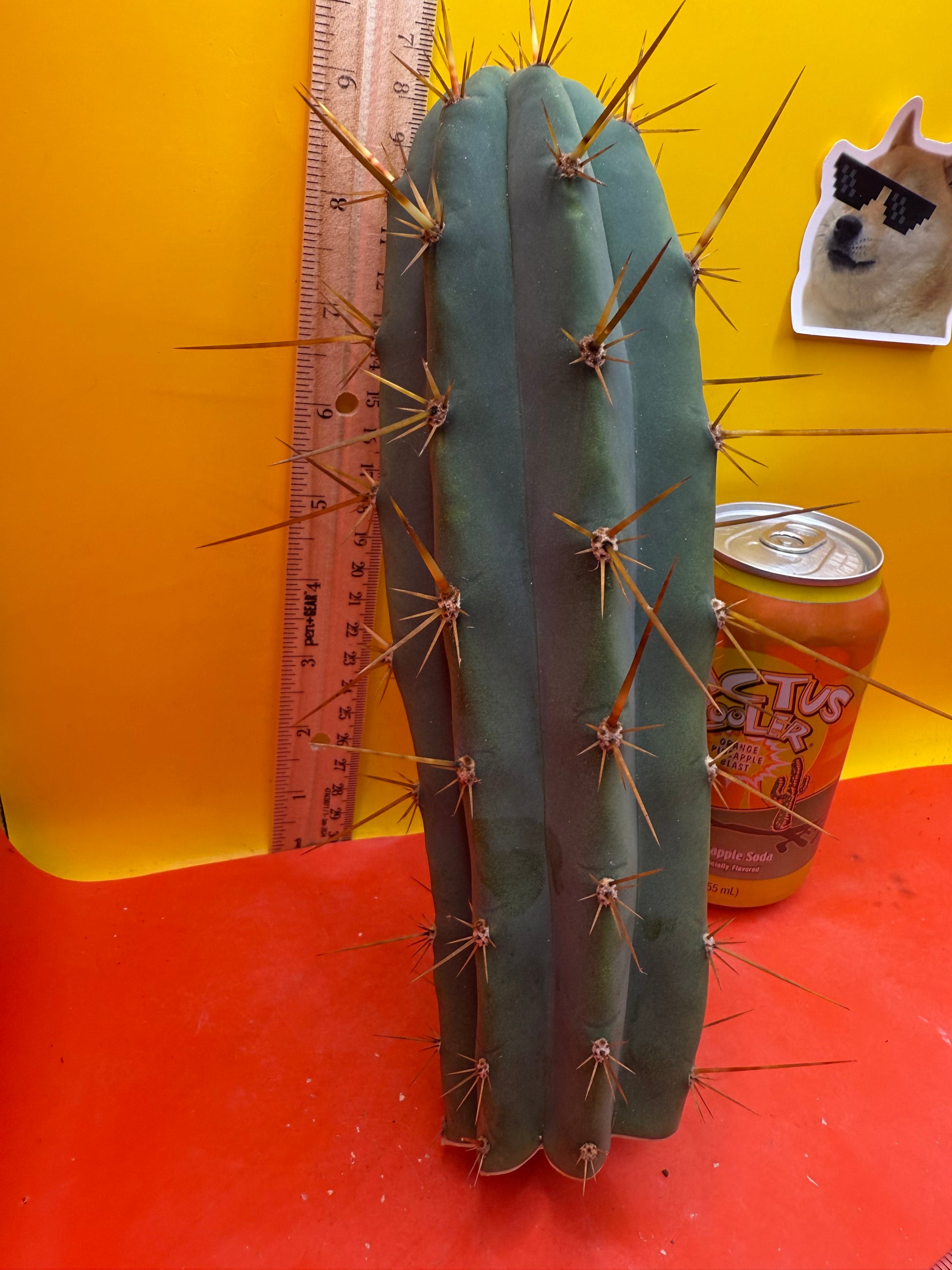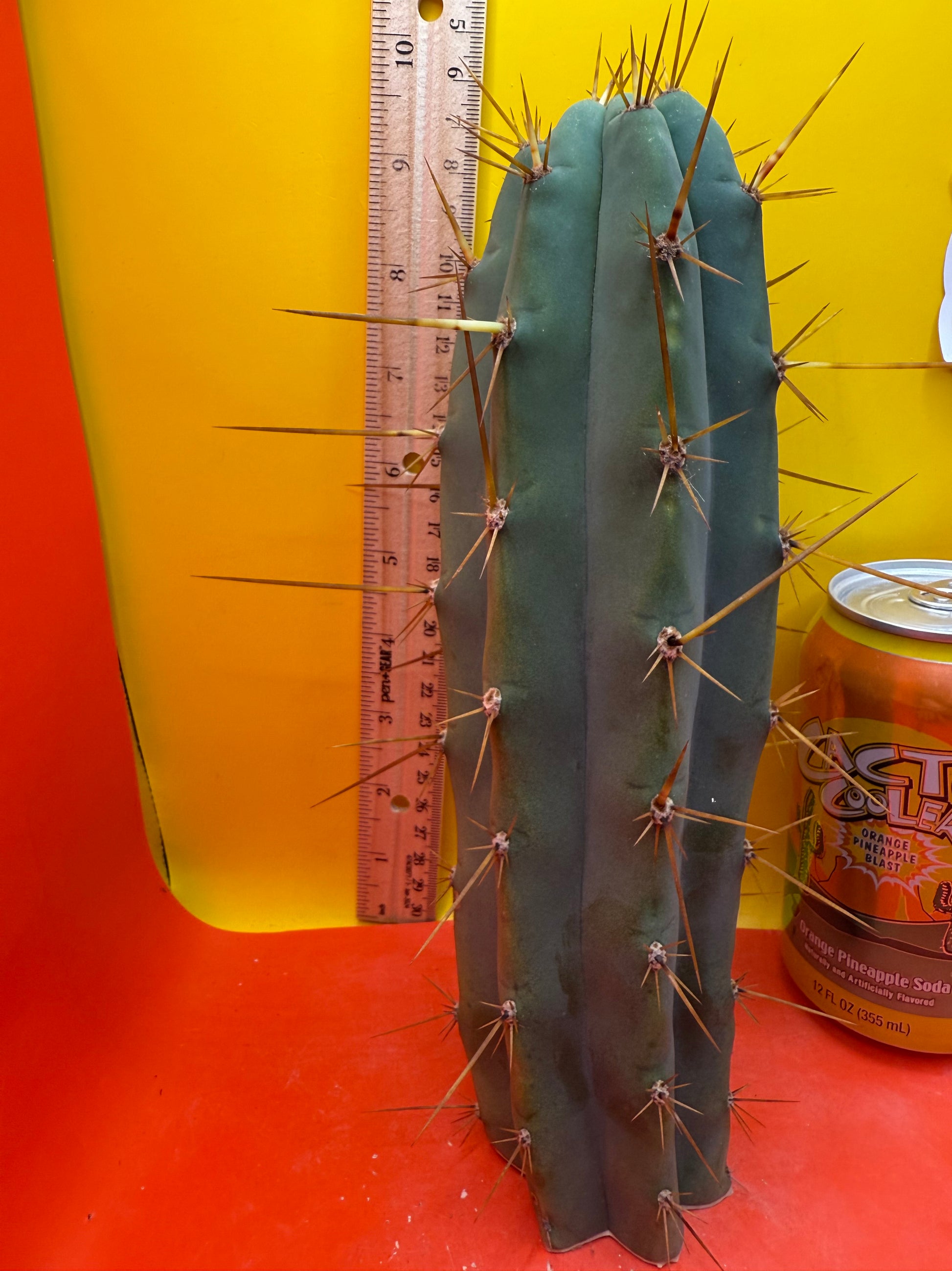This is a hybrid between trichocereus peruvianus and trichocereus cuzcoensis , very cool cultivar with extremely long spines ! The spines have multiple colors ranging from red , orange , yellow , gold to black . The skin is vary glaucous with an aquamarine color . The notches touch each areole and it has a bit of a sawtooth pattern edge