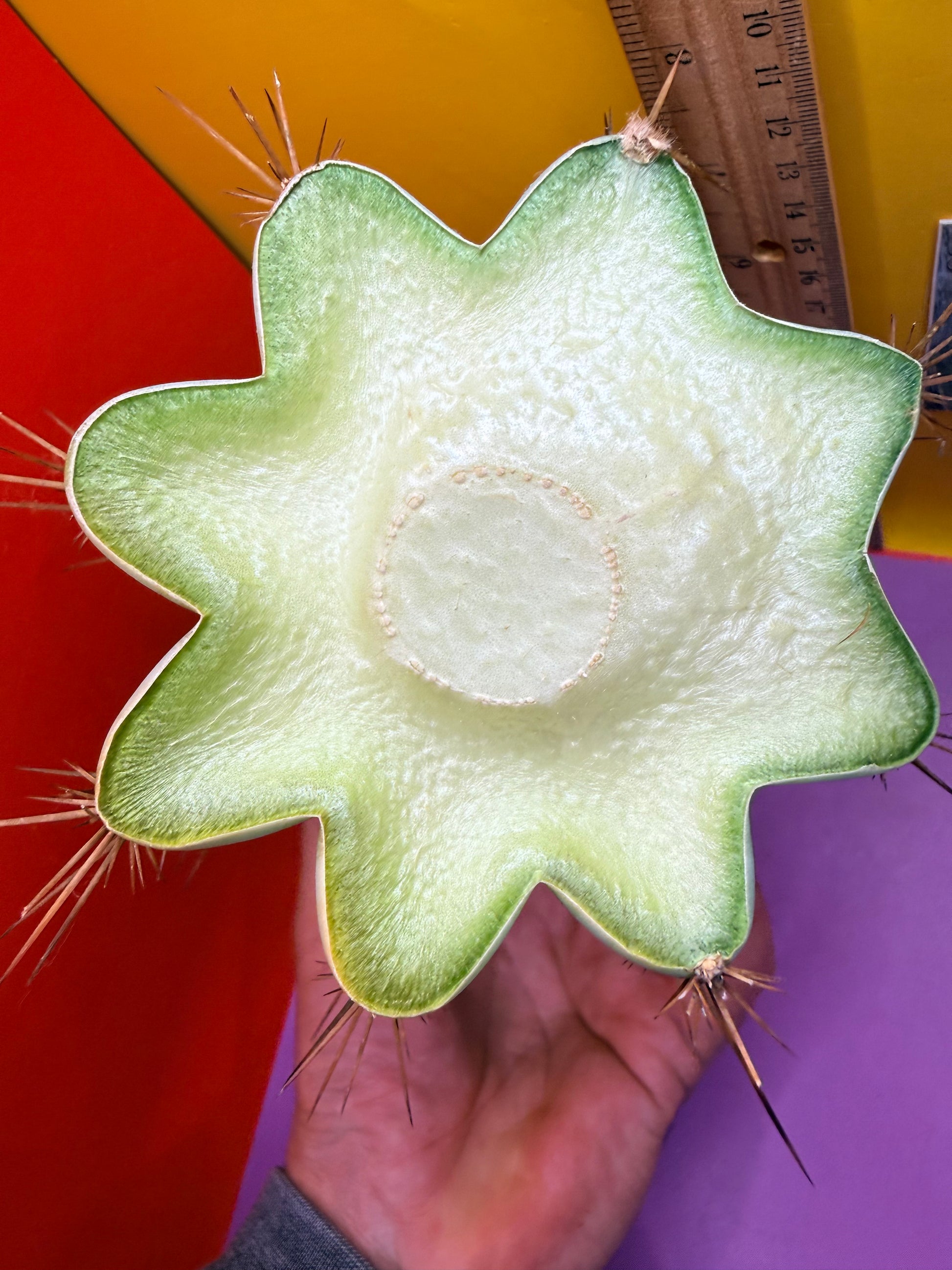 You will receive an extremely similar cutting to the one pictured , over 3” thick with a perfect tip ! the ruler is one foot and the soda can is for size reference, all sides of this cactus are pictured and it has a healthy tip . This is grown by me and I cut it clean , it has a perfect callous that is ready to be shipped to you and you can plant it whenever you are ready after receiving it ! This will root fast and grow quickly