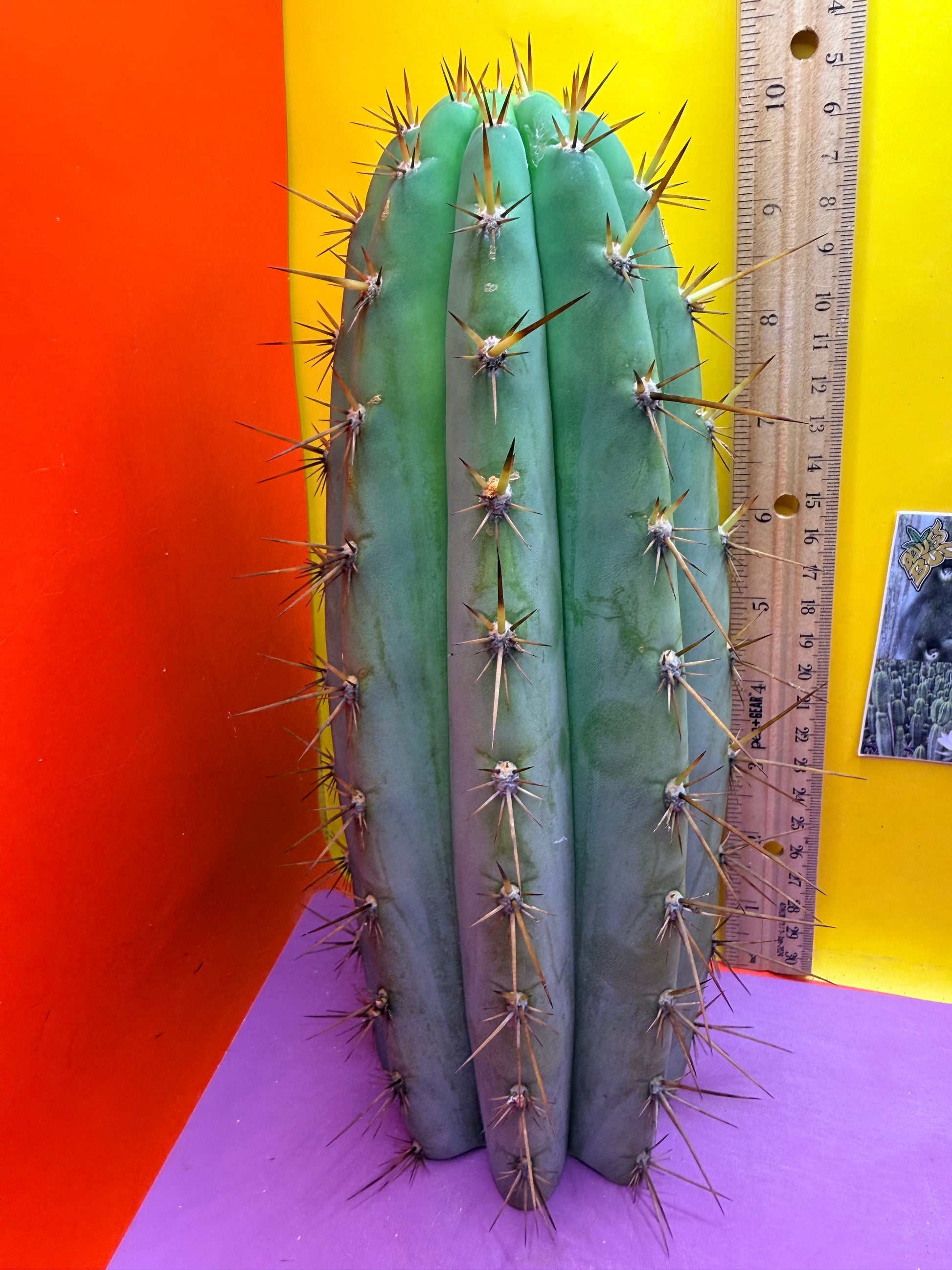 Deep blue , Trichocereus peruvianus/Macrogonus! One of the original field collected landrace Trichocereus macrogonus from peru to be Released into the cactus community in the 1960’s ! This cactus stays blue in color with red spines that fade to black and then become silver and gold with age . In full sun it gets light blue with a powdery skin . In shade or filtered light it grows extremely blue , a bit less glaucous . When grown in the heat the spines grow extremely long , reaching over 3” in length!!! This cactus grows fat and gets a very thick trunk , often branching and producing basal pups !