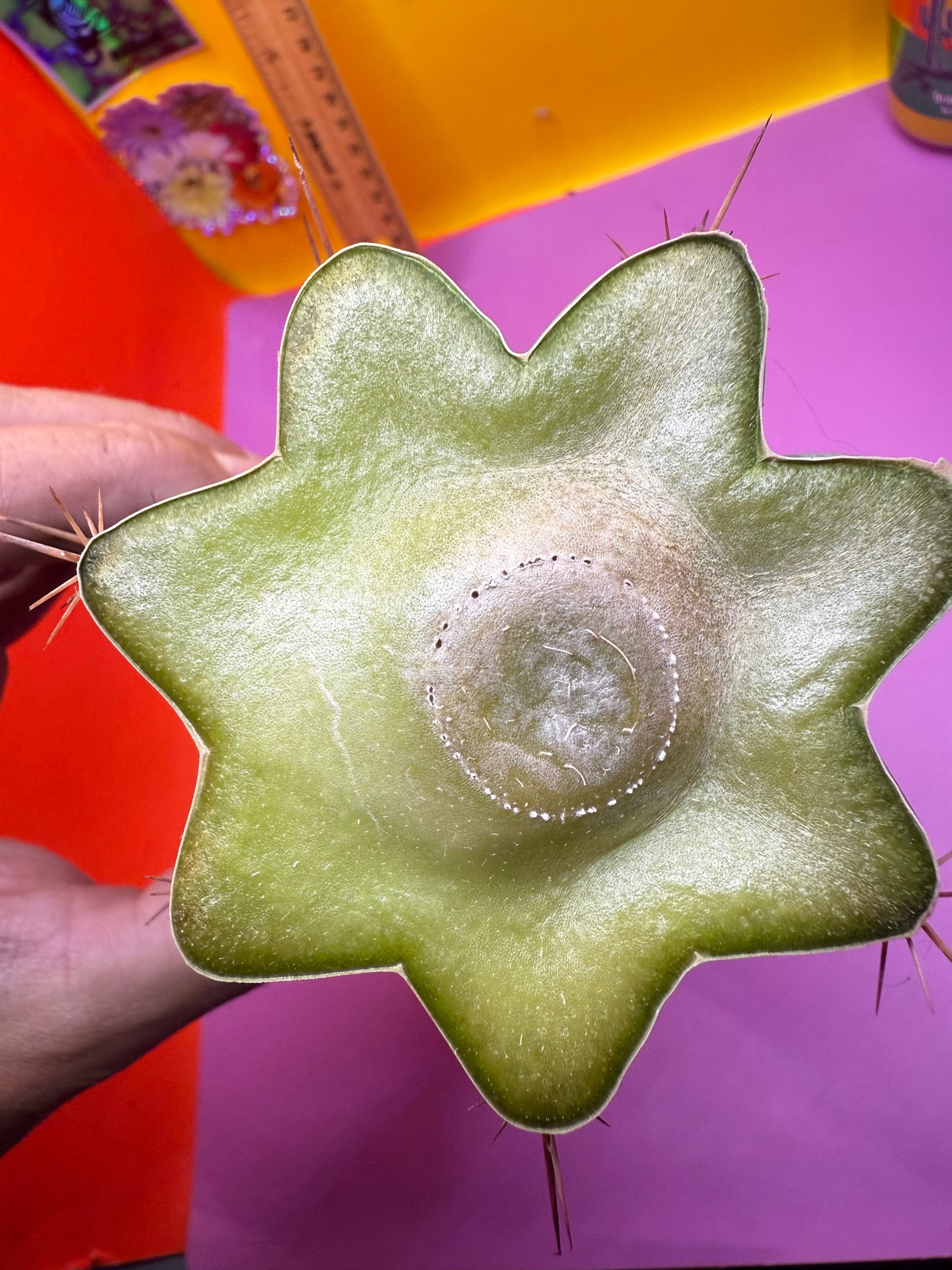 This is a seed grown Trichocereus cultivar . Beautiful blue farina , very interesting notches that rest high above each areole . You will receive this exact cutting , it is cut clean with no major blemishes and it is calloused and ready to plant . This ships out fast and arrives quick !