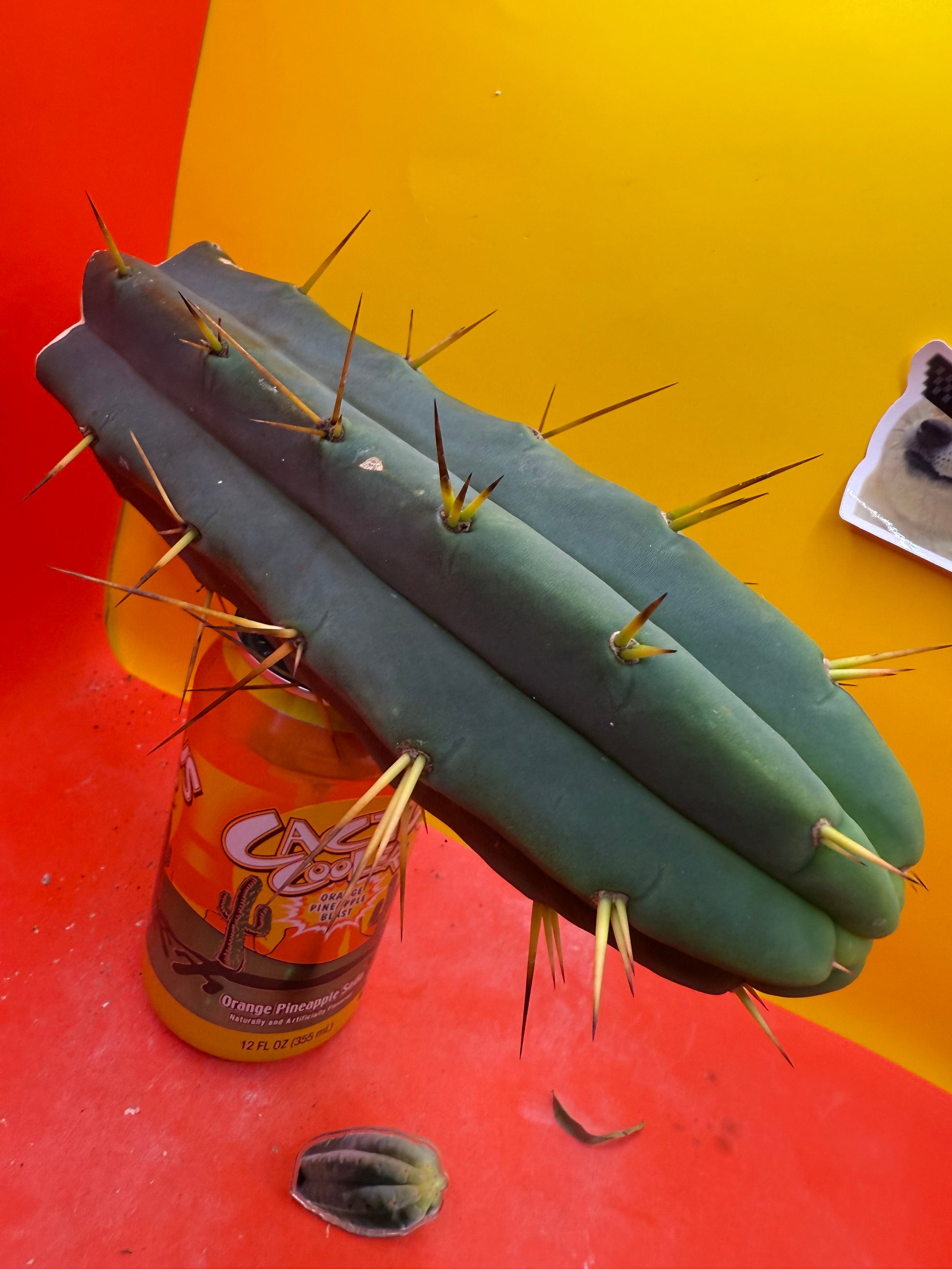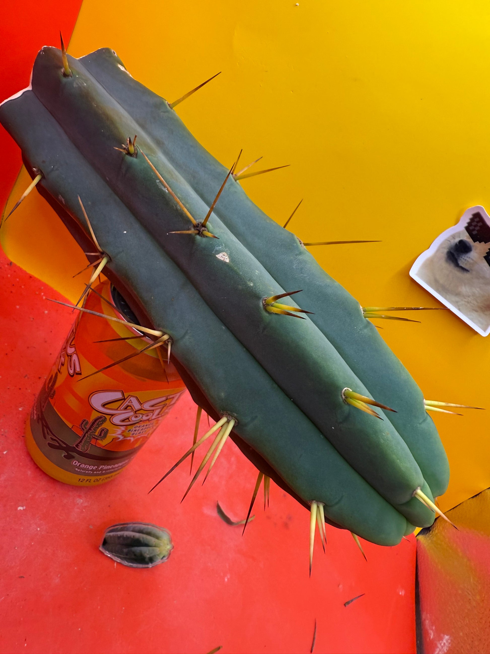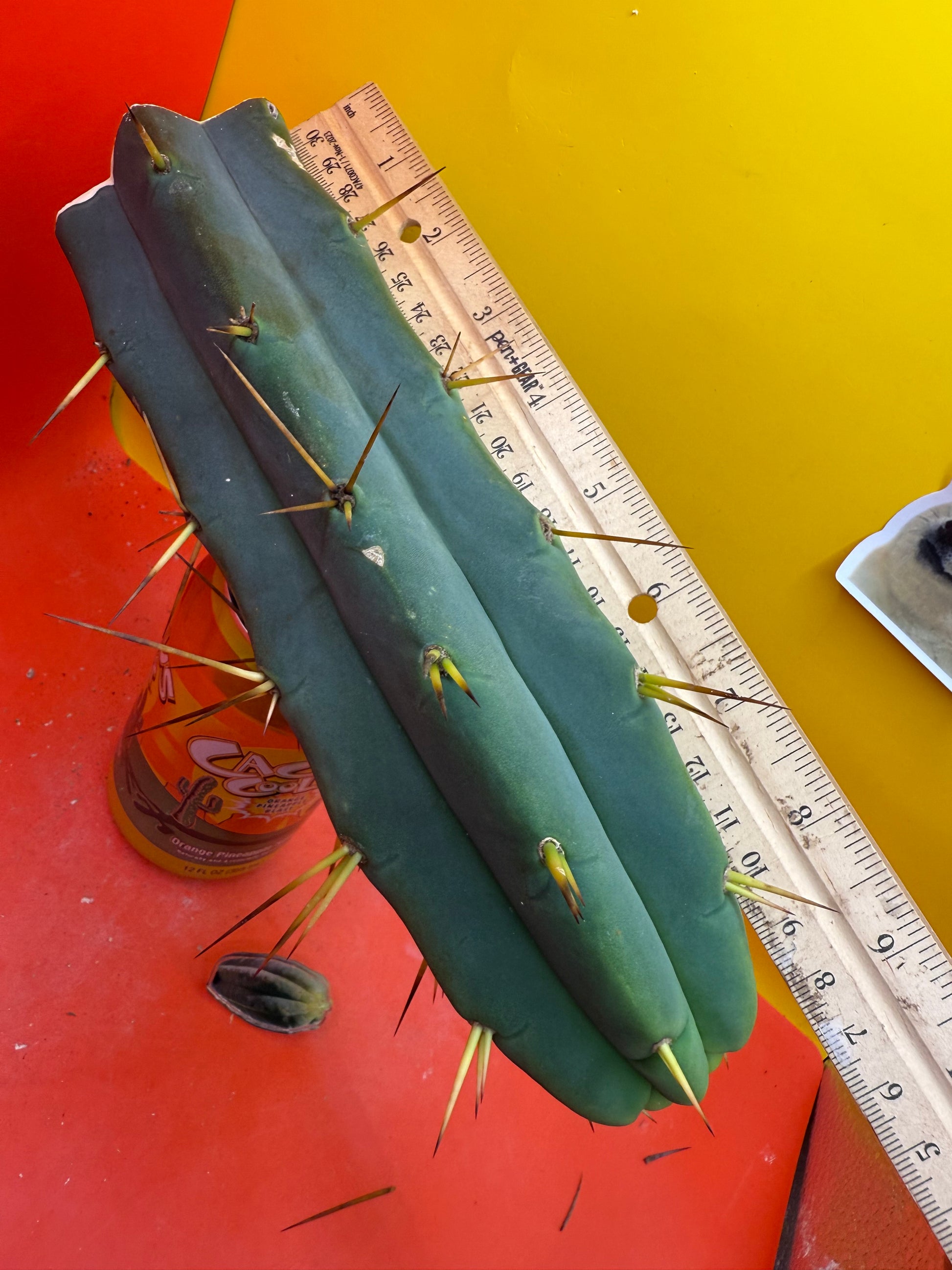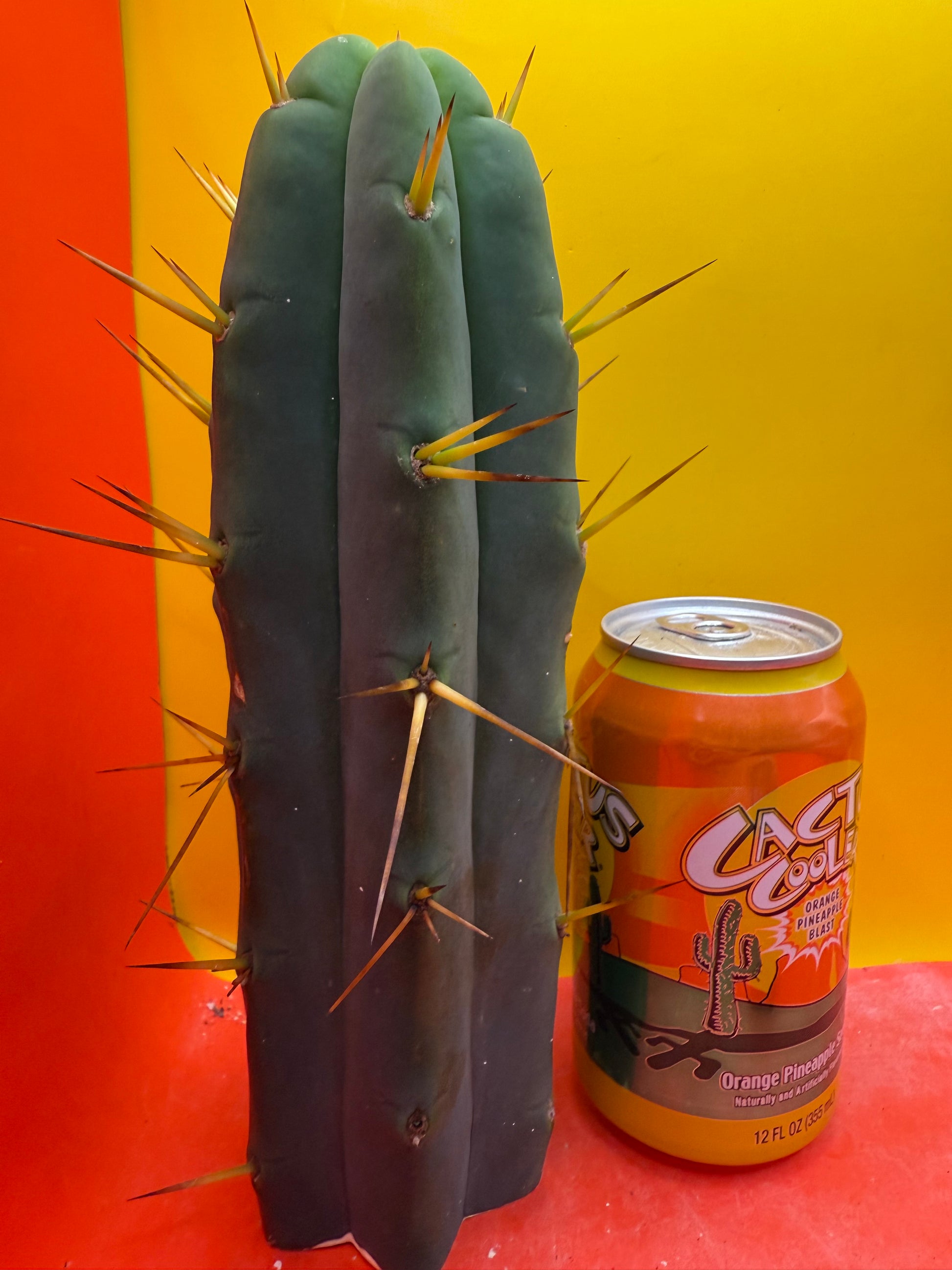 Trichocereus Bridgesii ! You will receive this exact cutting ! It’s ready to plant and very healthy. This cactus cultivar tends to easily drop and shed its spines , it can grow as a “Bald” cacti quite easily. Brilliant yellow spines give a magnificent contrast against its aquamarine turquoise flesh ! Great color on this , very Vivid !! 😵💫