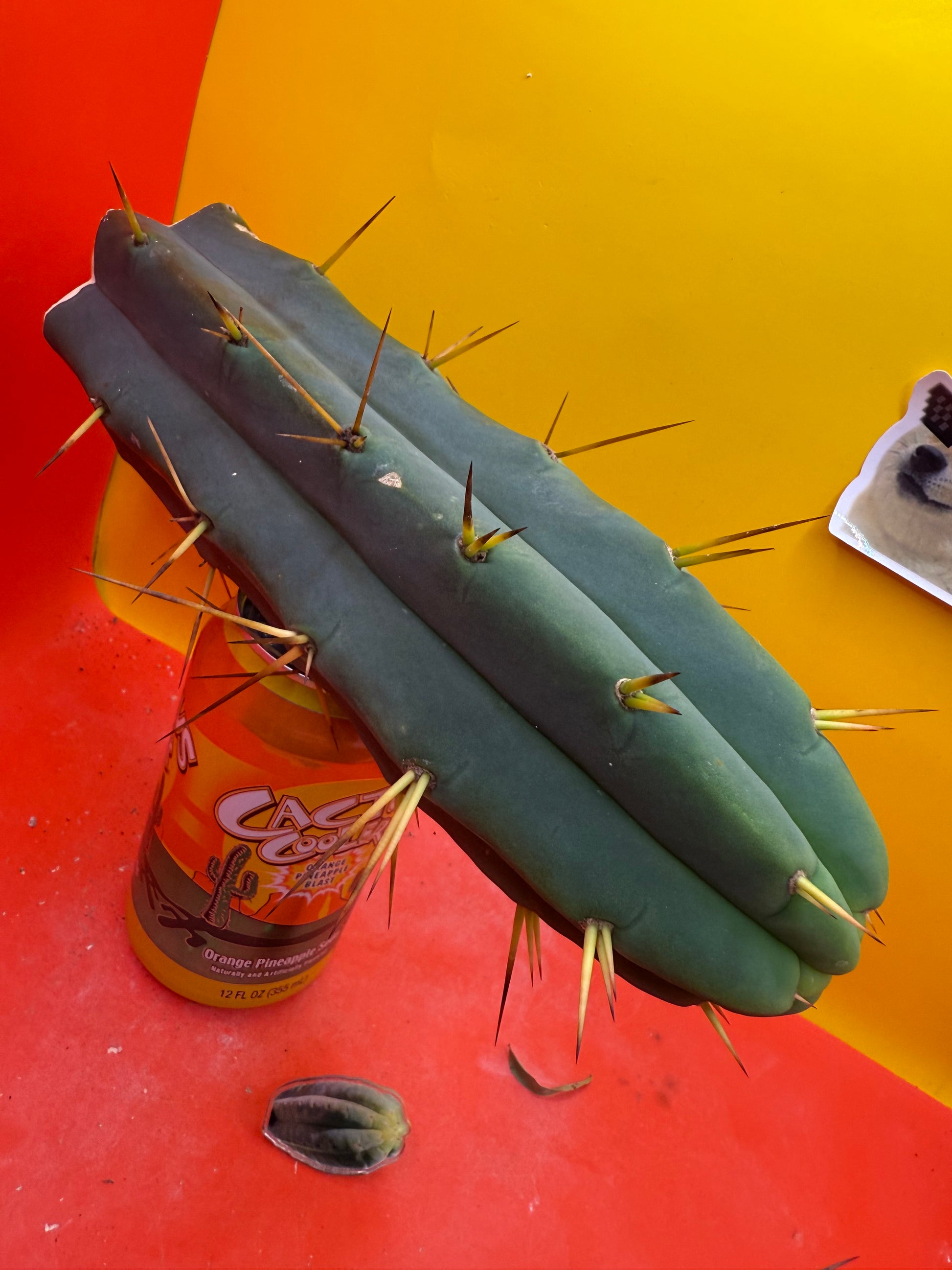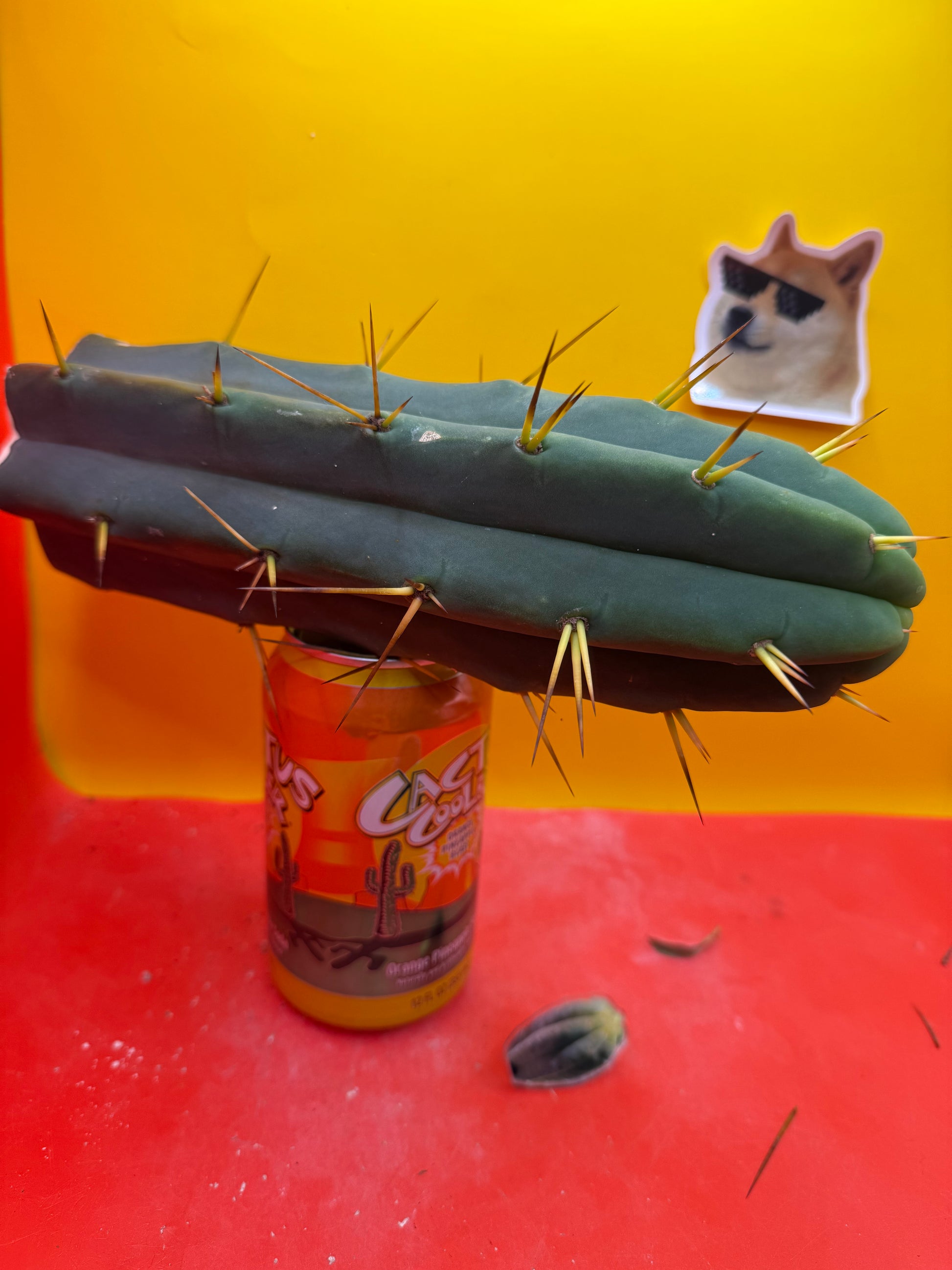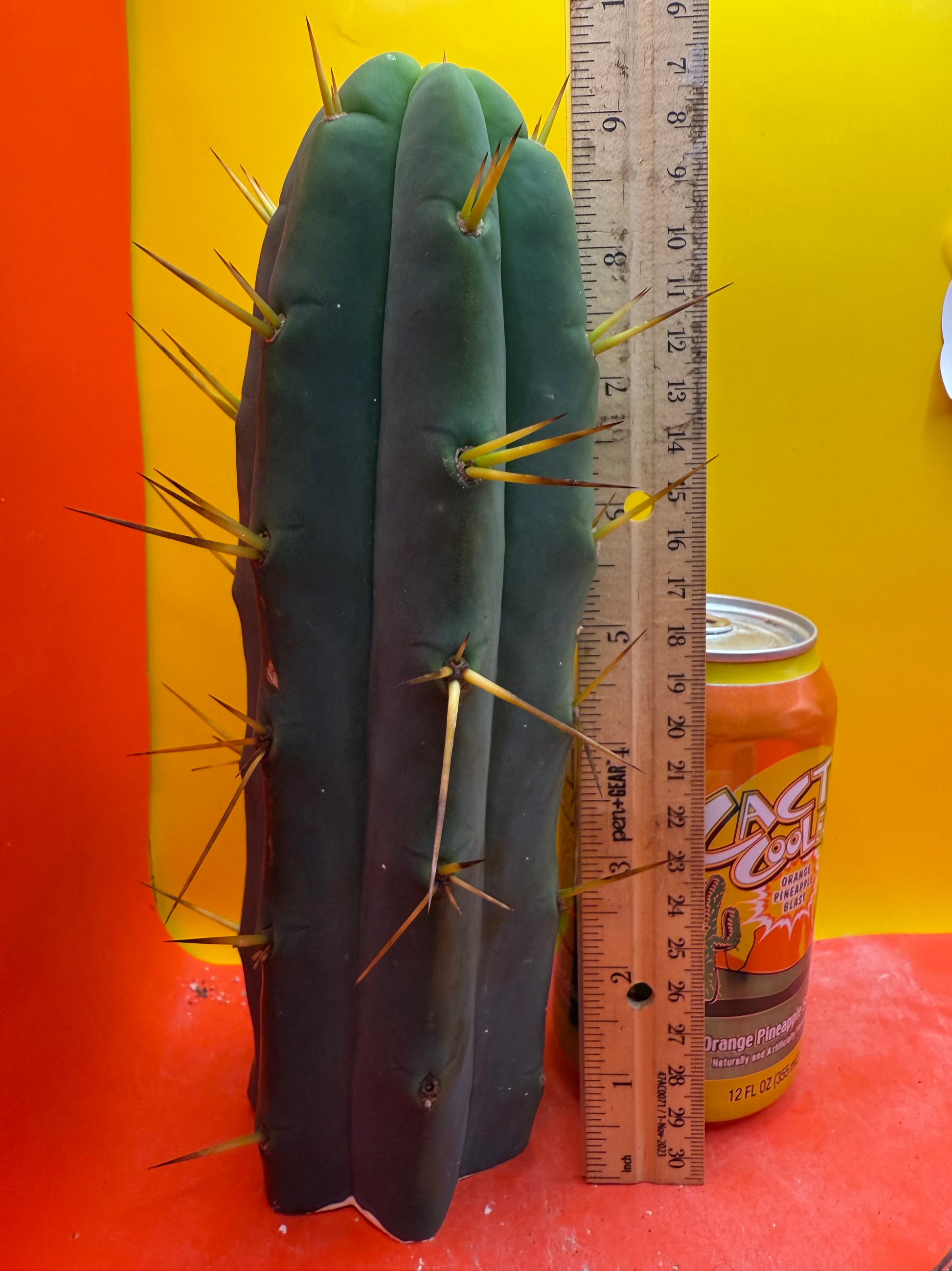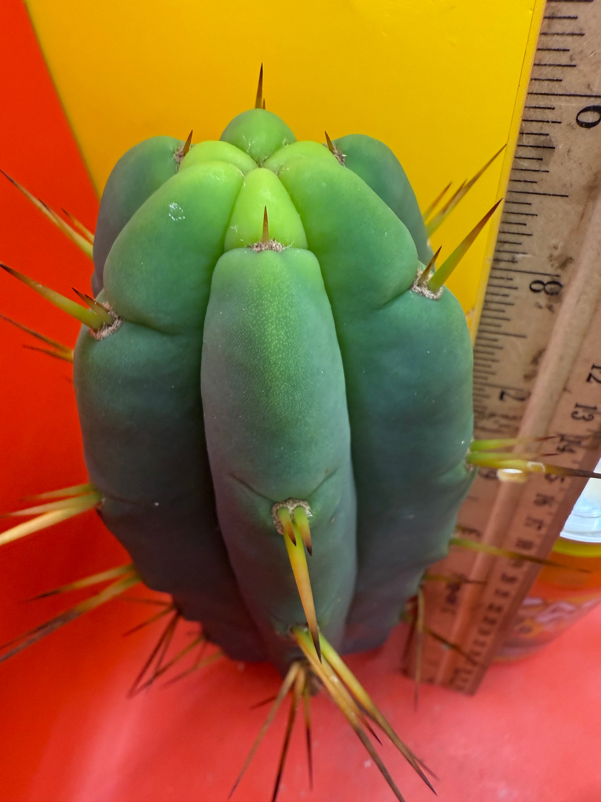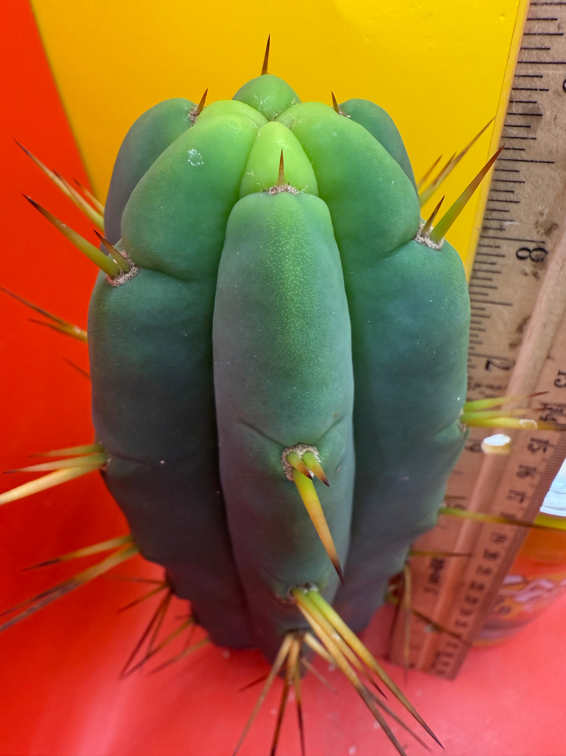 Trichocereus Bridgesii ! You will receive this exact cutting ! It’s ready to plant and very healthy. This cactus cultivar tends to easily drop and shed its spines , it can grow as a “Bald” cacti quite easily. Brilliant yellow spines give a magnificent contrast against its aquamarine turquoise flesh ! Great color on this , very Vivid !! 😵💫