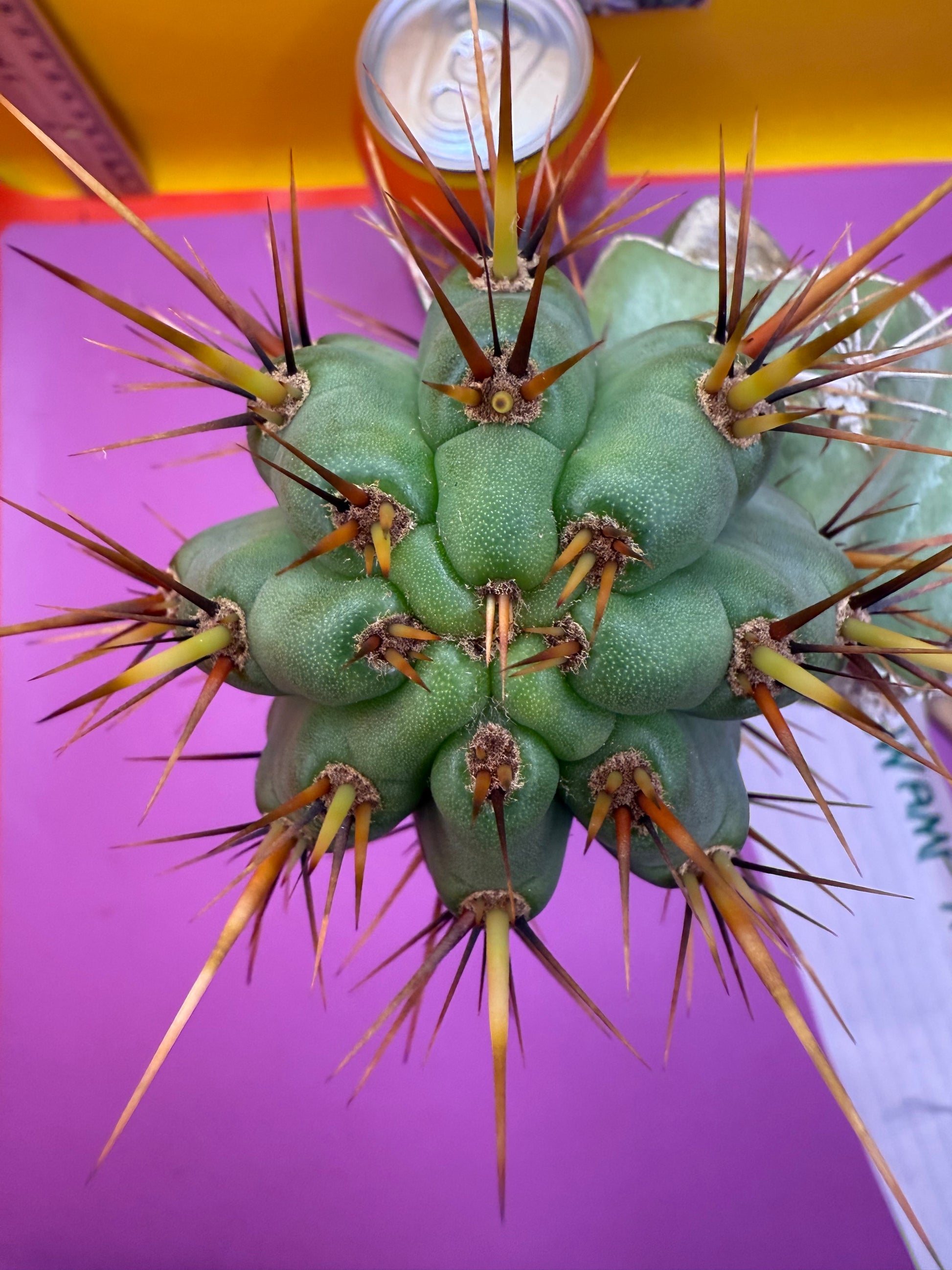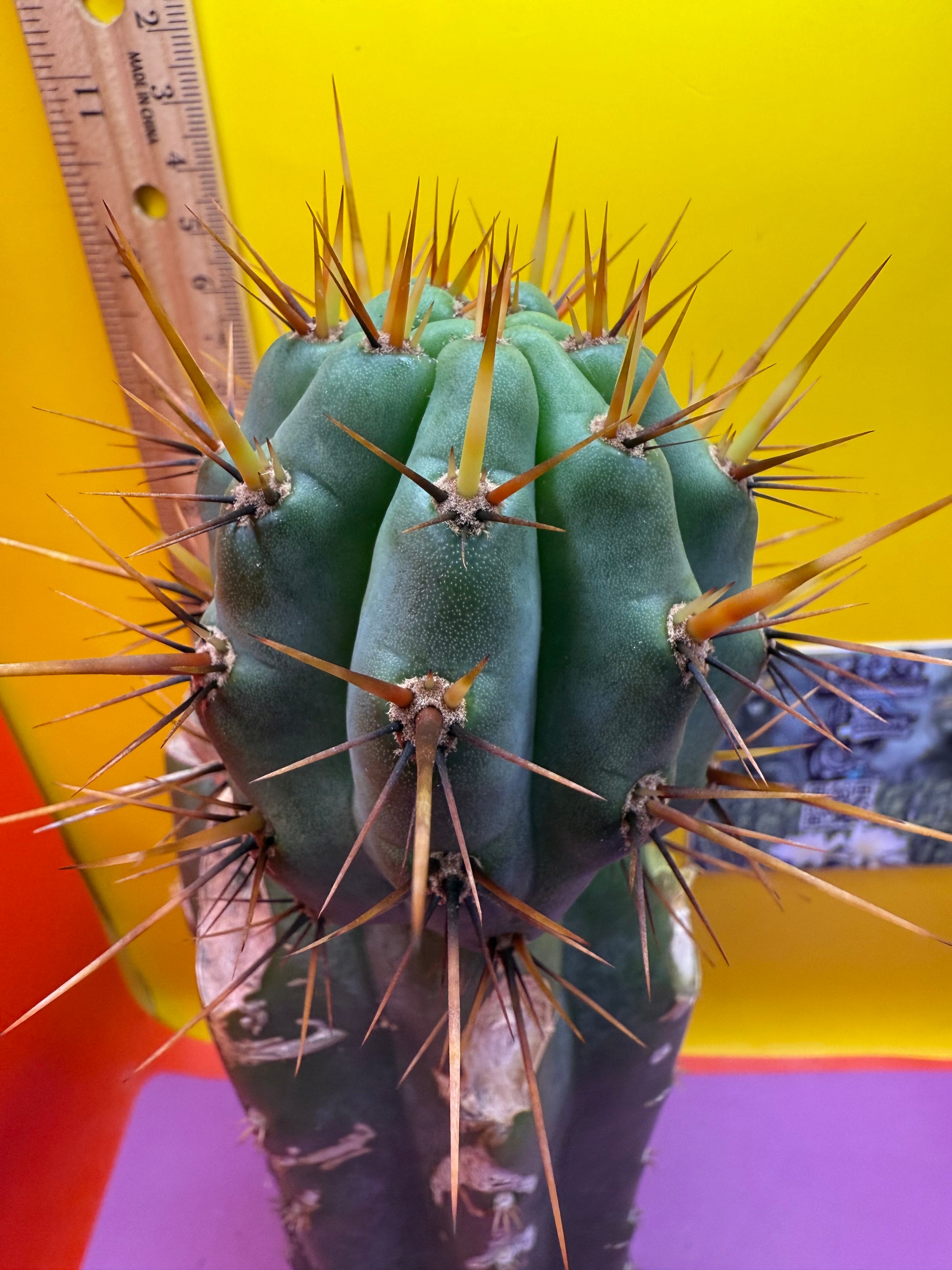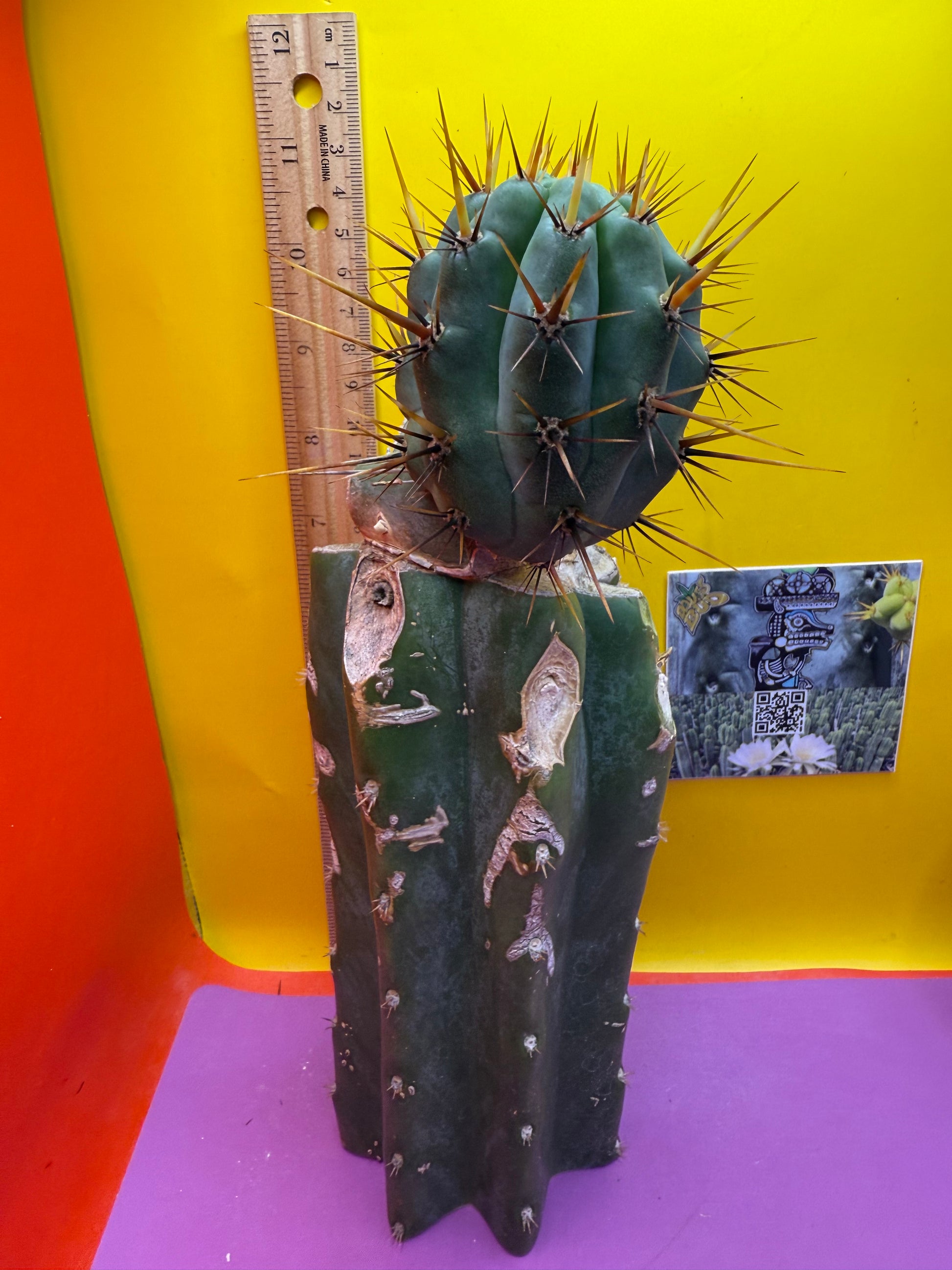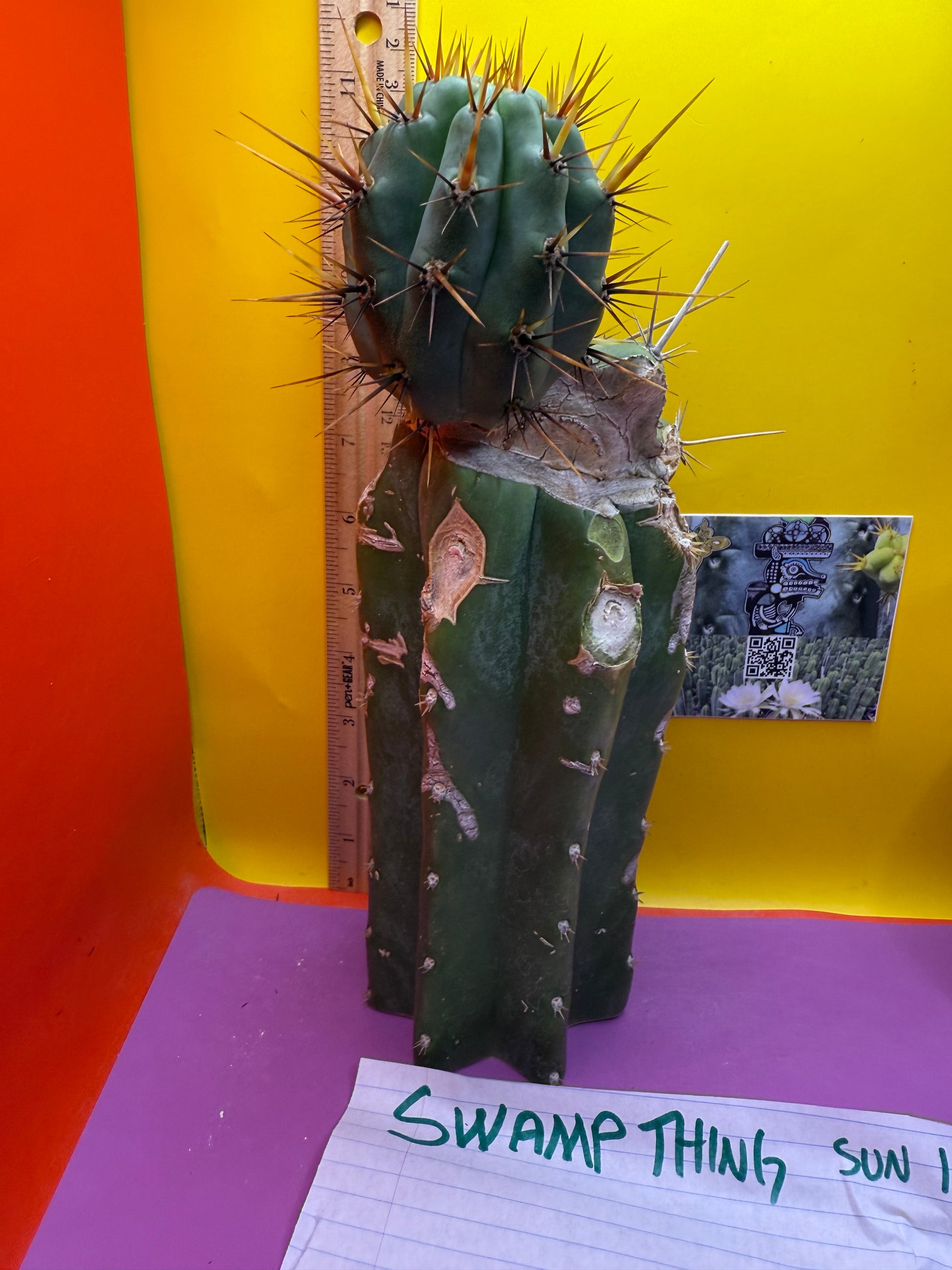 TRICHOCEREUS CV “SWAMP THING” is a super rad specimen, I personally love how its spines emerge as all different colors , from red to orange , black yellow white , gold and silver this cactus produces brand new spines in a technicolor spectrum of hues !! This has an extremely fat healthy pup coming of this thic chonk of a slab graft . “Swamp thing” grows a vividly dark green powdery flesh with a wavy rib line and beautiful symmetrical ribs , often producing 8 identical ribs .