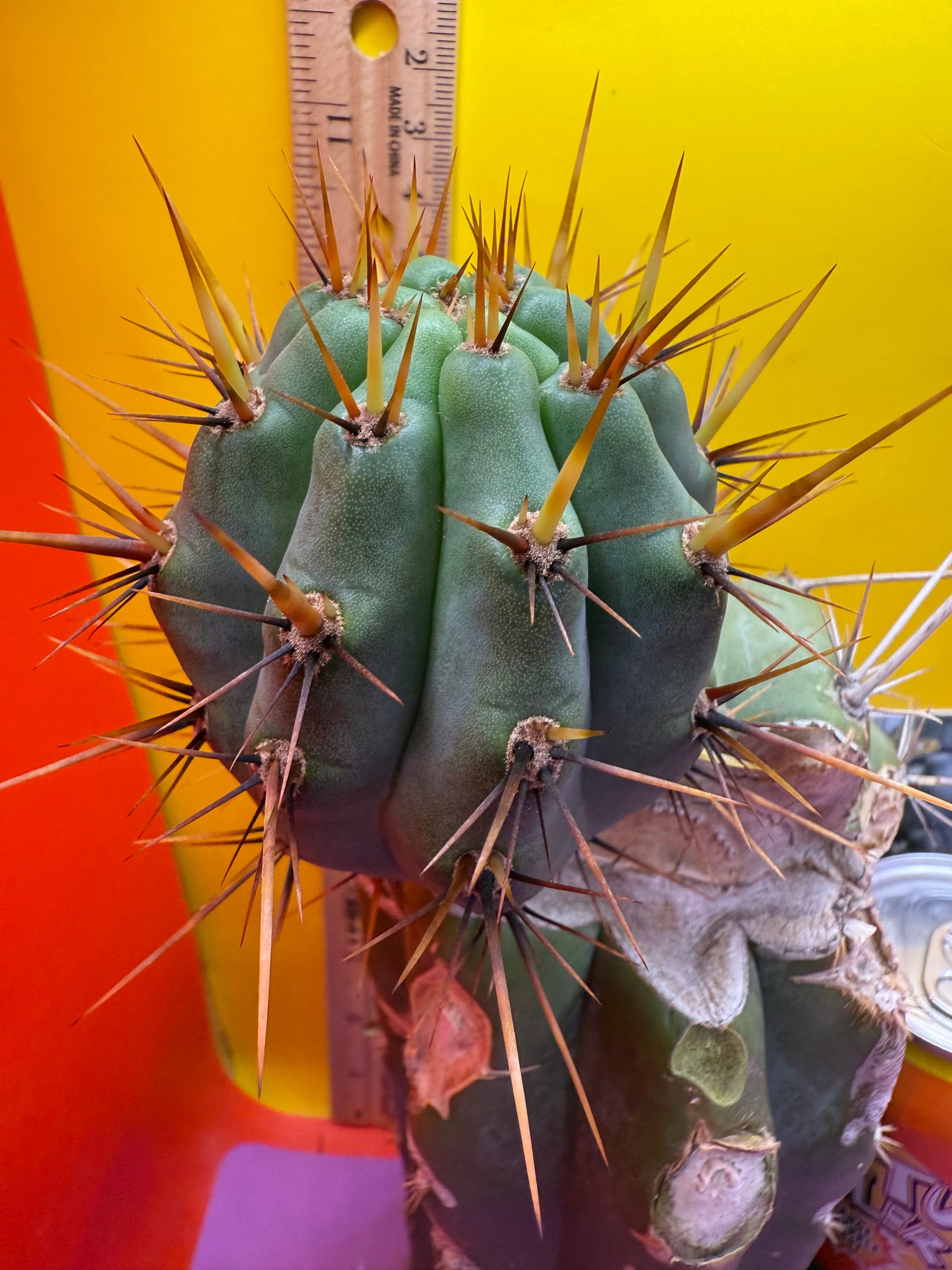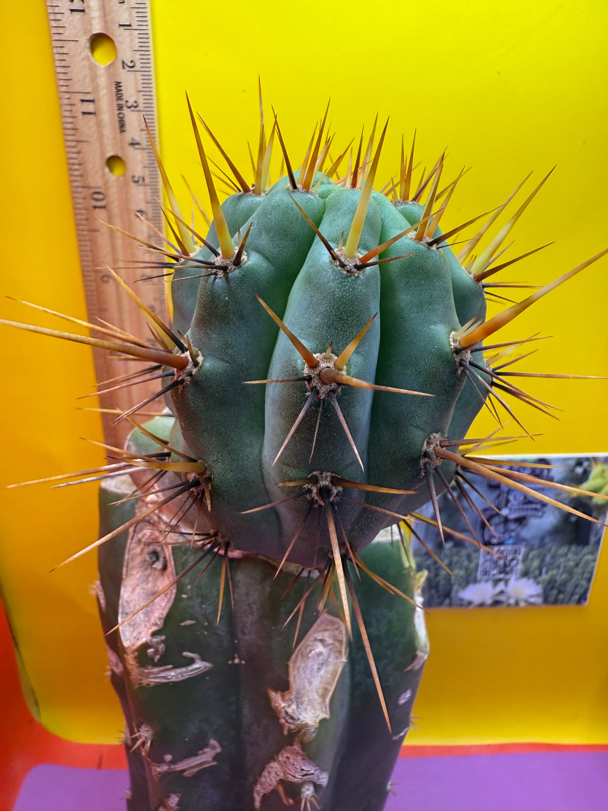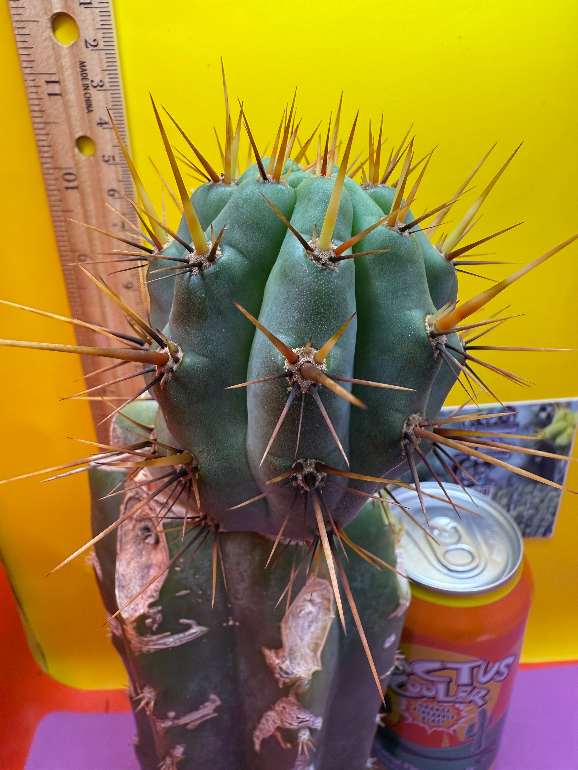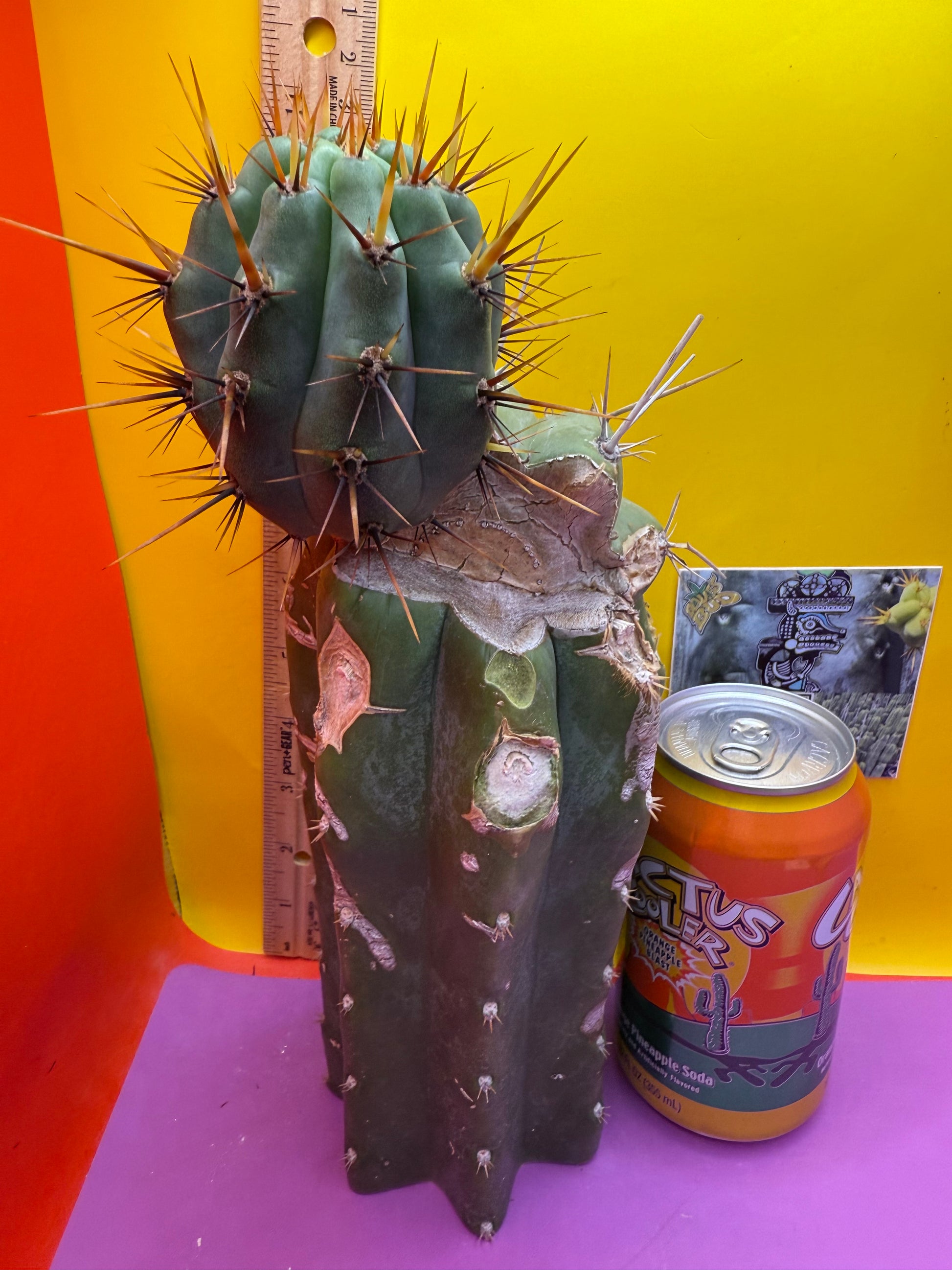 TRICHOCEREUS CV “SWAMP THING” is a super rad specimen, I personally love how its spines emerge as all different colors , from red to orange , black yellow white , gold and silver this cactus produces brand new spines in a technicolor spectrum of hues !! This has an extremely fat healthy pup coming of this thic chonk of a slab graft . “Swamp thing” grows a vividly dark green powdery flesh with a wavy rib line and beautiful symmetrical ribs , often producing 8 identical ribs .