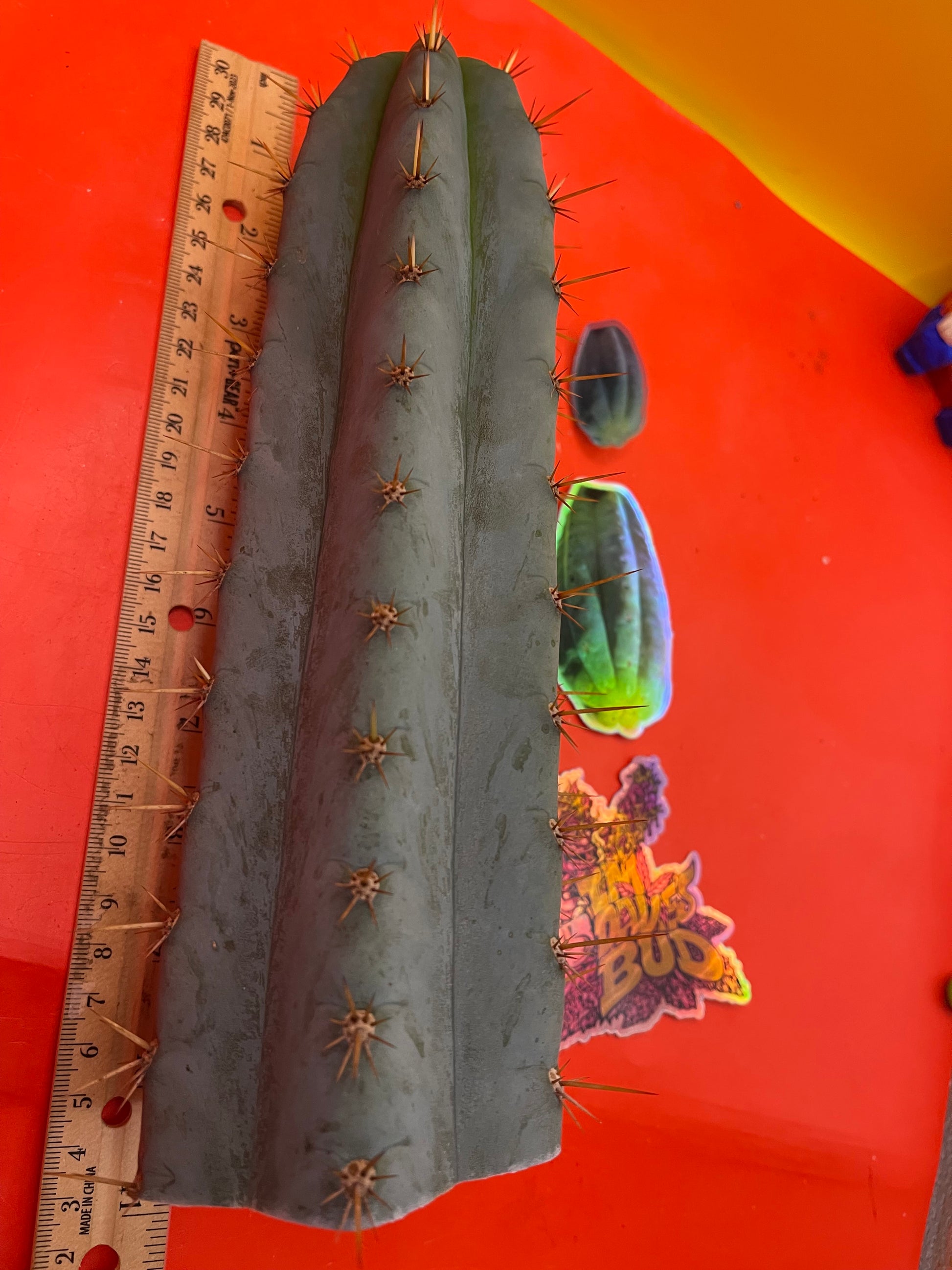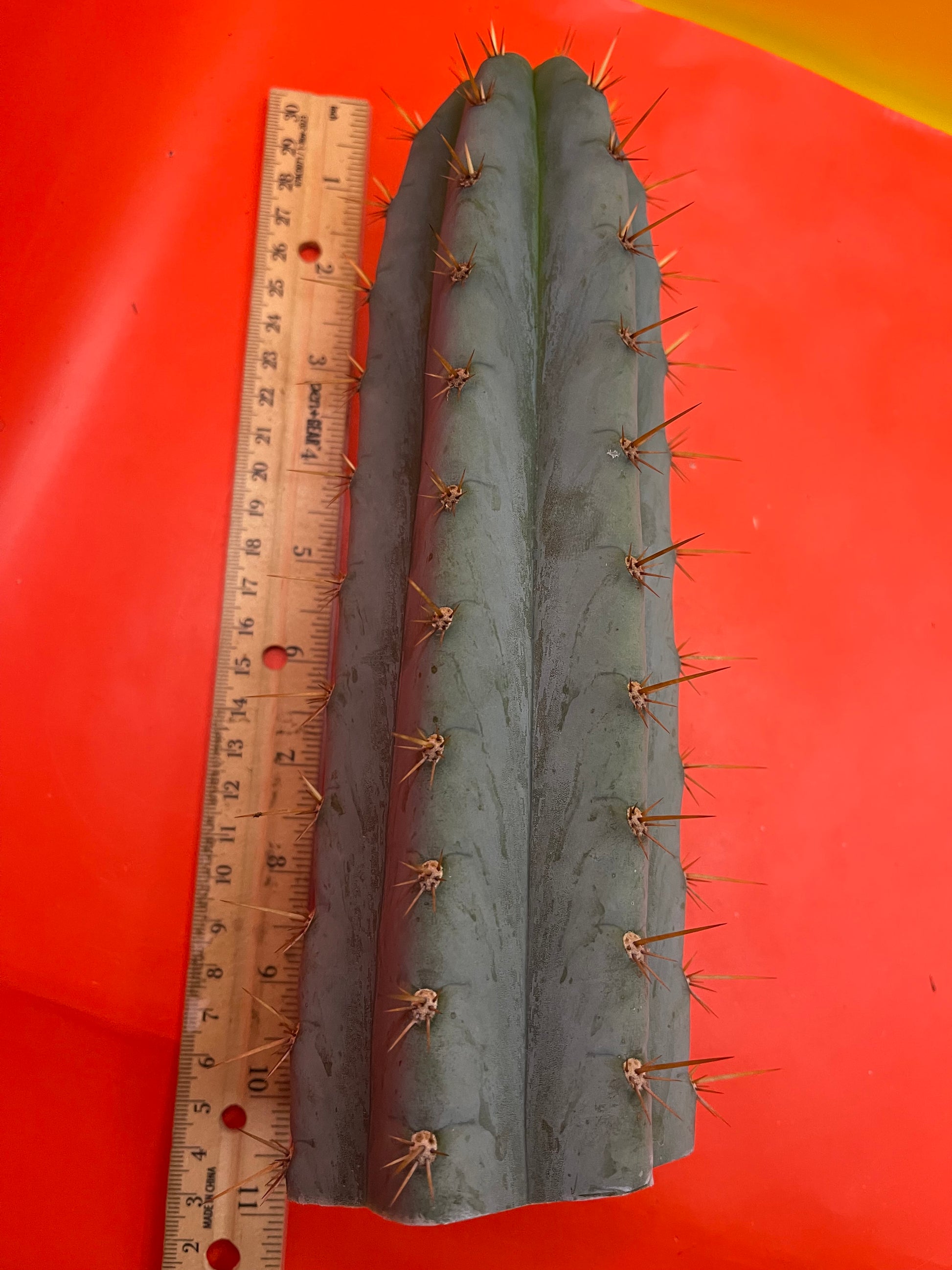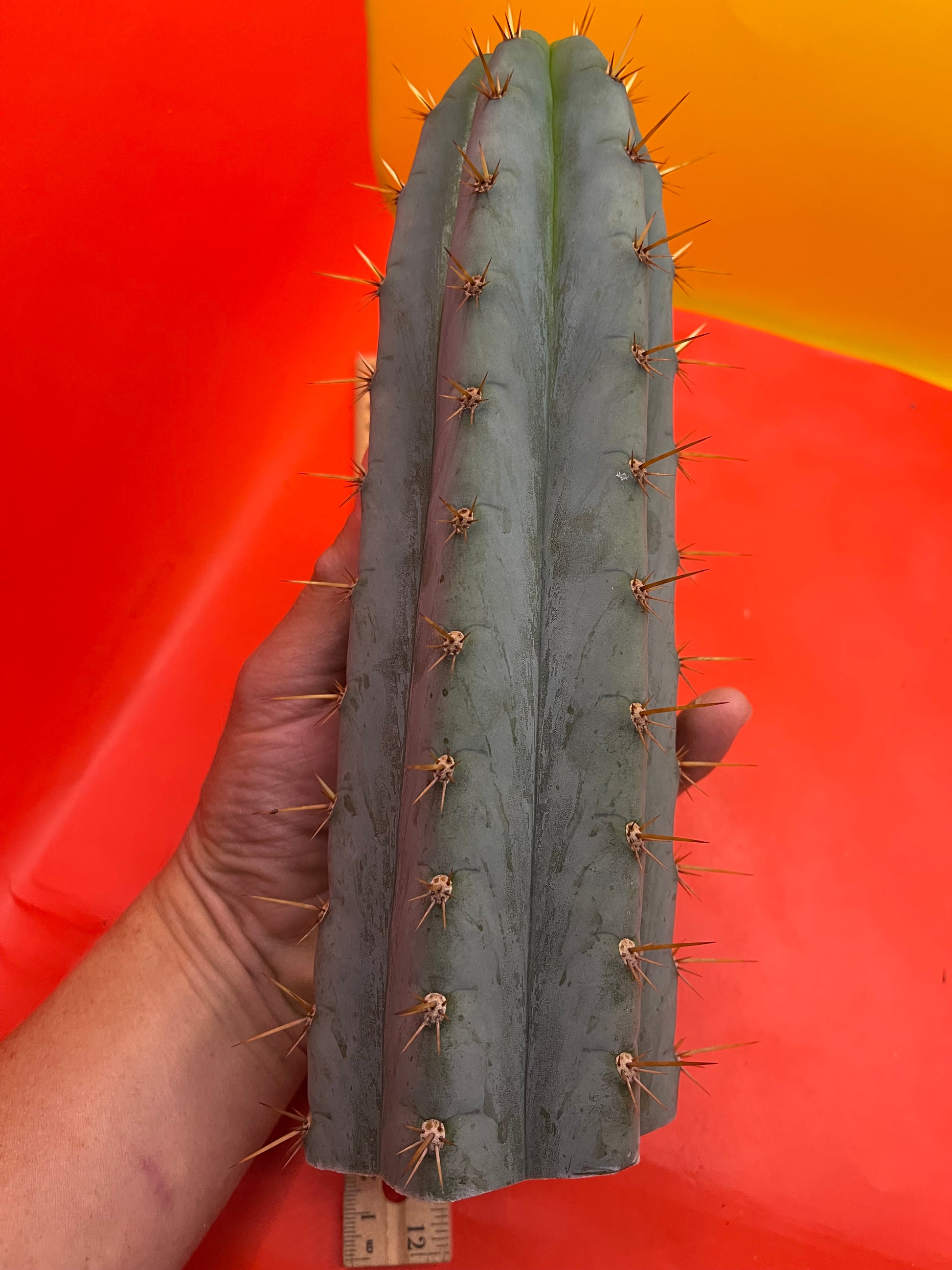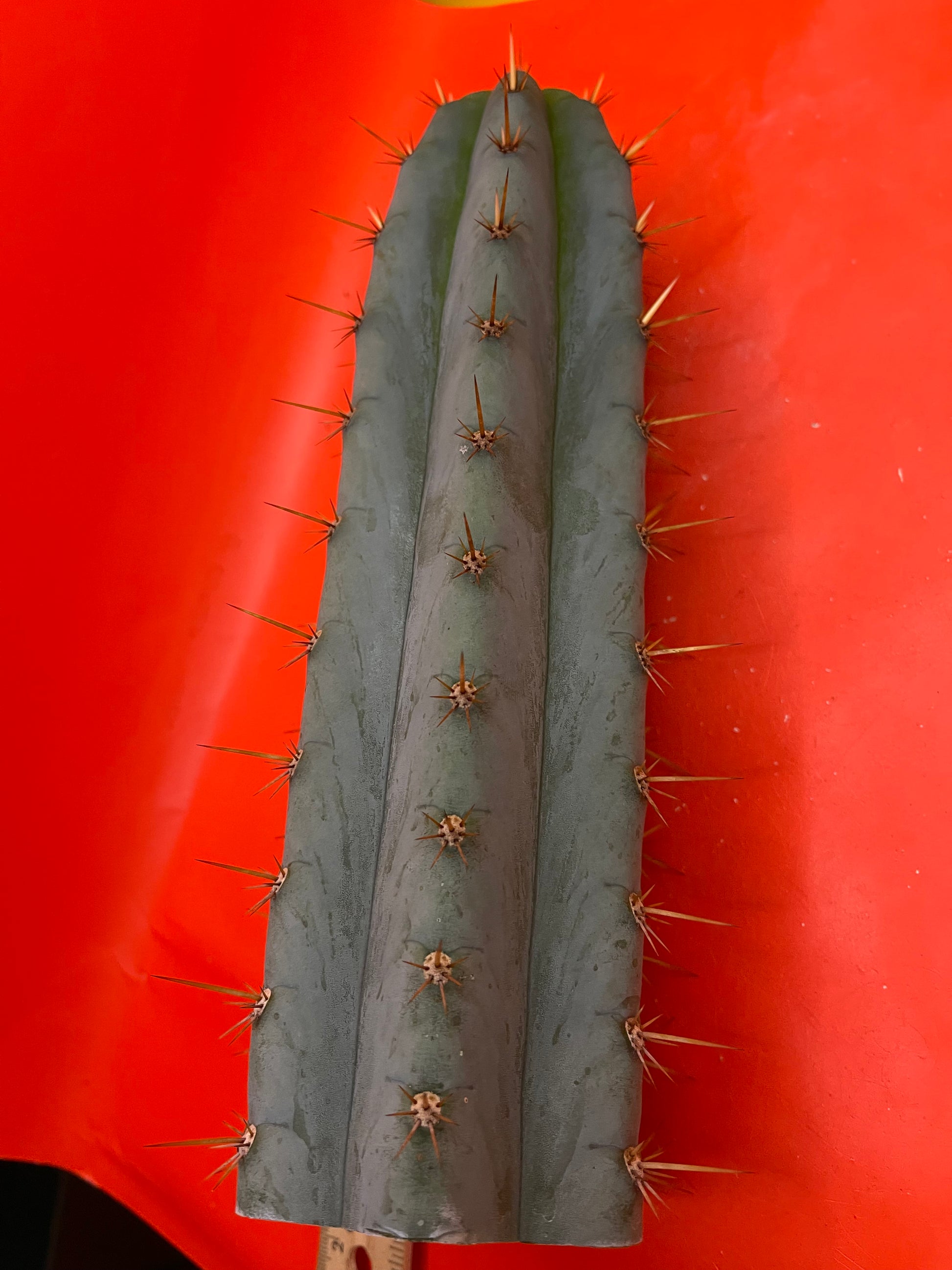 Really pretty blue NOID ! San Pedro Cactus with gorgeous powdery blue skin , fresh cut Wednesday ready to ship on Monday- only 2 cuts of this available! Strong spines , with several colors on fresh growth yellows oranges n red fading to black