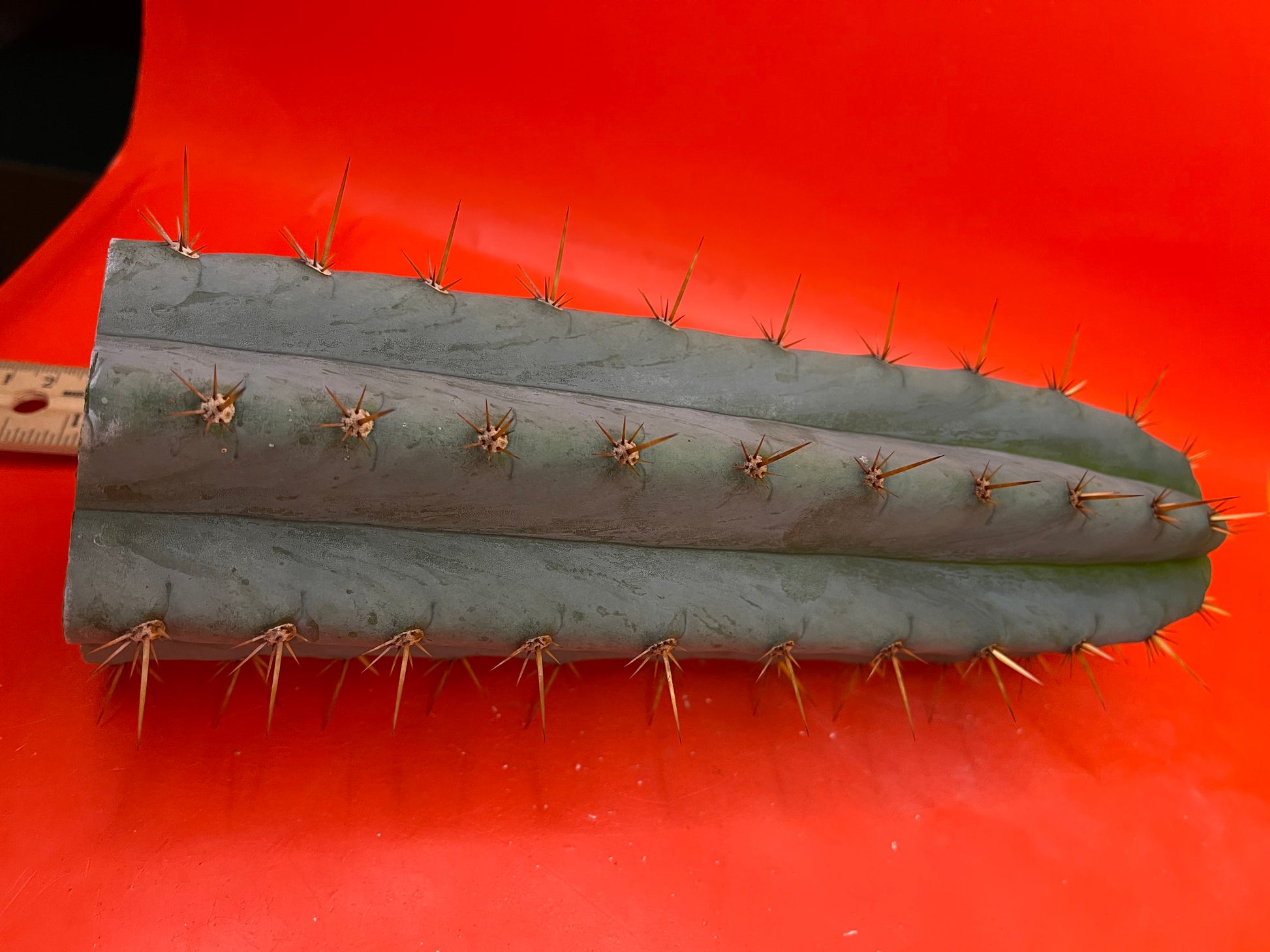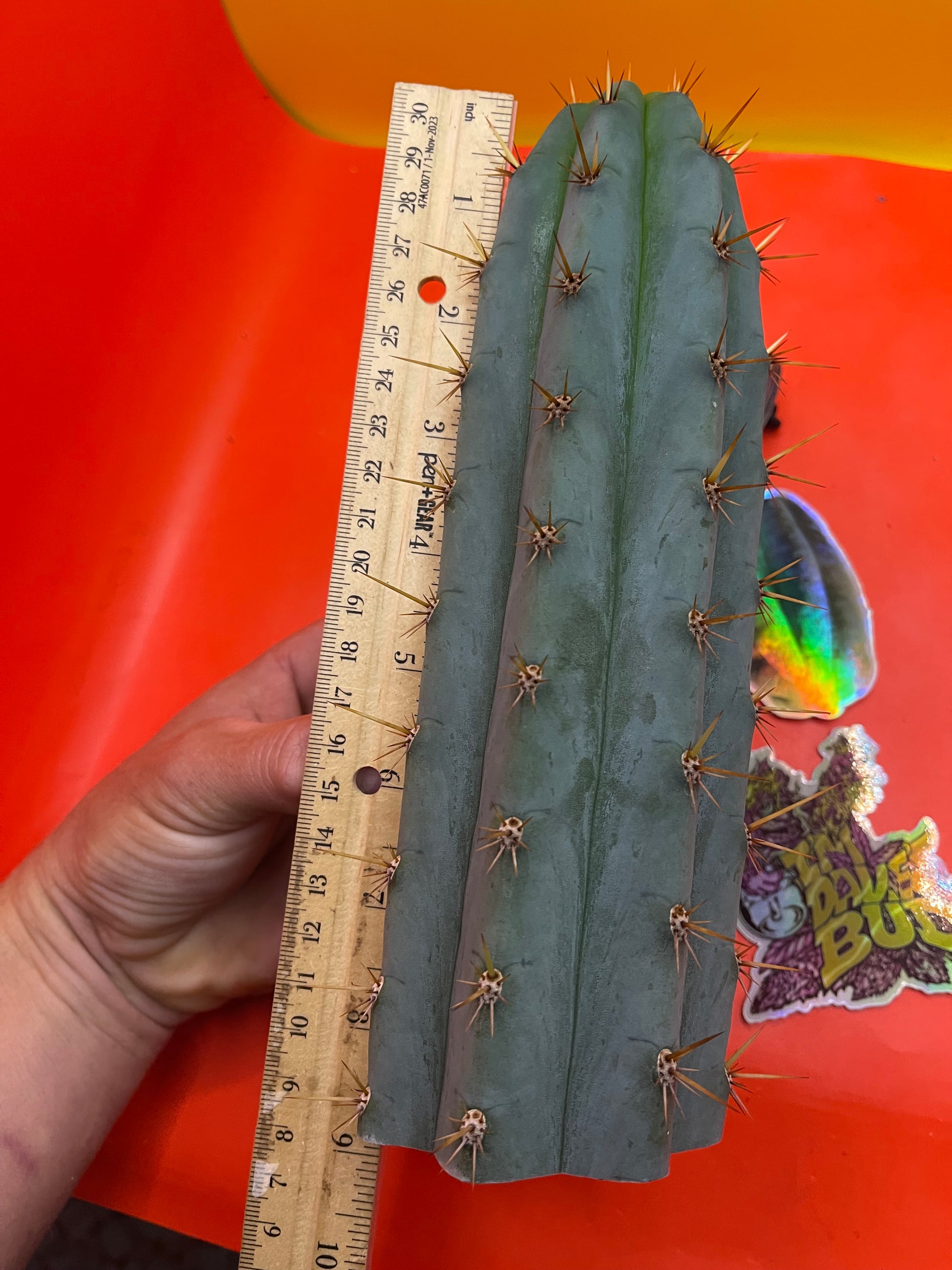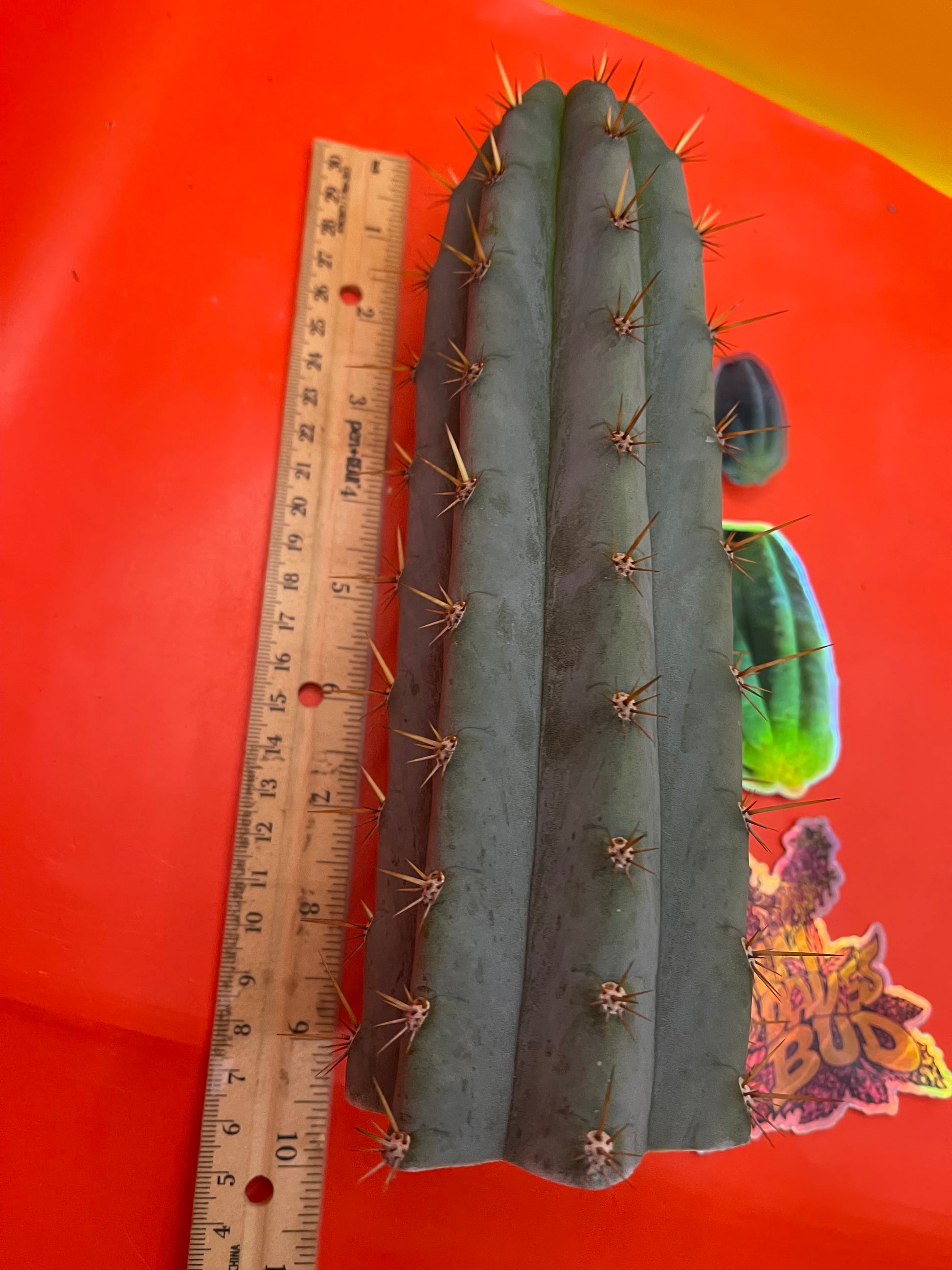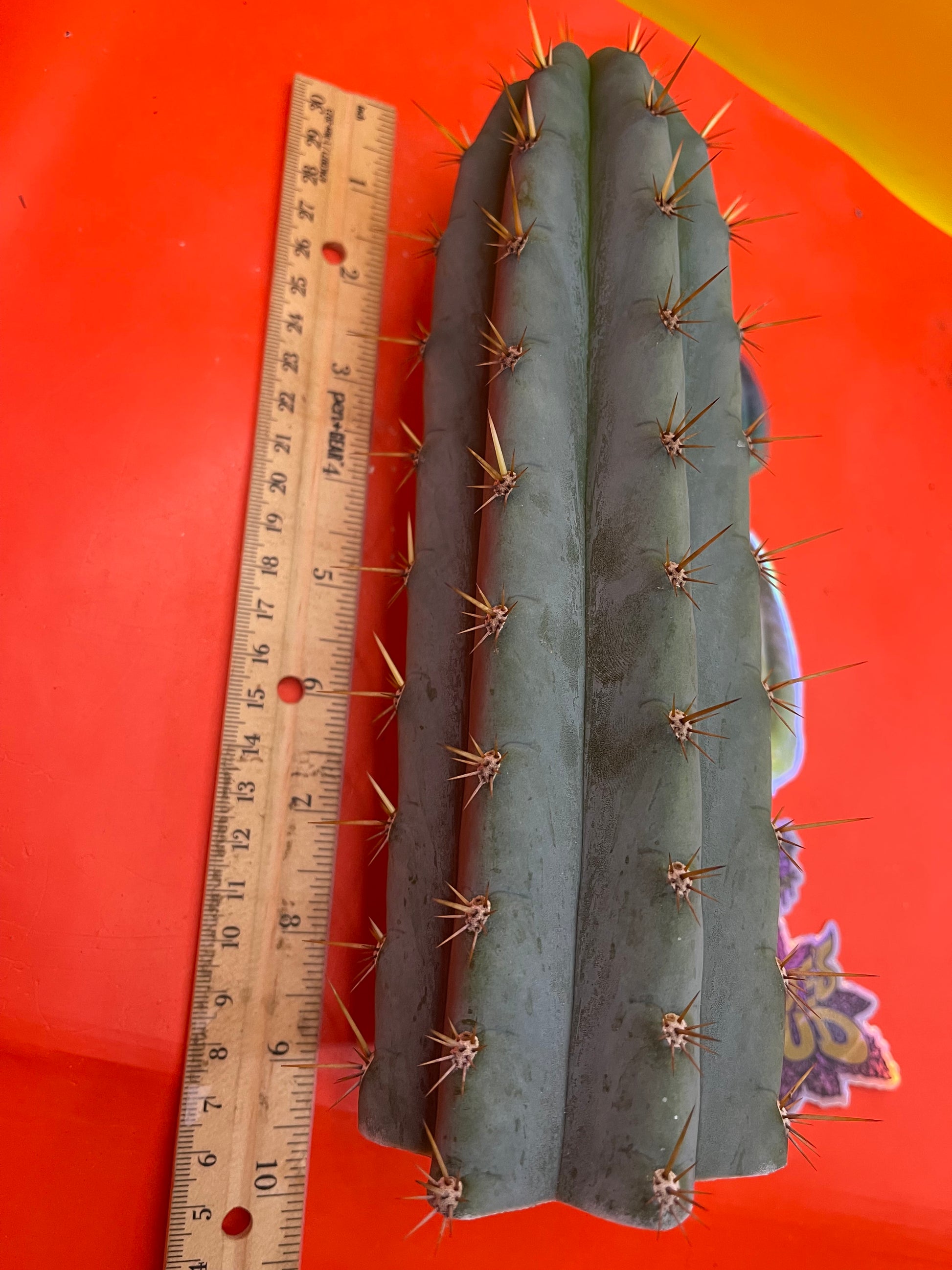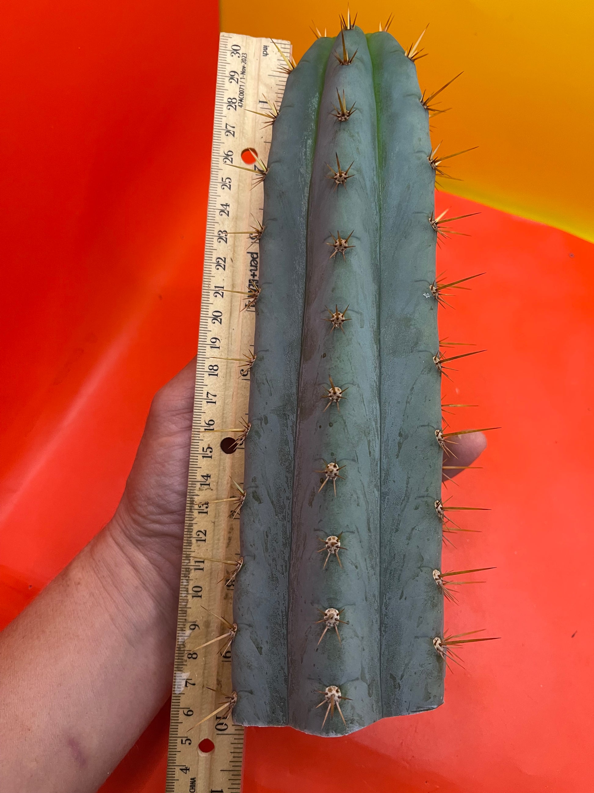 Really pretty blue NOID ! San Pedro Cactus with gorgeous powdery blue skin , fresh cut Wednesday ready to ship on Monday- only 2 cuts of this available! Strong spines , with several colors on fresh growth yellows oranges n red fading to black