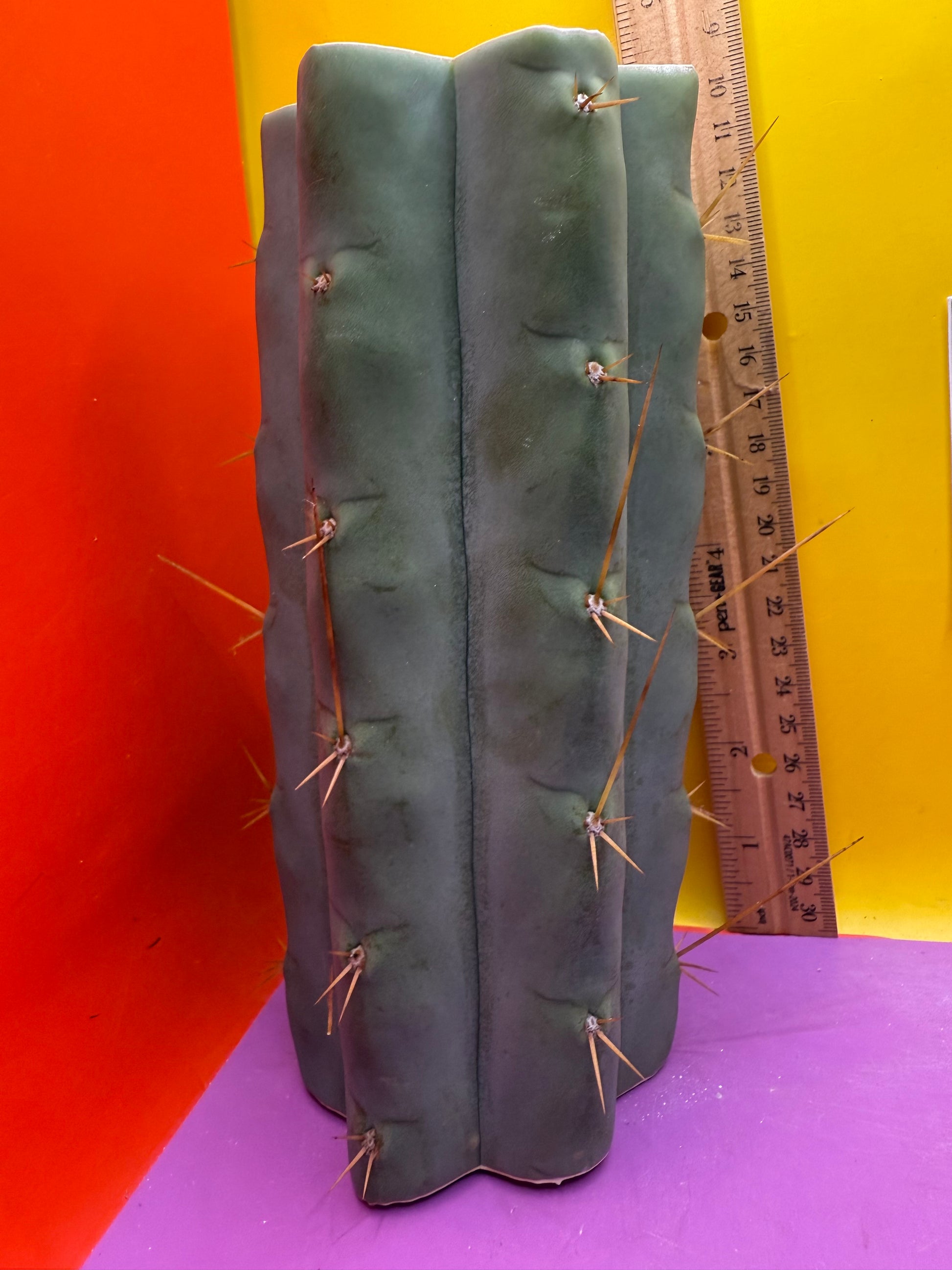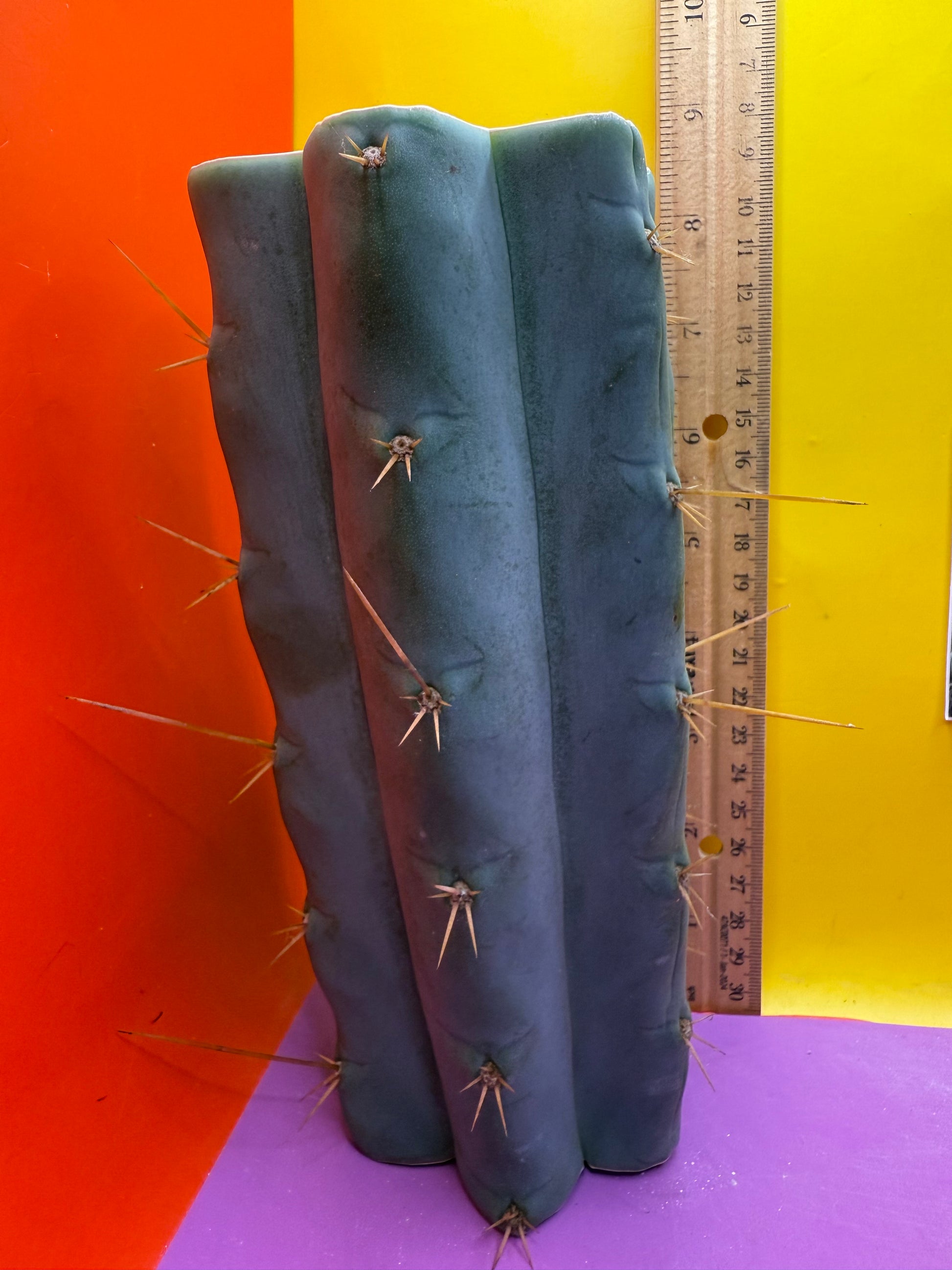 This is a seed grown trichocereus bridgesii . This exact mid came off a 4 foot stand that I grew from a small seedling ! It’s very thick and fast growing , powdery aquamarine blue with nice notches , it doesn’t grow numerous spines and they aren’t very long or as extremely sharp as some other bridgesii in my collection . It does grow extraordinarily fast and doesn’t seem to get any humidity spots . I have not named this unique dna 🧬, but it is something I plan on propagating and growing a lot more of ….. maybe you could help me come up with its new name !!!