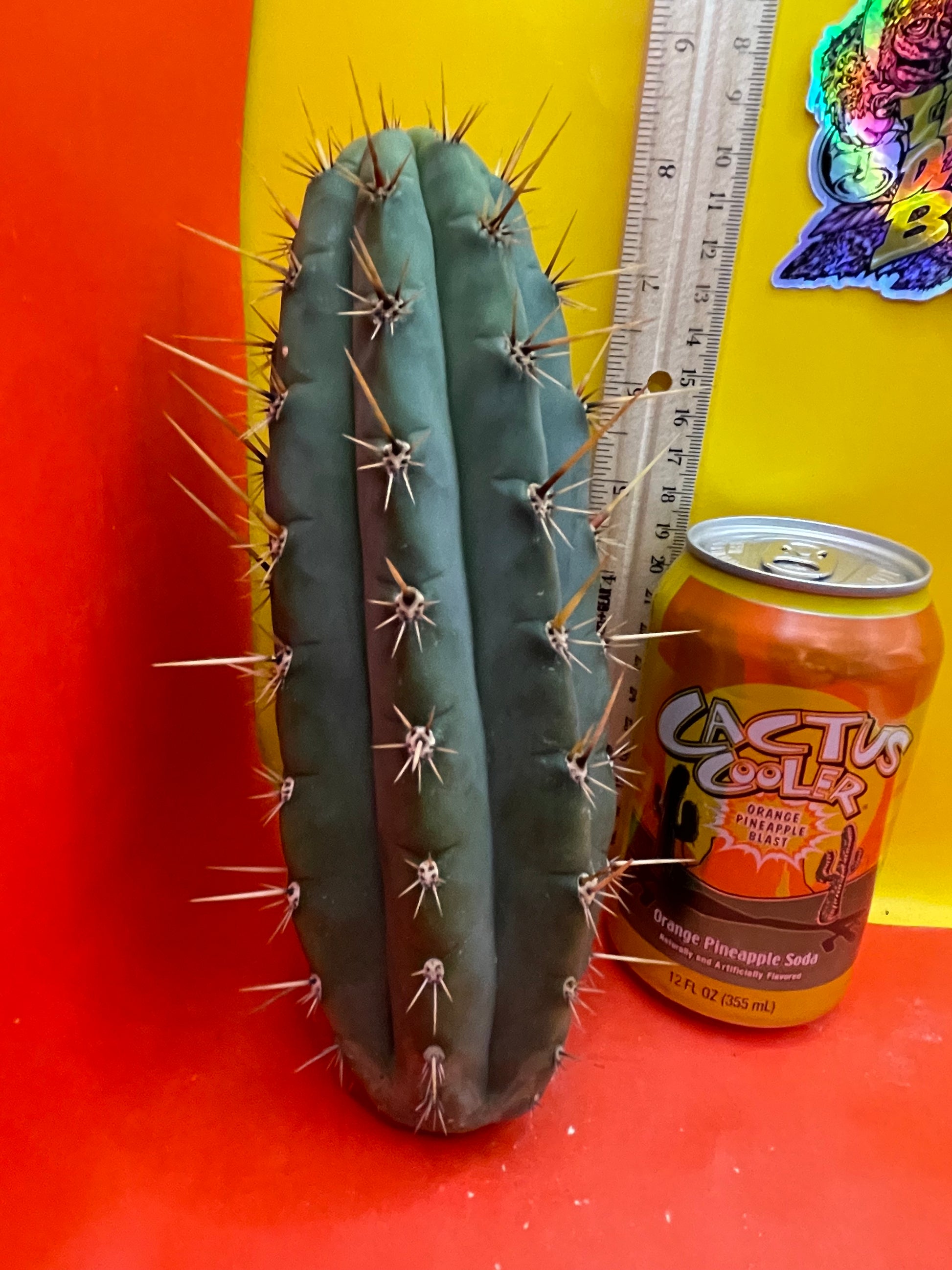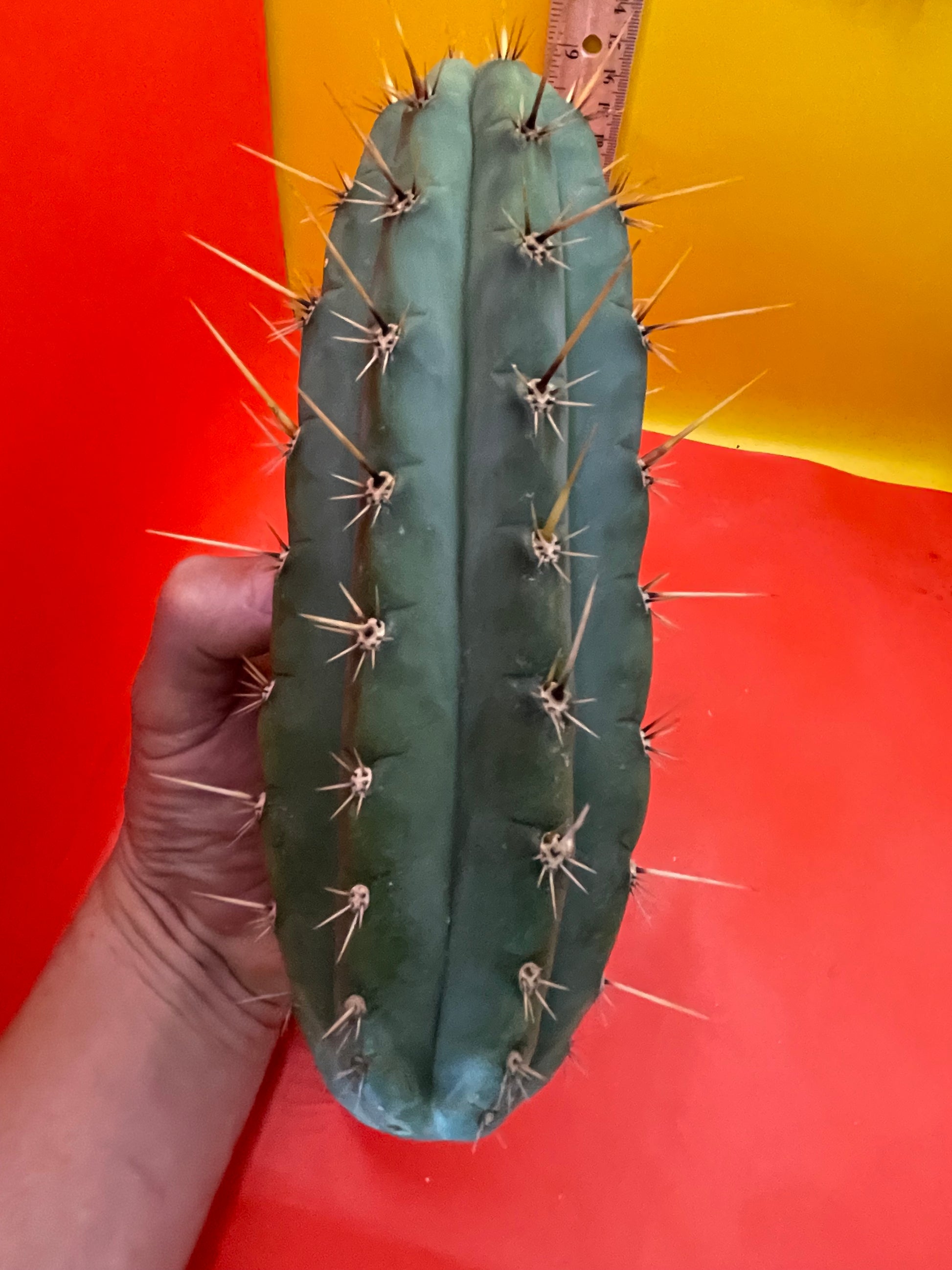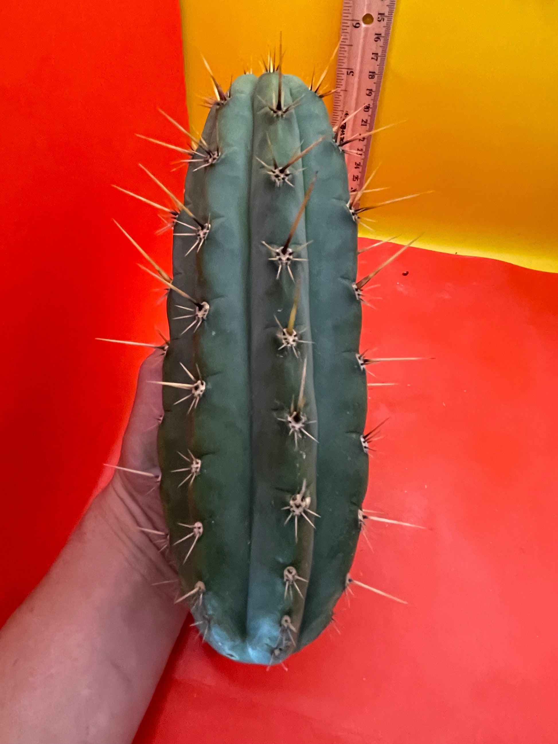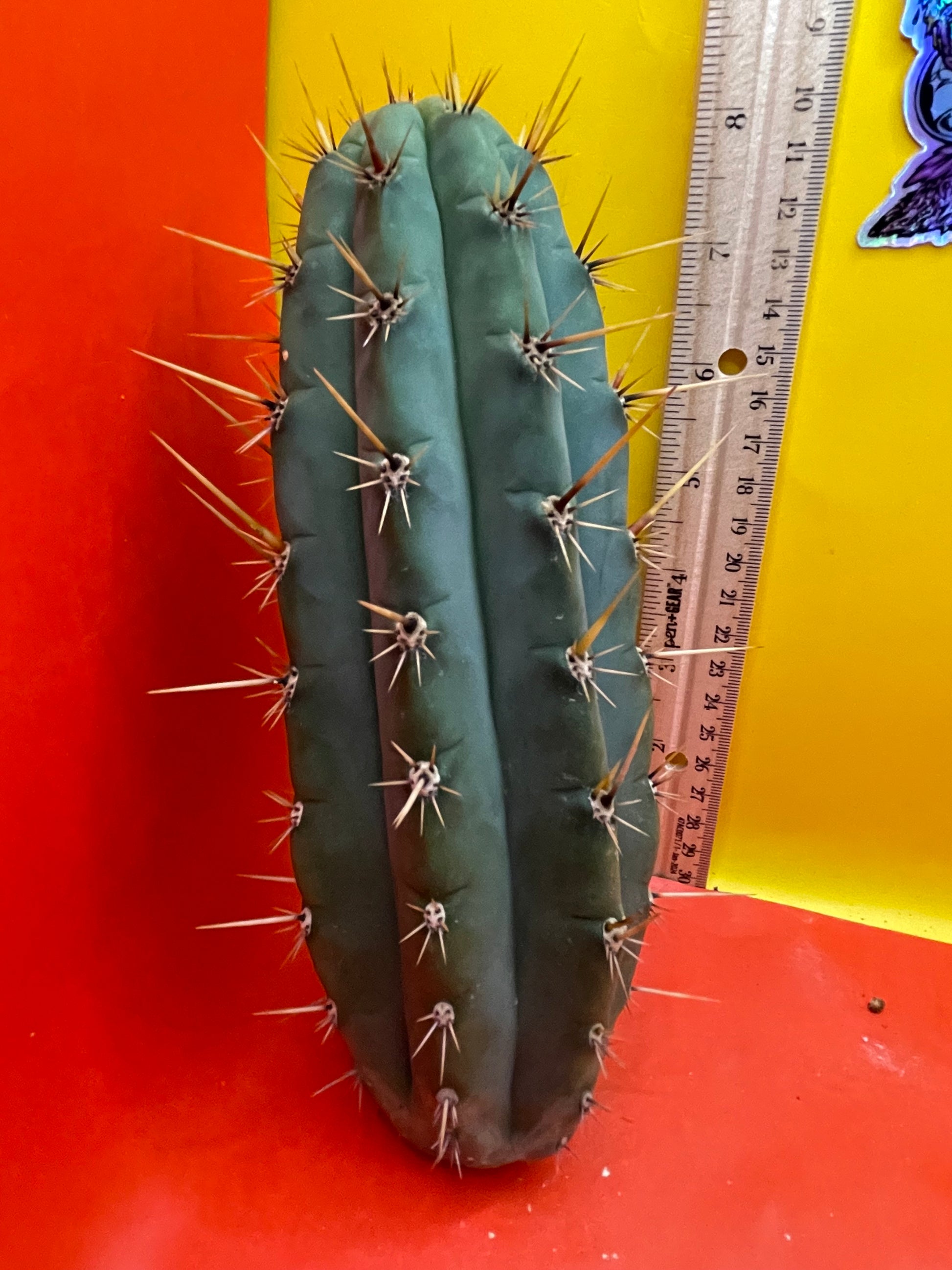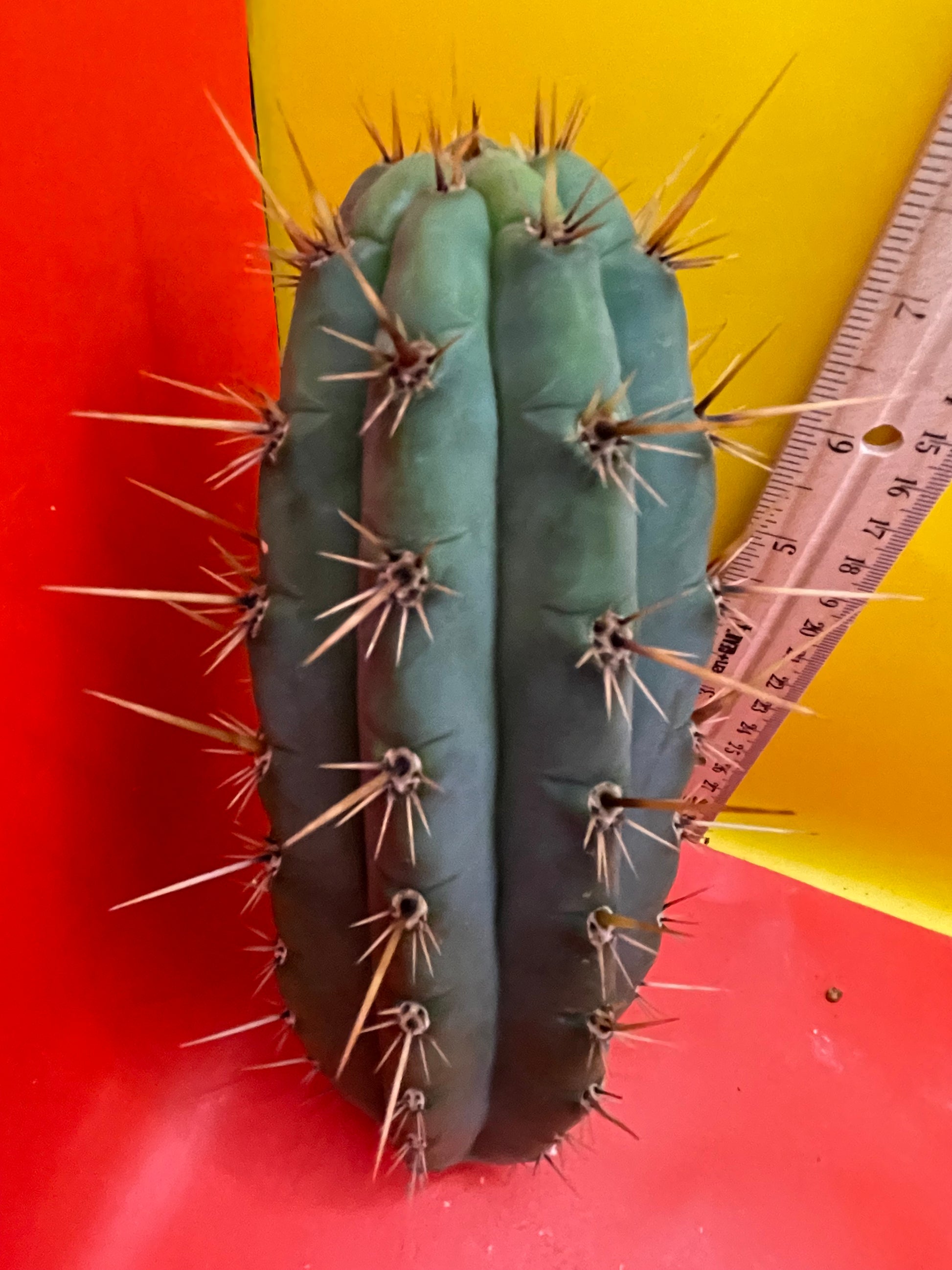 Gorgeous blue with brilliant red / yellow / gold & black spines that illuminate in the sunshine !!! Truly a beautiful contrast ! Very fat and thick , growing fast and healthy- I grew this in full sun , grown inground on my hillside in native soil I’m only letting go of this one cutting of this NOID