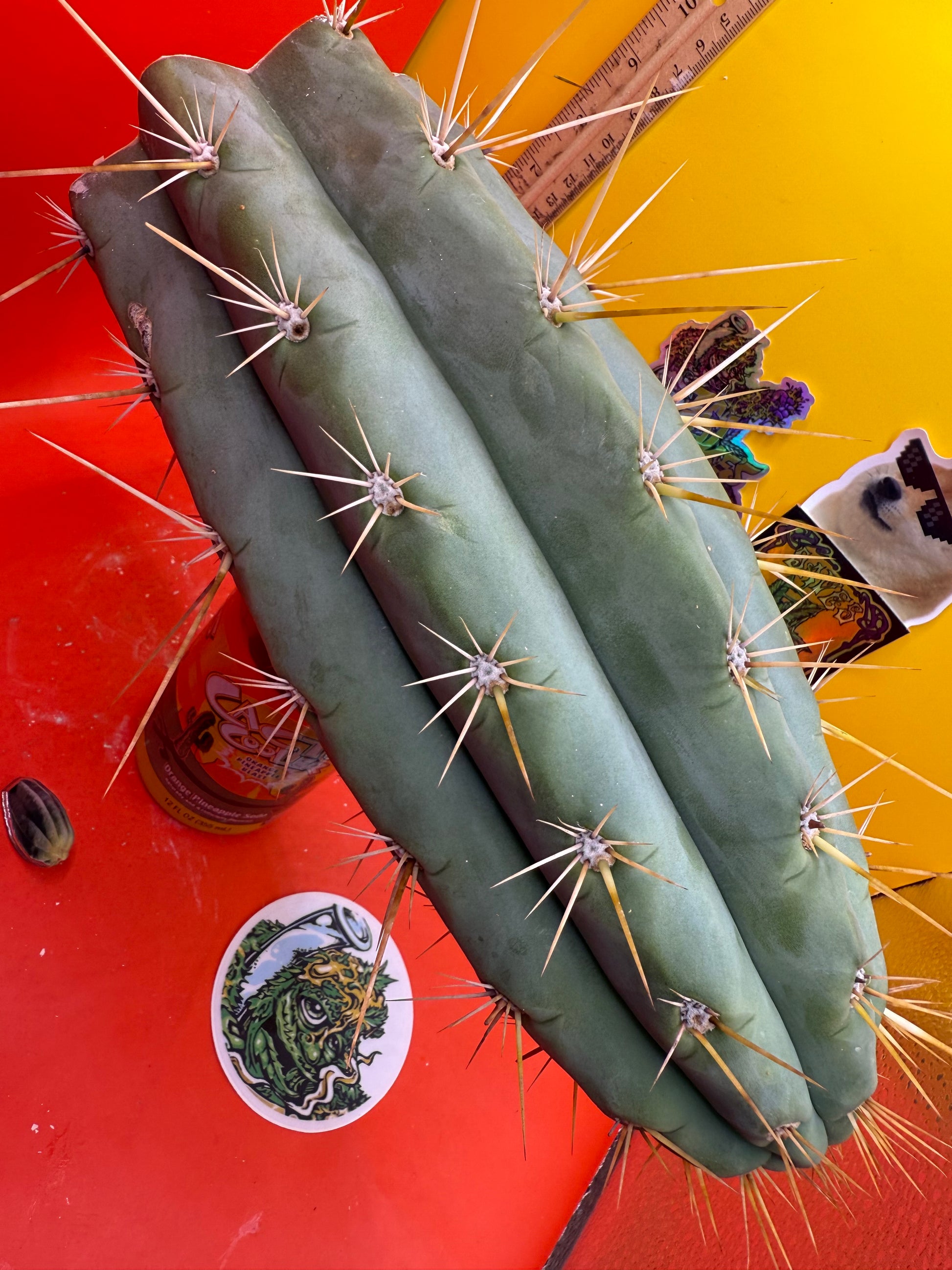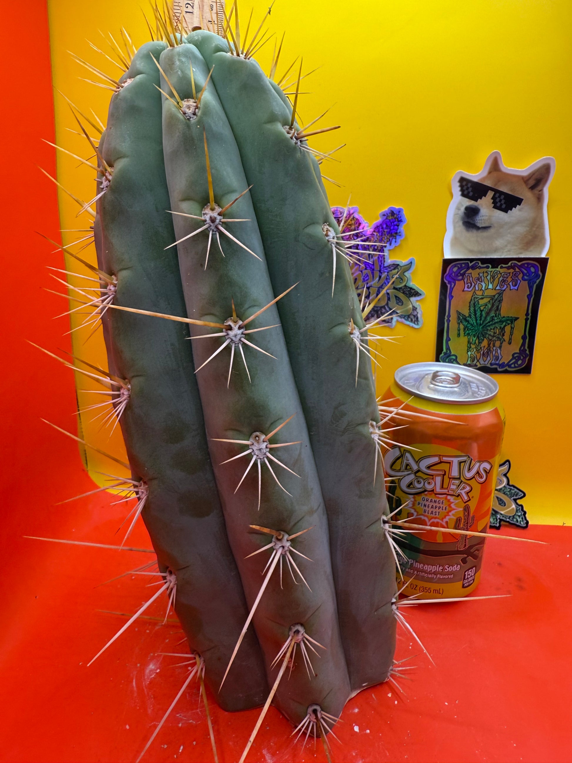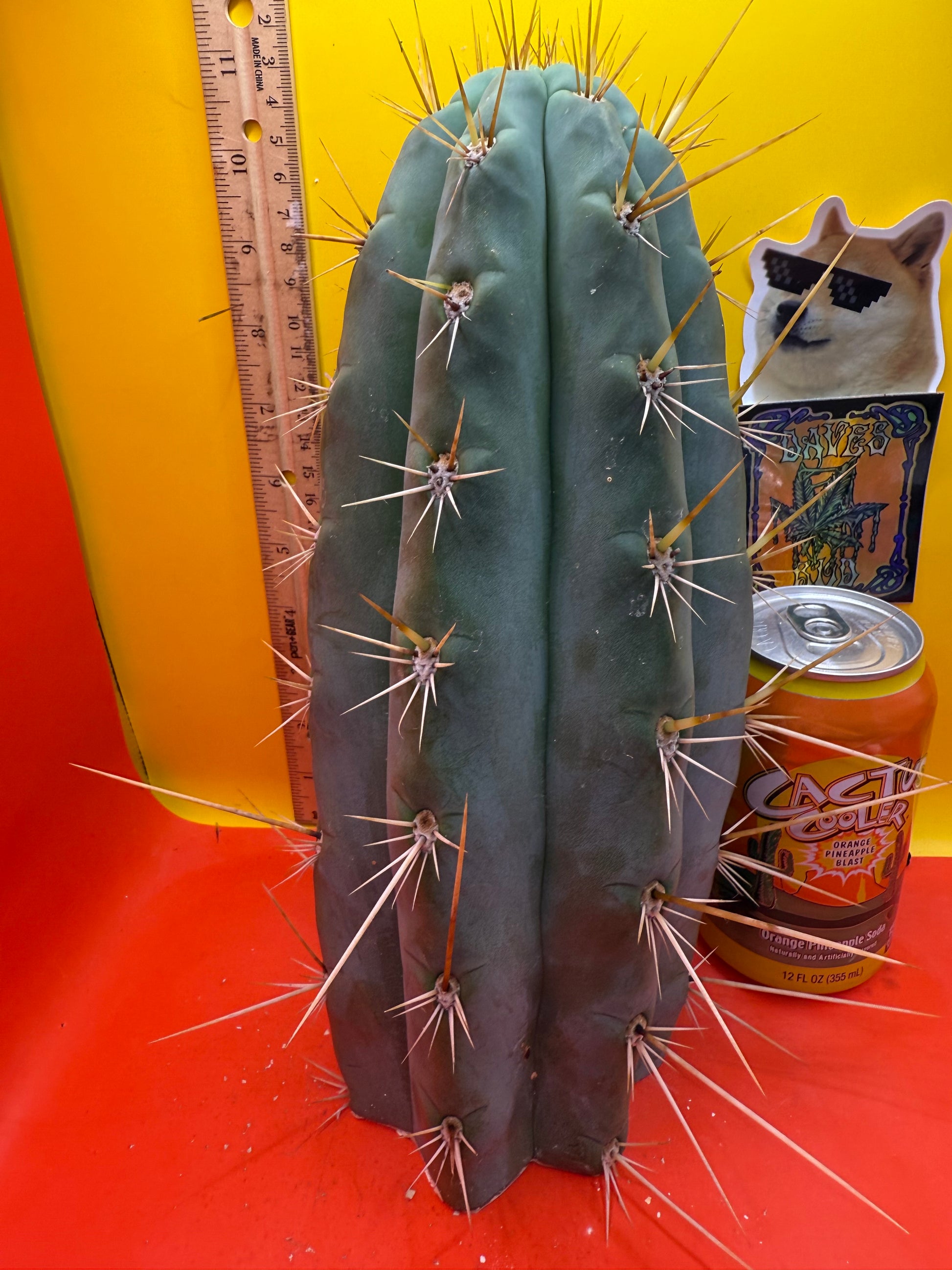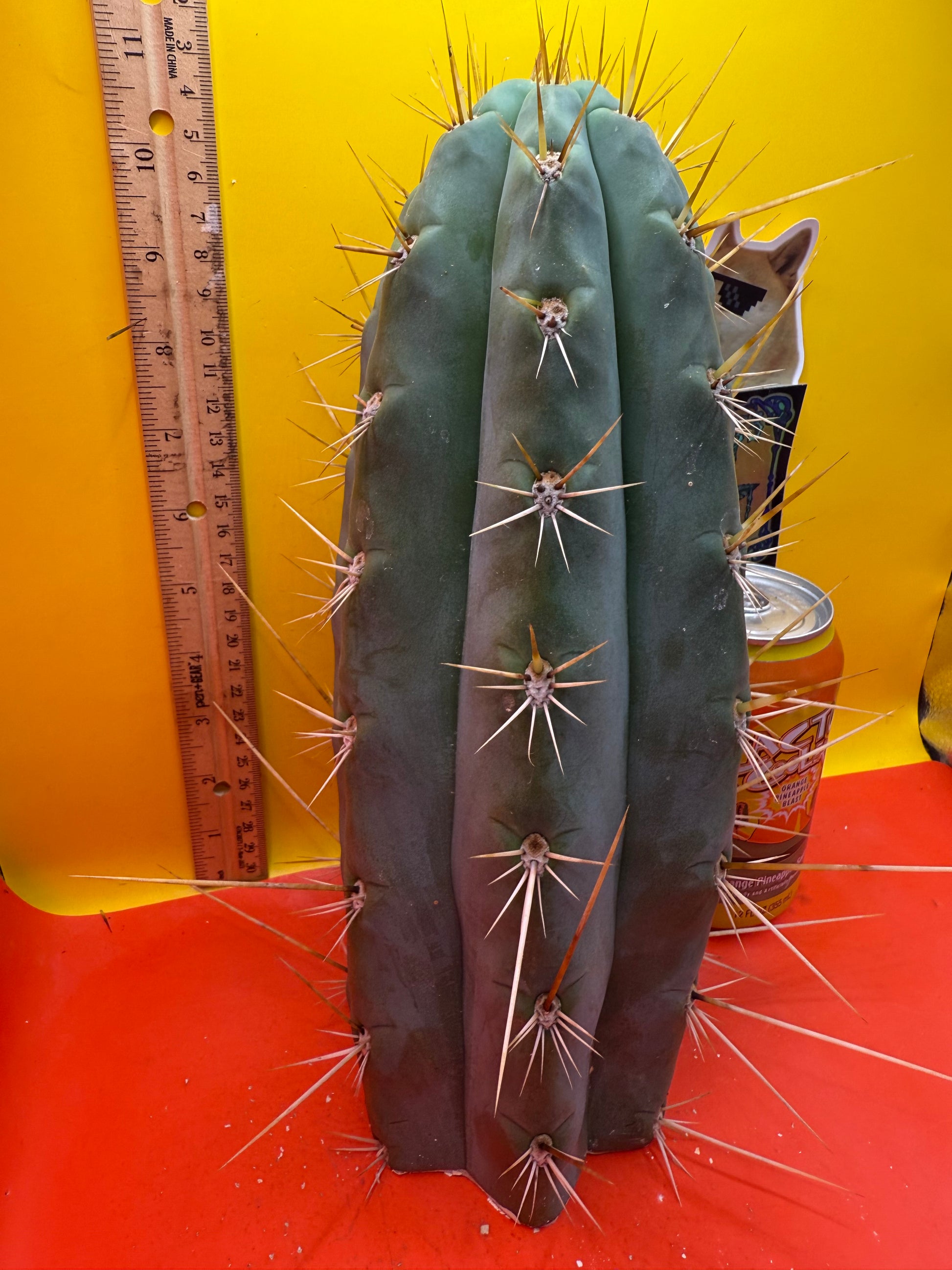 Big huge fat cutting ! This San Pedro cactus is over 4” thick ! Very well hydrated with rubbery blue flesh , and long spines reaching 3 inches in length!! Round white areole adorn the glaucous skin of this beautiful blue beast . This is ready to ship and ready to burst out roots ! Perfect tip and clean cut this is a trophy 🏆!