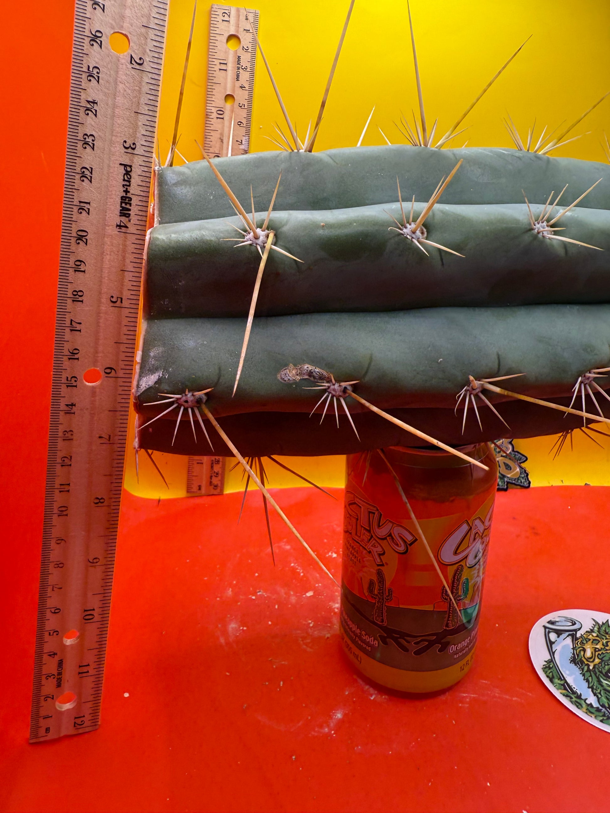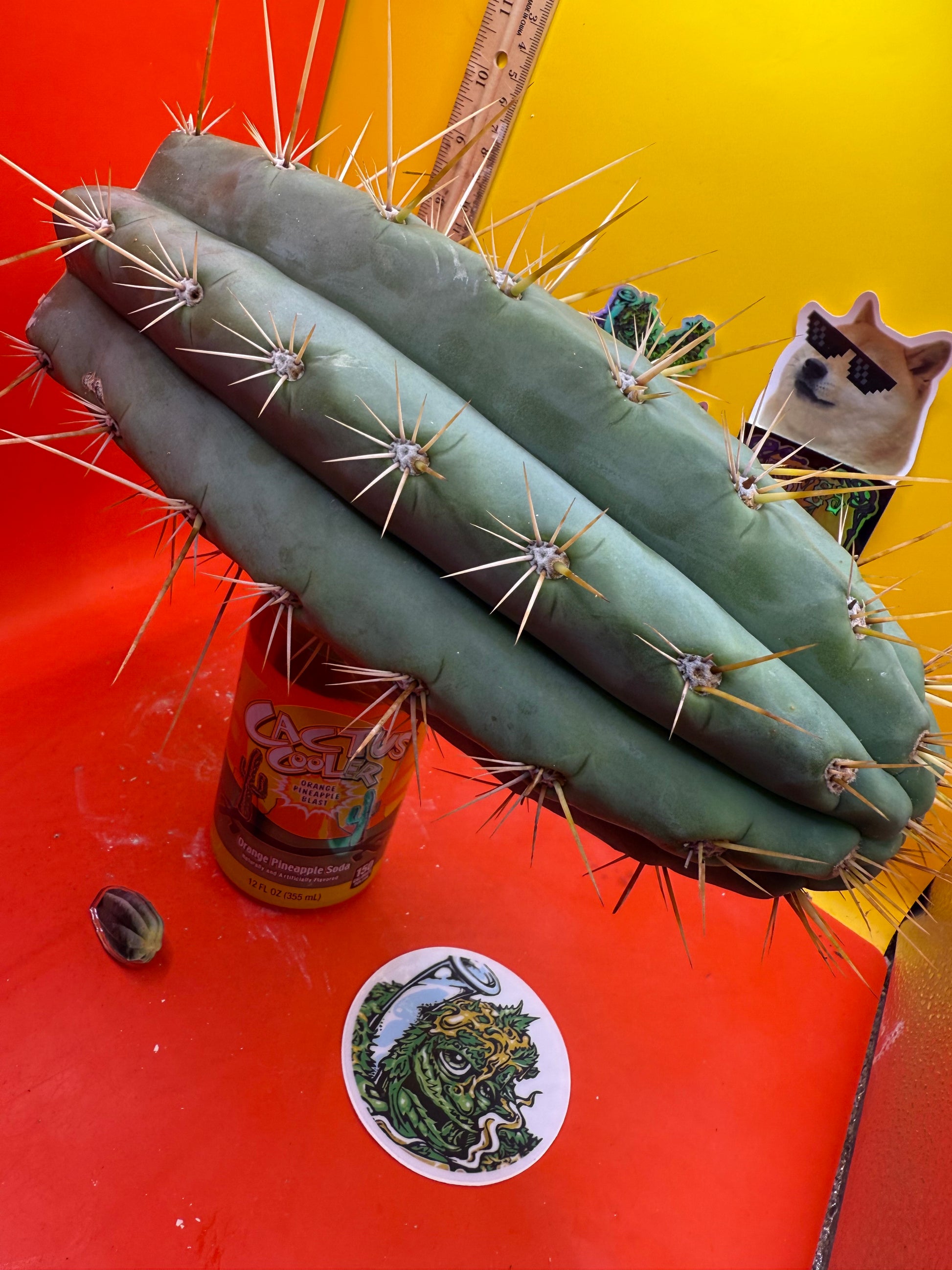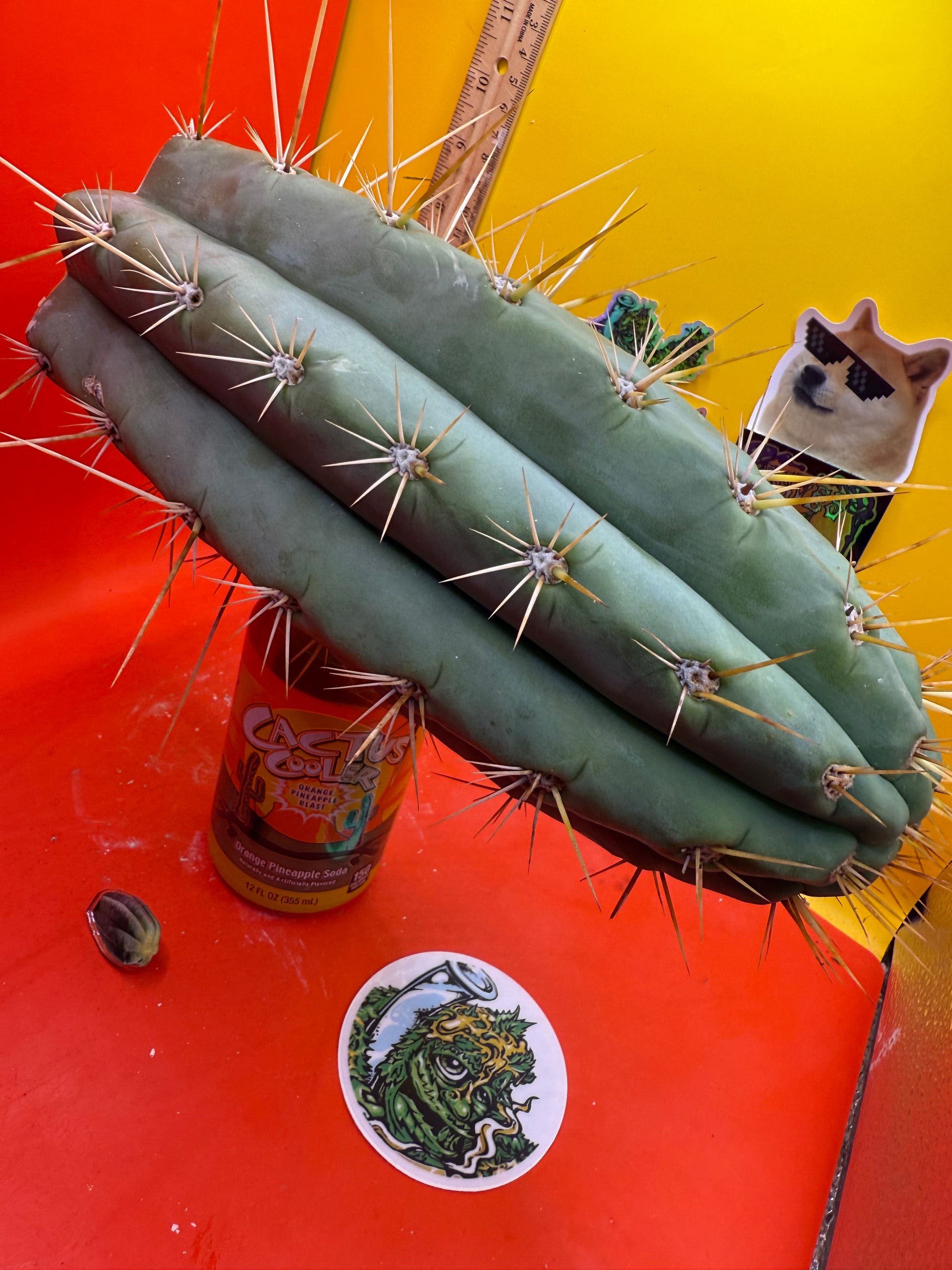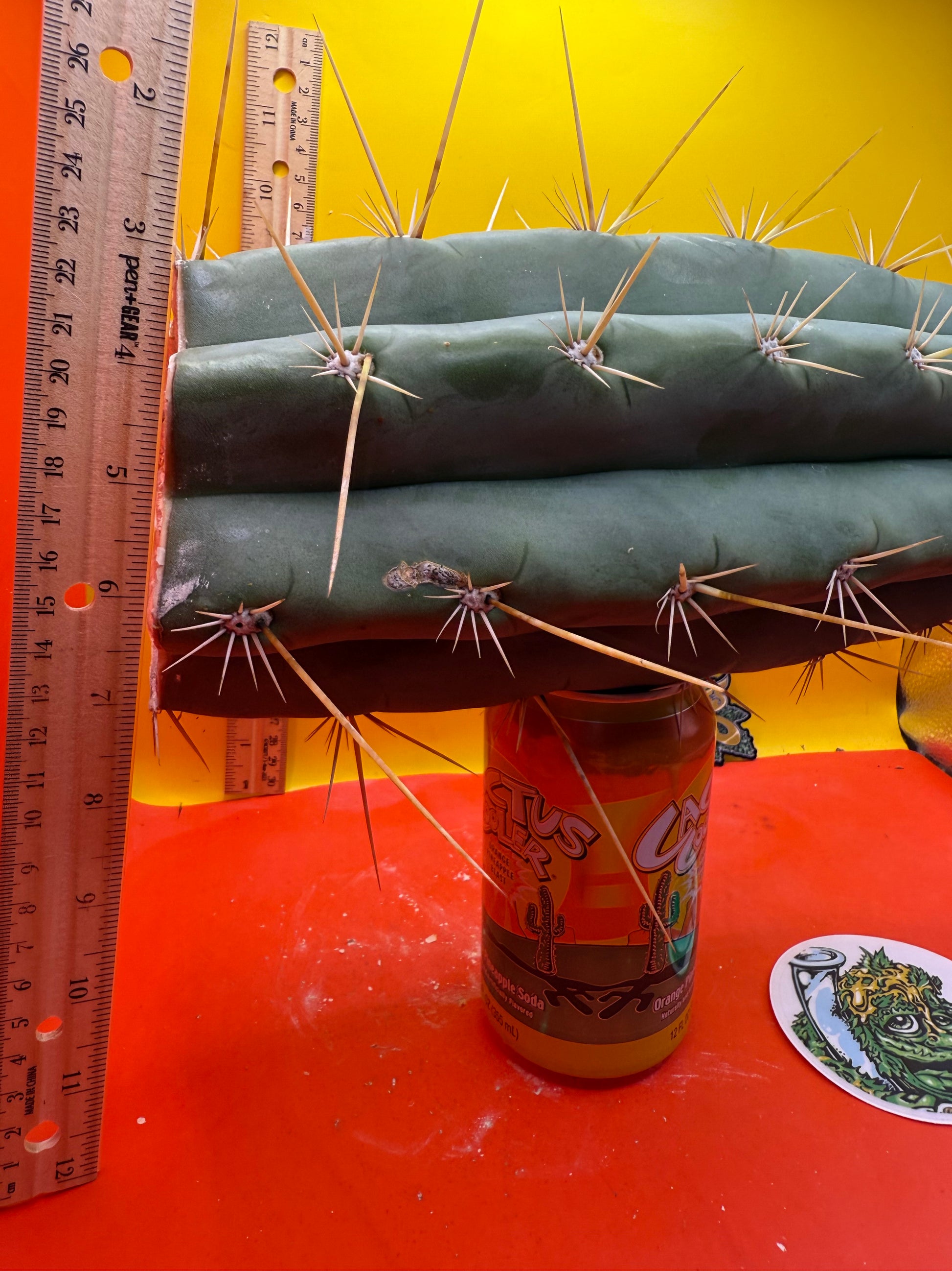 Big huge fat cutting ! This San Pedro cactus is over 4” thick ! Very well hydrated with rubbery blue flesh , and long spines reaching 3 inches in length!! Round white areole adorn the glaucous skin of this beautiful blue beast . This is ready to ship and ready to burst out roots ! Perfect tip and clean cut this is a trophy 🏆!