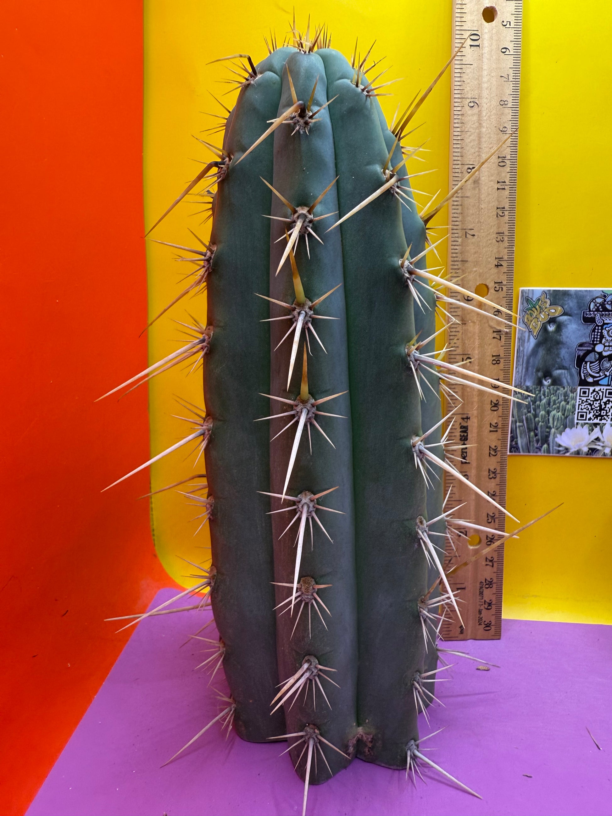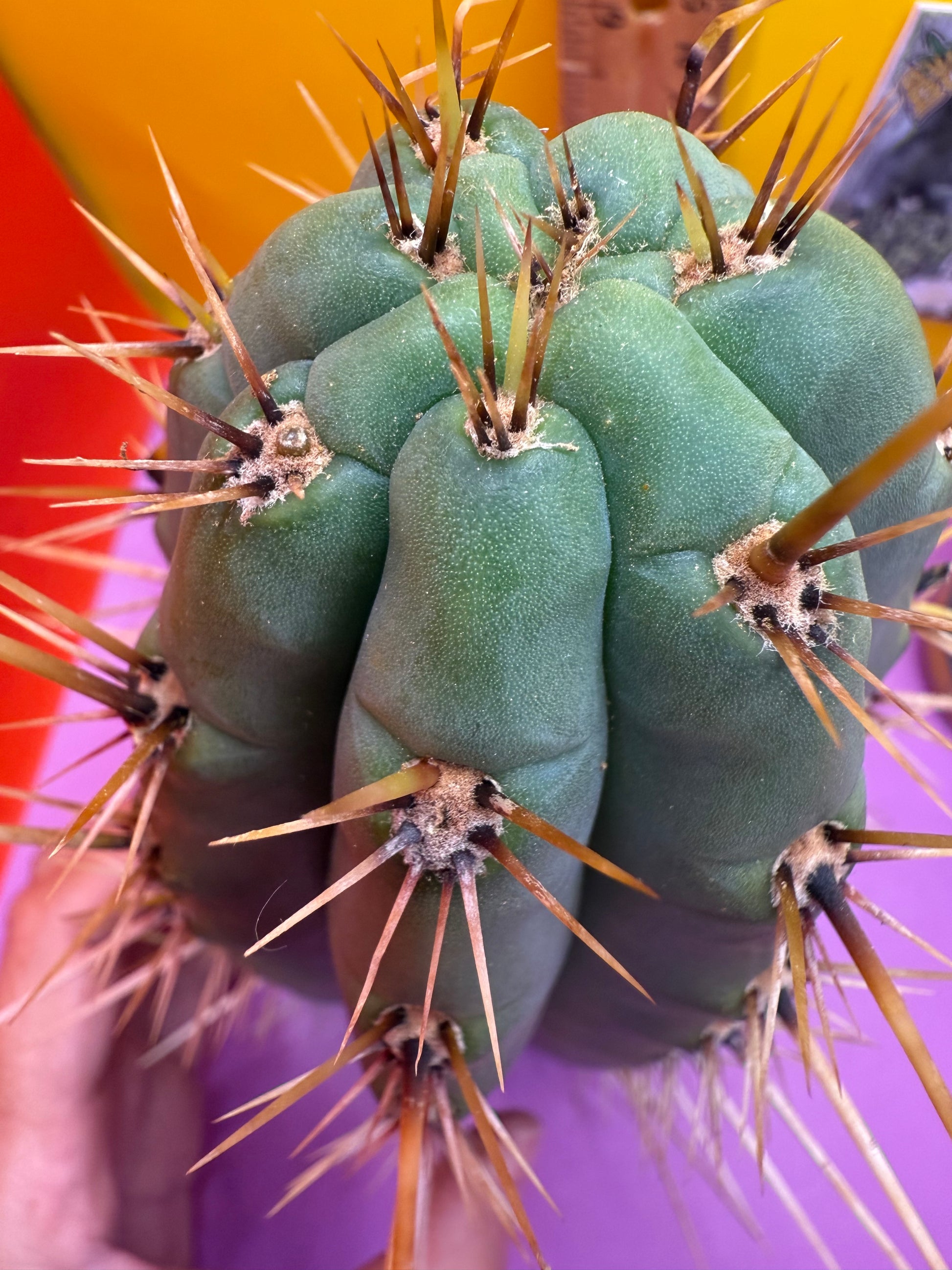 Proud to share this strong spine , protruding areola beauty !! Full sun grown , with a very cool growth tip ! Spines range in color from black , yellow red orange to a brilliant silver , also interesting how the spines grow in every direction, up , out , down … everywhere this is one spiney beast ! over 3” thick , this is fully calloused and ready for planting ! Spines range in all different lengths with some at 2” inches and even longer ones in the mama stand planted in my yard ! You will receive an extremely similar cutting