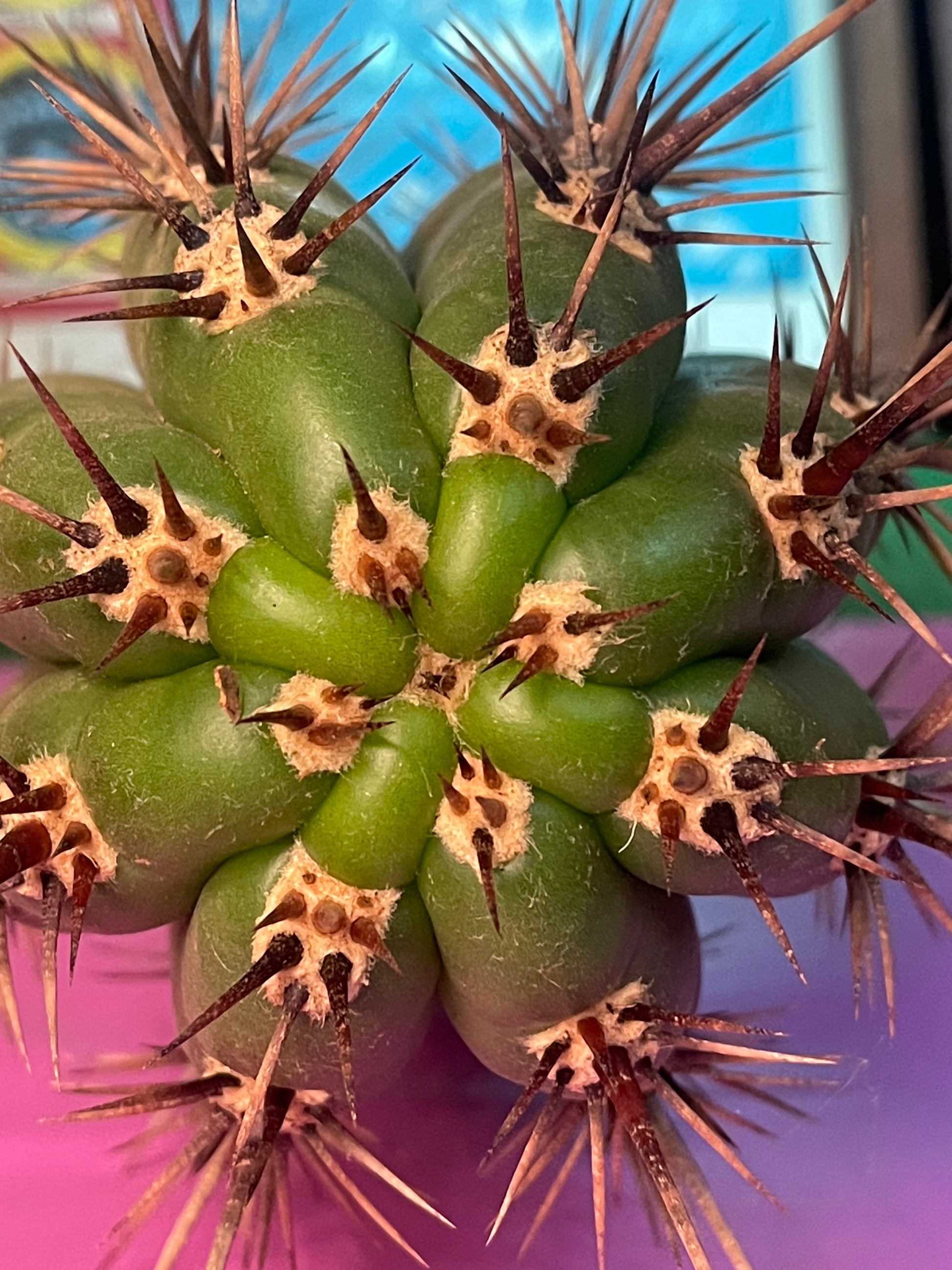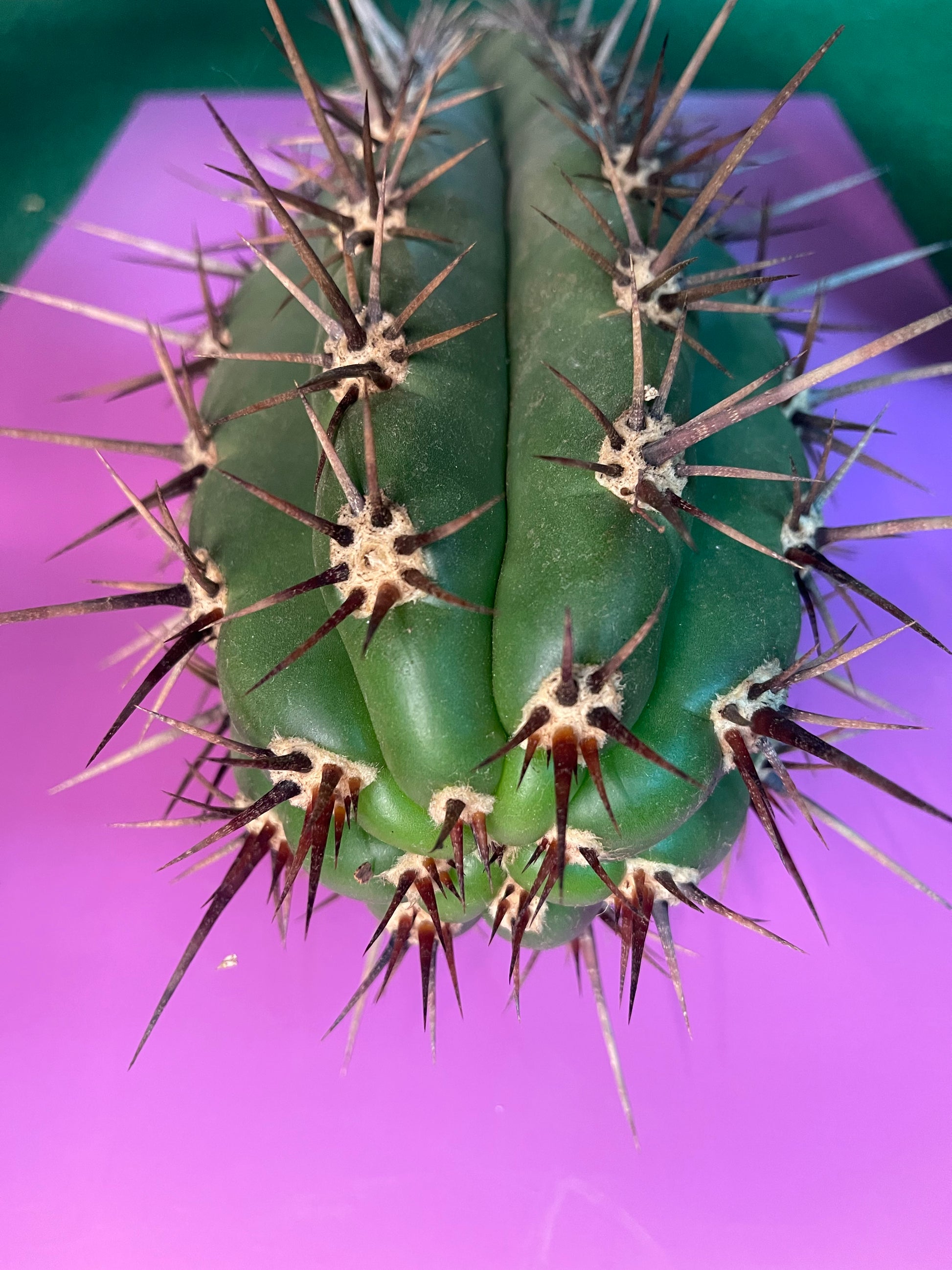 Huge cactus with extremely Thic spines. The “Taca” grows Tall and proud , boasting its lovely ornate spines ! Thicker than incense spines emerge from the tip with a vivid red glow and slowly turn to a deep lush black , quite the contrast against its Snow White oval shaped areole . Each areole take up some real estate on this cactus dark green flesh , some ovals grow to over 1 inch !!! The spines themselves regularly reach two inches in length and protrude in all directions which necessitates wide spacing between each one . The wide space inbetween each bright white areole gives room for a big deep V notch accentuated by its enormous ribs ! This trichocereus is not often offered at such a large size and weight because of difficulty in shipping and handling, I’m experienced and confident in my packaging and shipping and I’m proud to offer you such a BEAST !