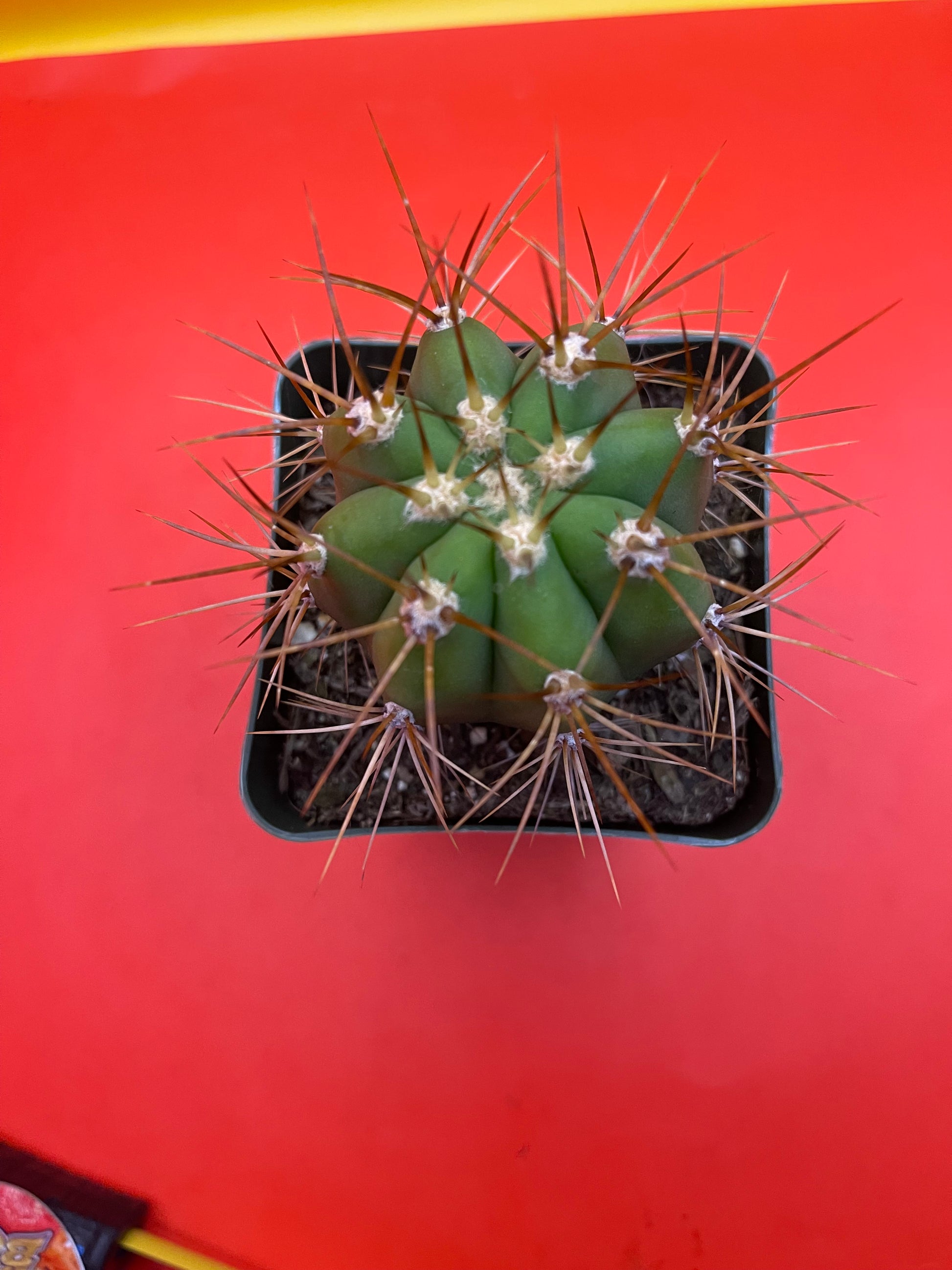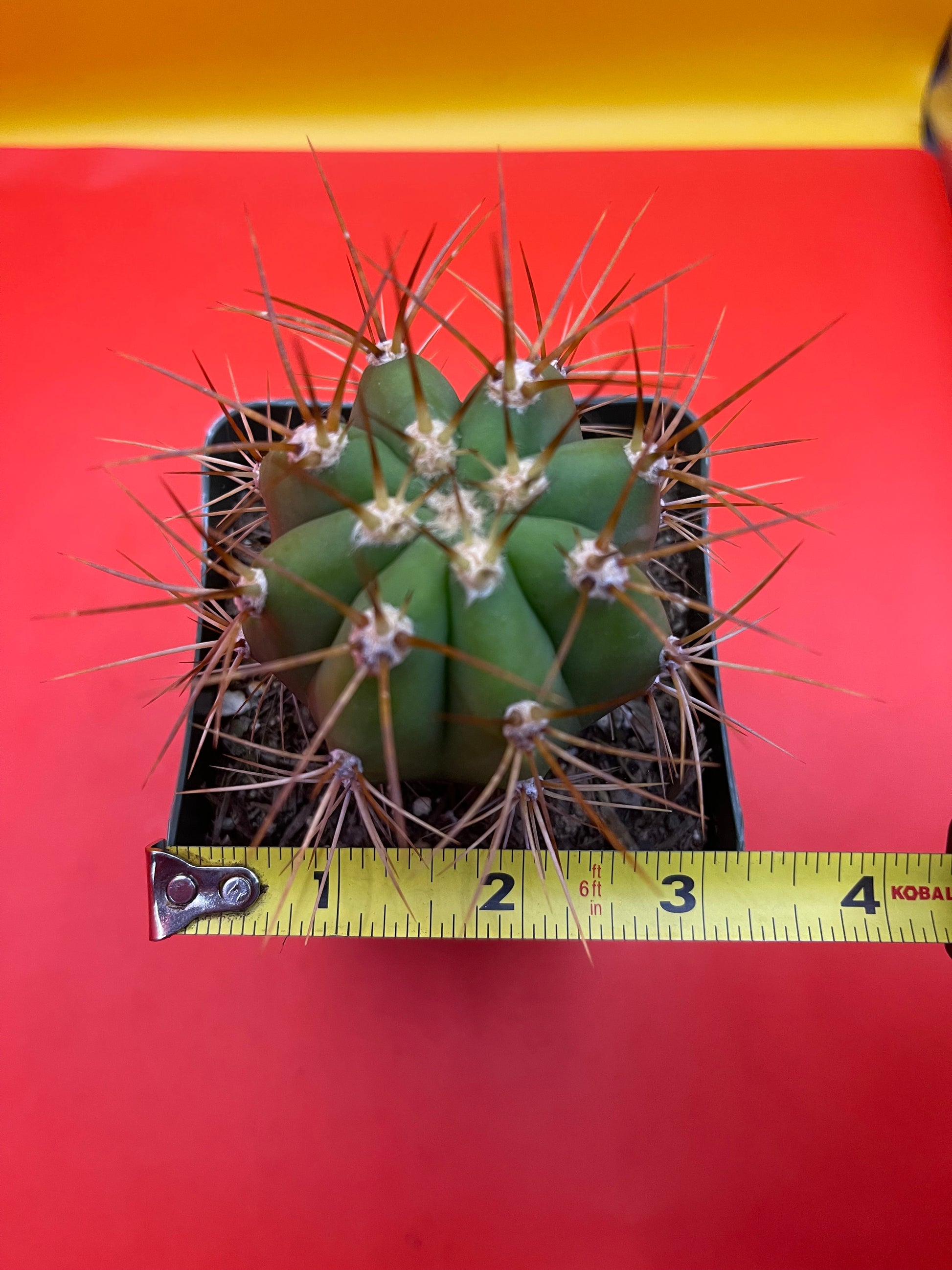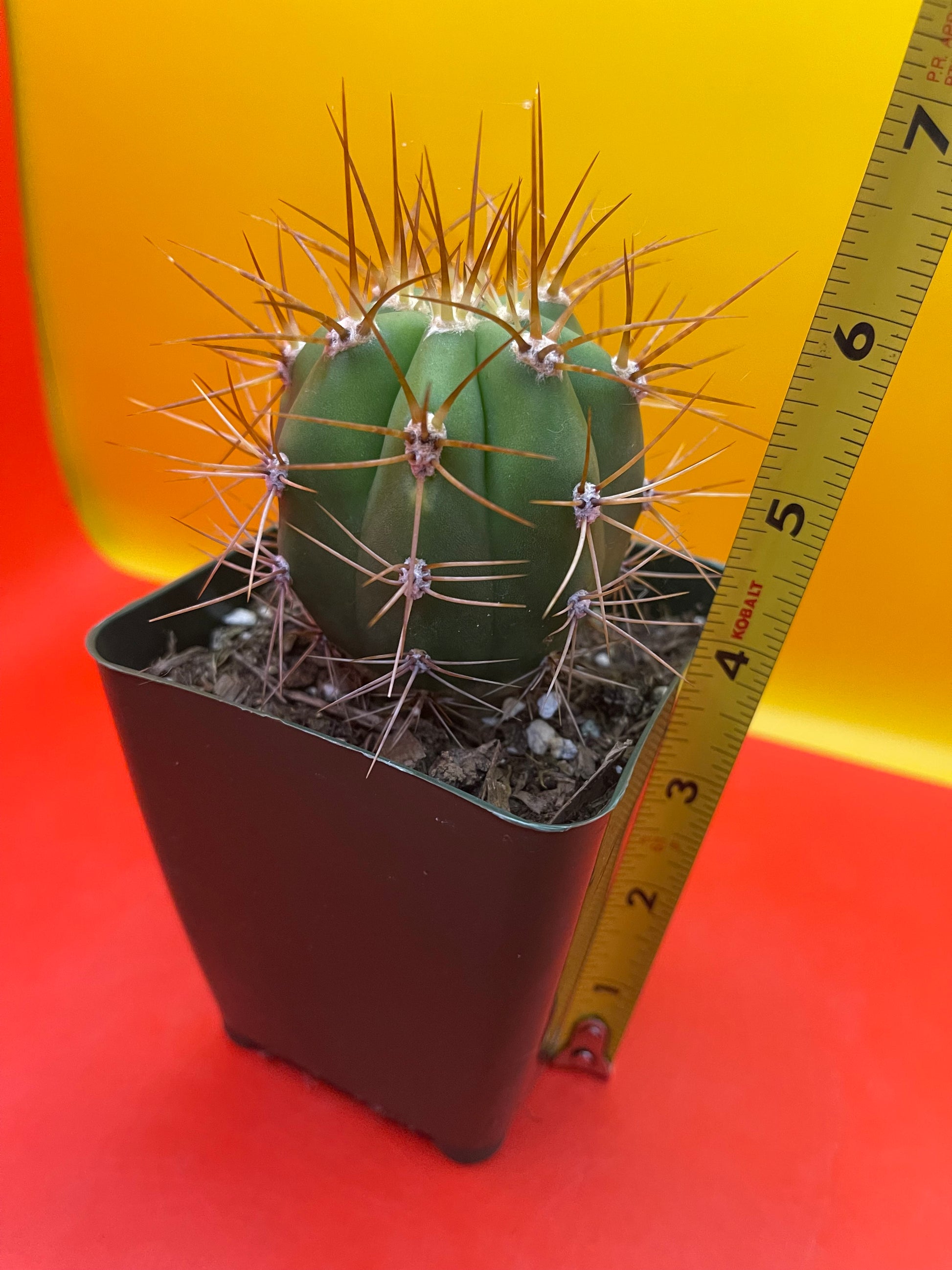 Big , Fat , Branching cactus when mature! Highly sought after these are a MUST for any cactus collection! Very fun to watch grow , long curved spines give a strong look and protect this fleshy cactus from critters ! These are fully rooted and grown from seed , they produce a beautiful flower and can be cross pollinated with other trichocereus! Being grown from seed gives them each their own unique DNA although they all look very similar. You will receive 1 terscheckii rooted and in its pot . This cactus is growing healthy in its 4” tall green pot with a high quality custom cactus soil and the pot itself has great drainage!!