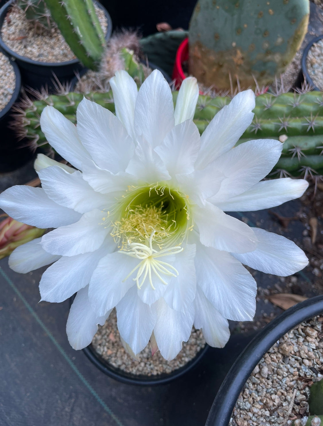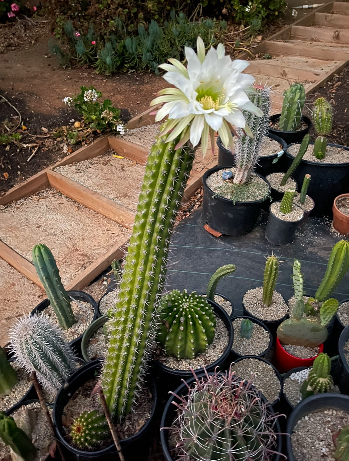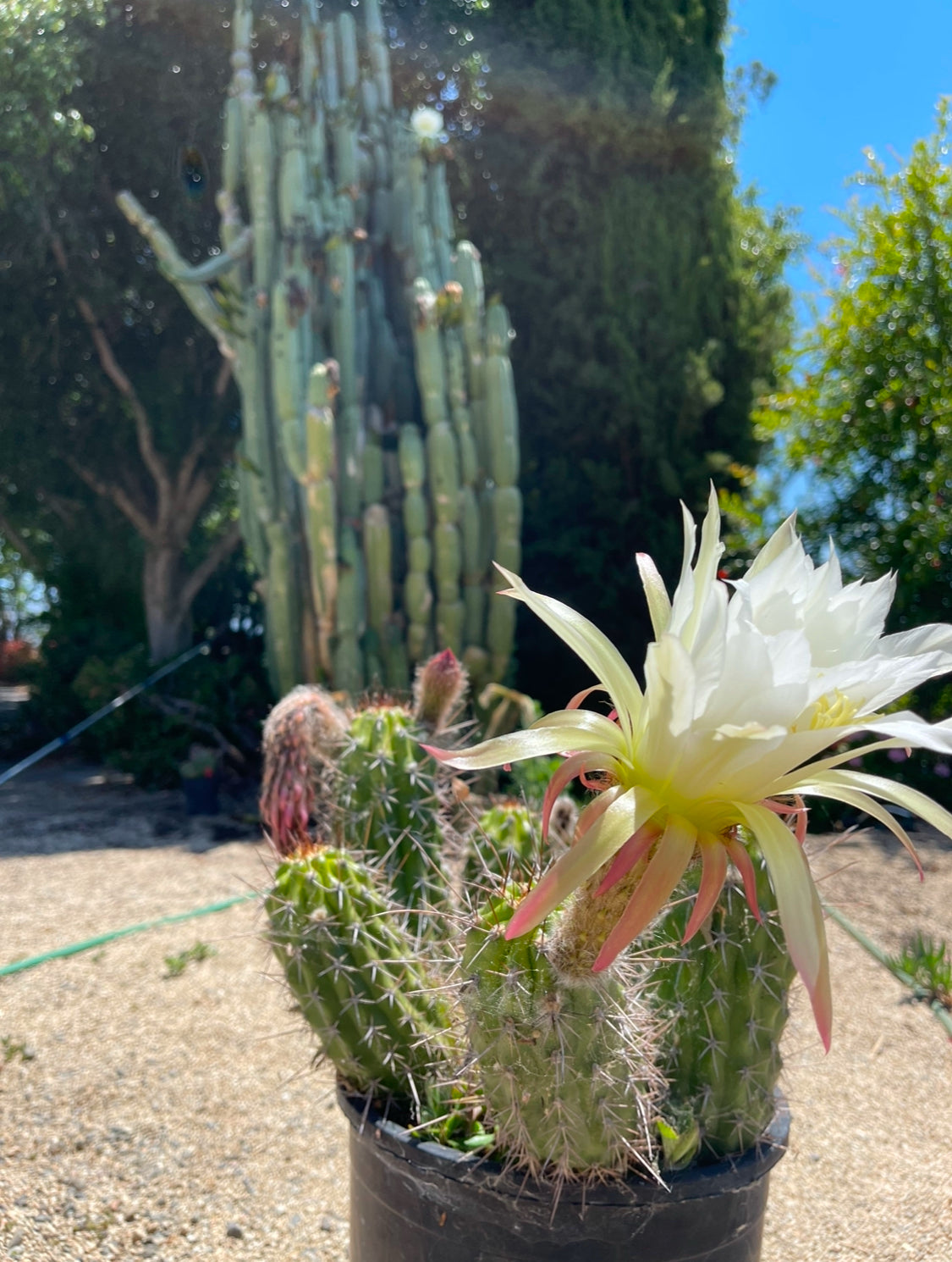 You will receive this exact cutting- flowering pictures are for example purposes. Awesome trichocereus cultivar , profuse bloomer . This one loves to “lye down” and often creeps on the ground . Usually grows to about 3 feet tall then leans over and puts out multiple basal pups from its base creating a large sprawling cacti that can even resemble an octopus style “bush” of sorts .blooms get a pink tinge at the tips of its white blossoms.