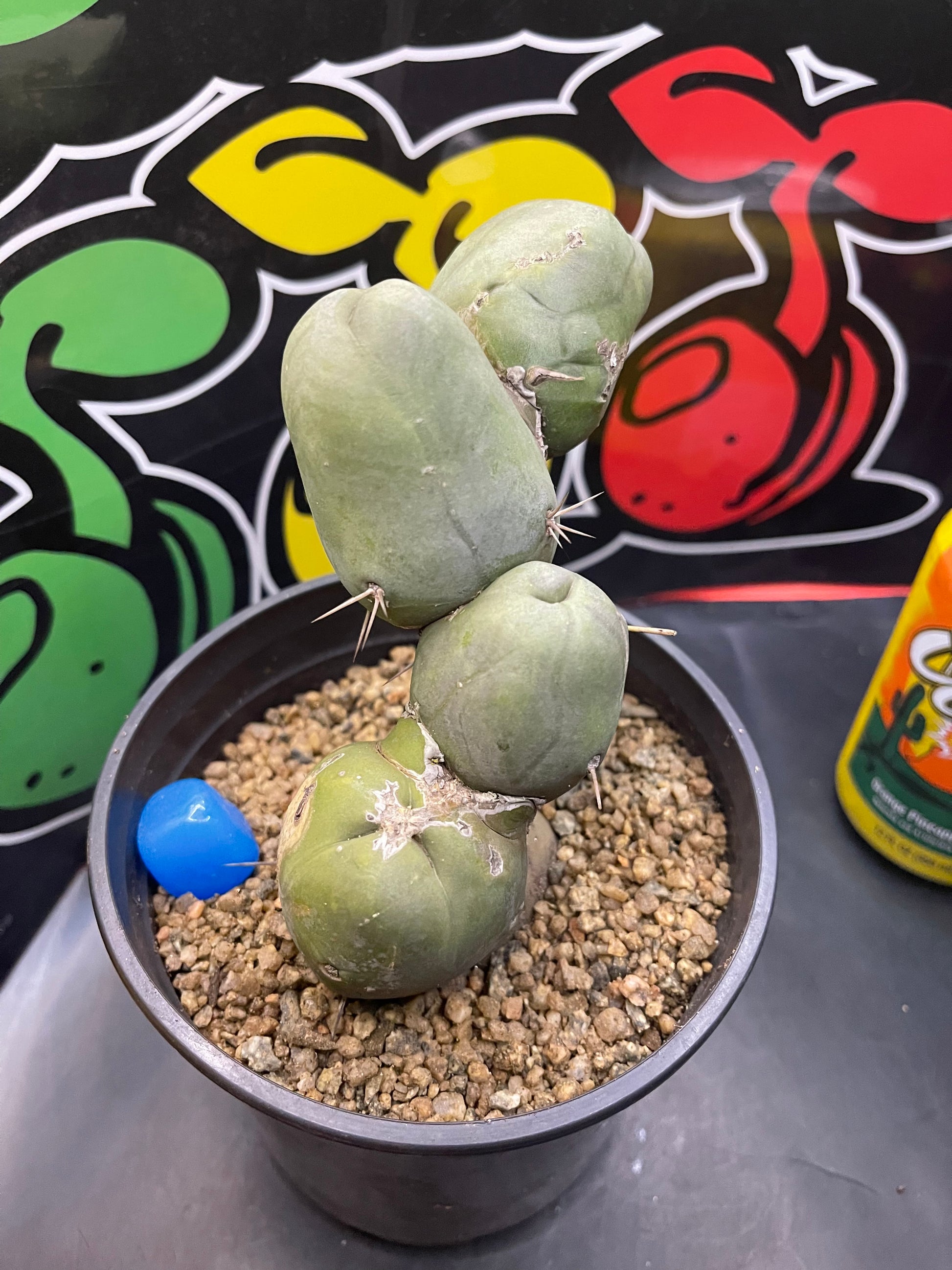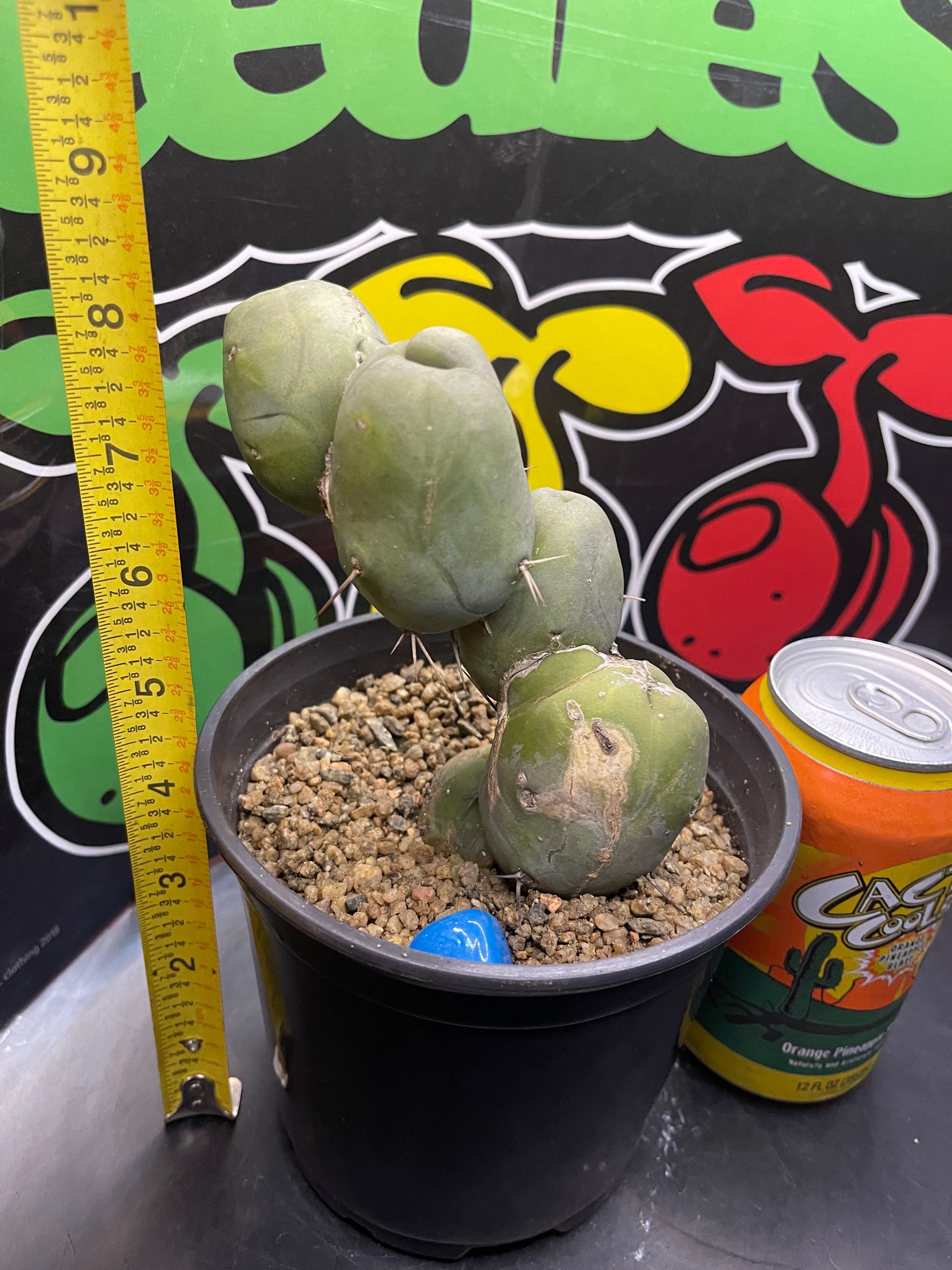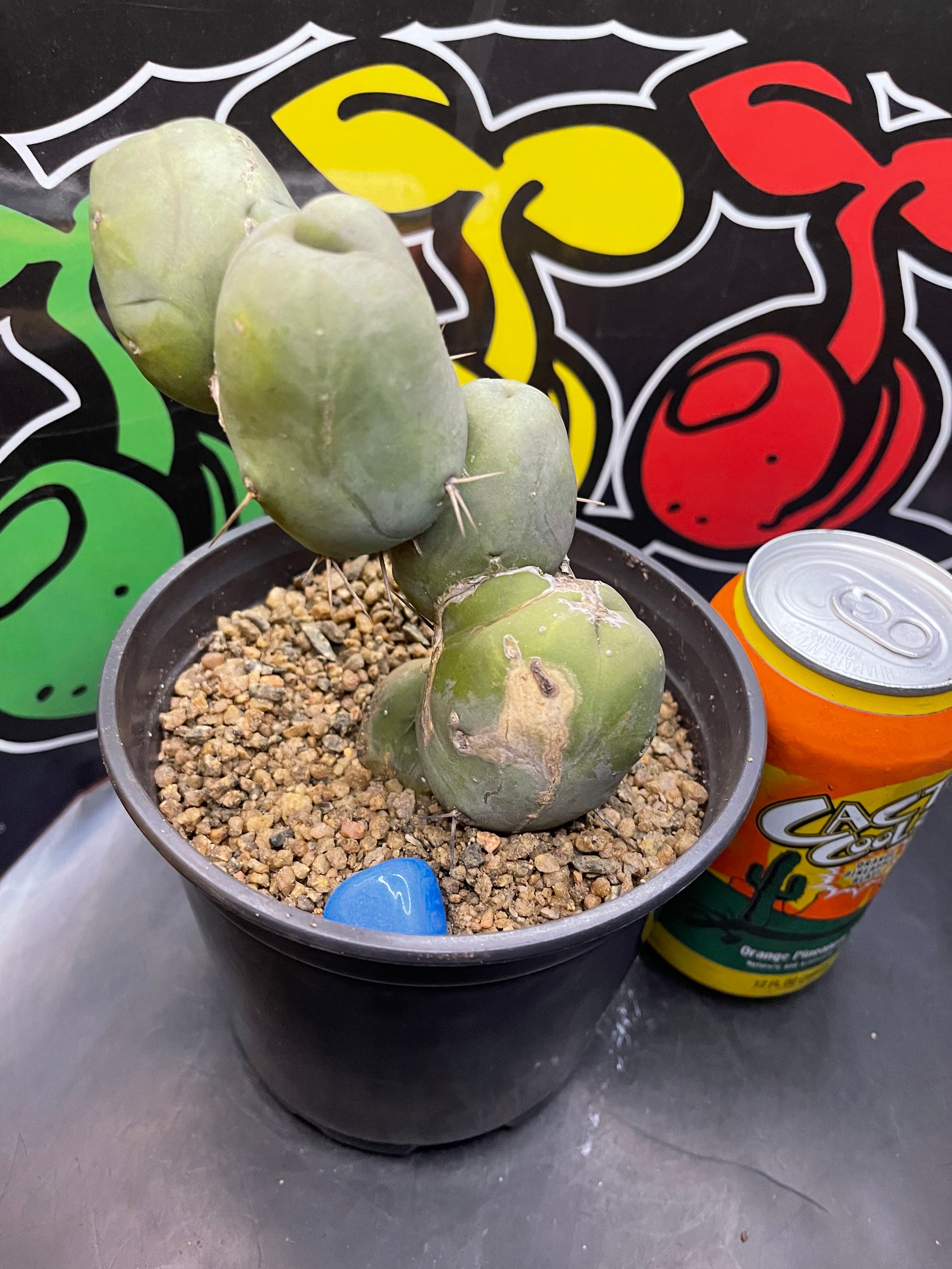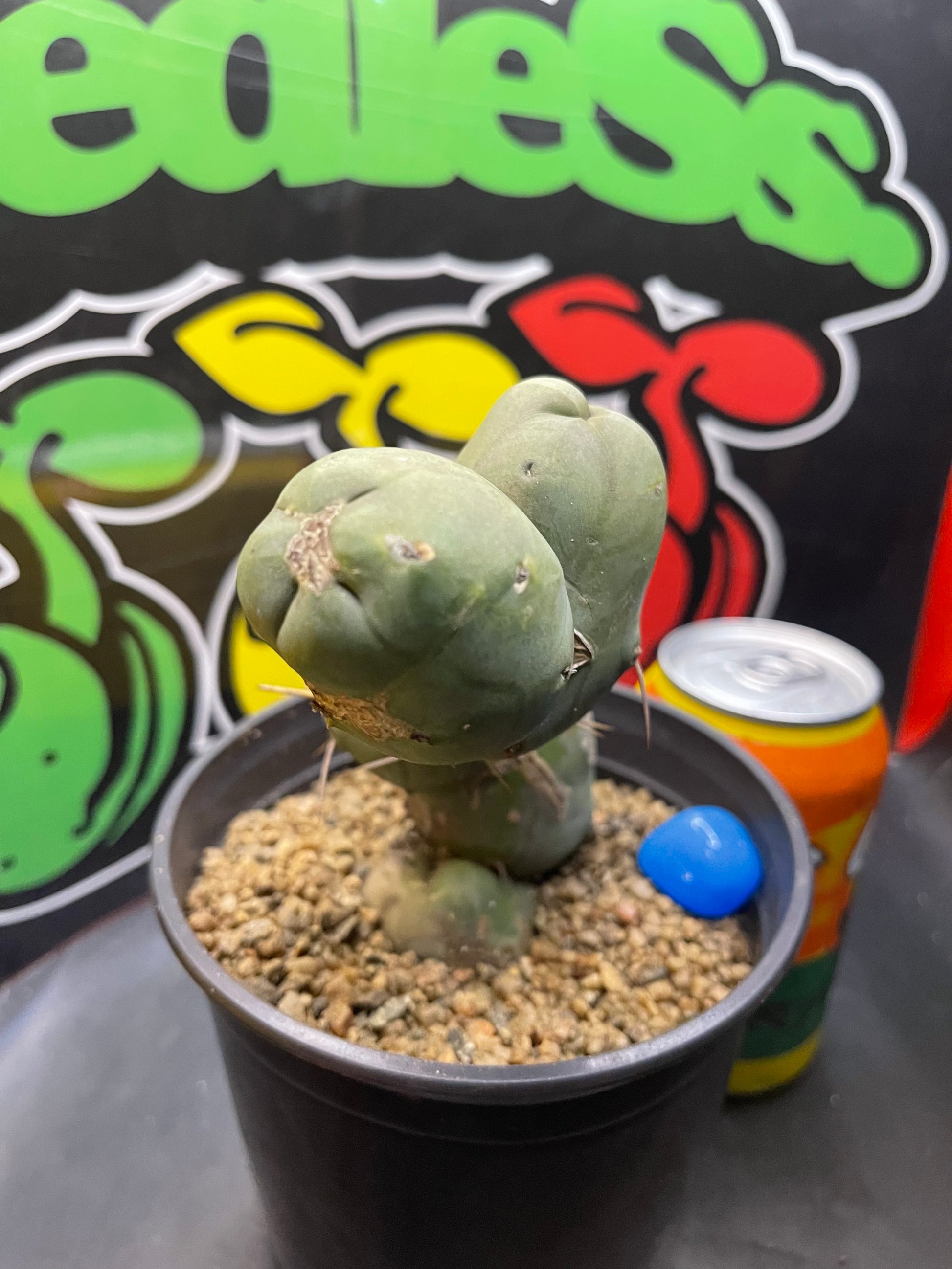 Trichocereus bridgesii monstrous Type B - shortform ! This is a half gallon pot , fully rooted , I took this cutting myself , planted and grew it just for you !!!! Happy to send one of my special cactus to your home !!it will arrive just the way you see it , it it’s pot will top dressing and a lil blue glass for decoration- I’ll pack it with love and care so it arrives safe and sound !