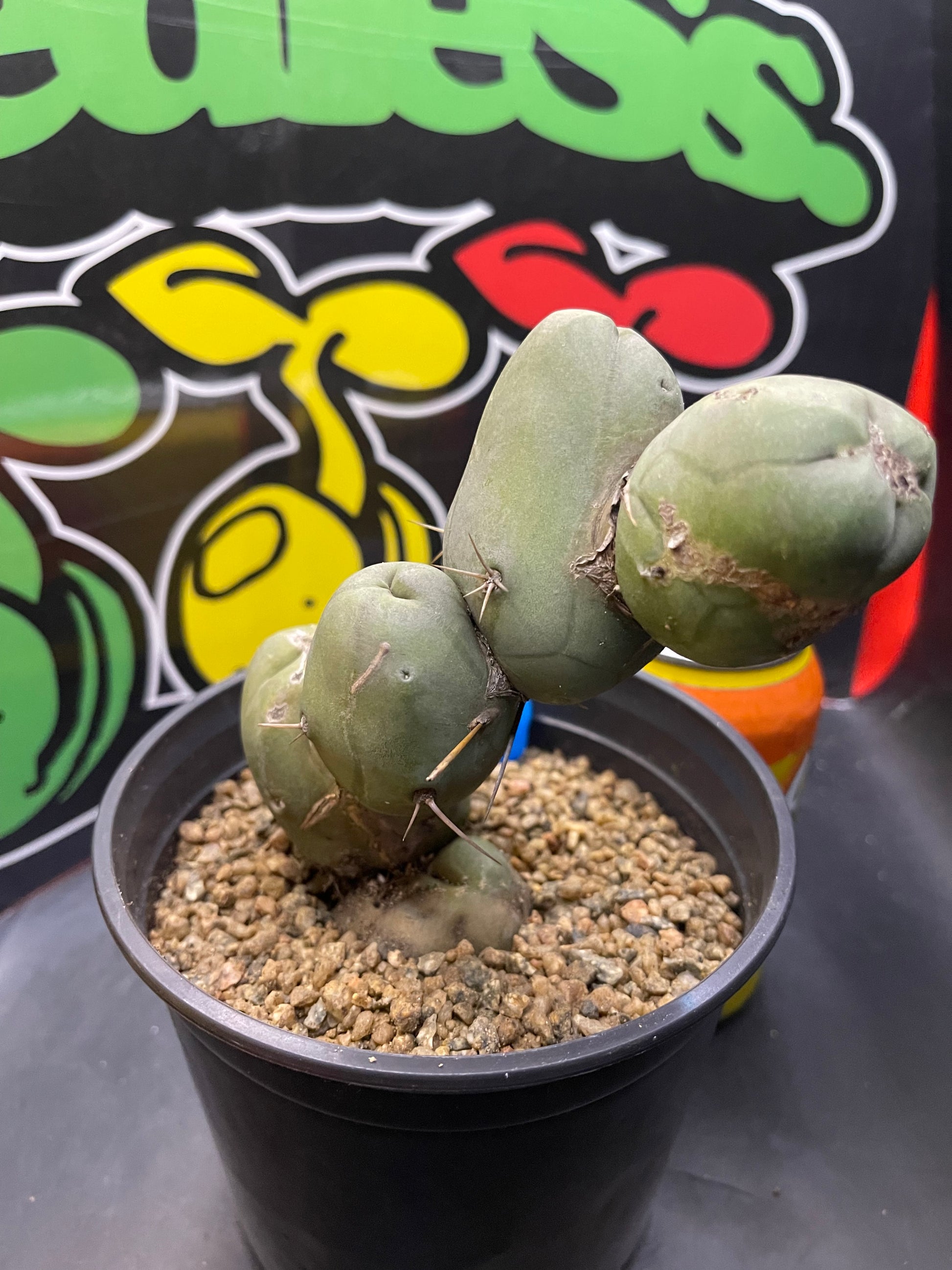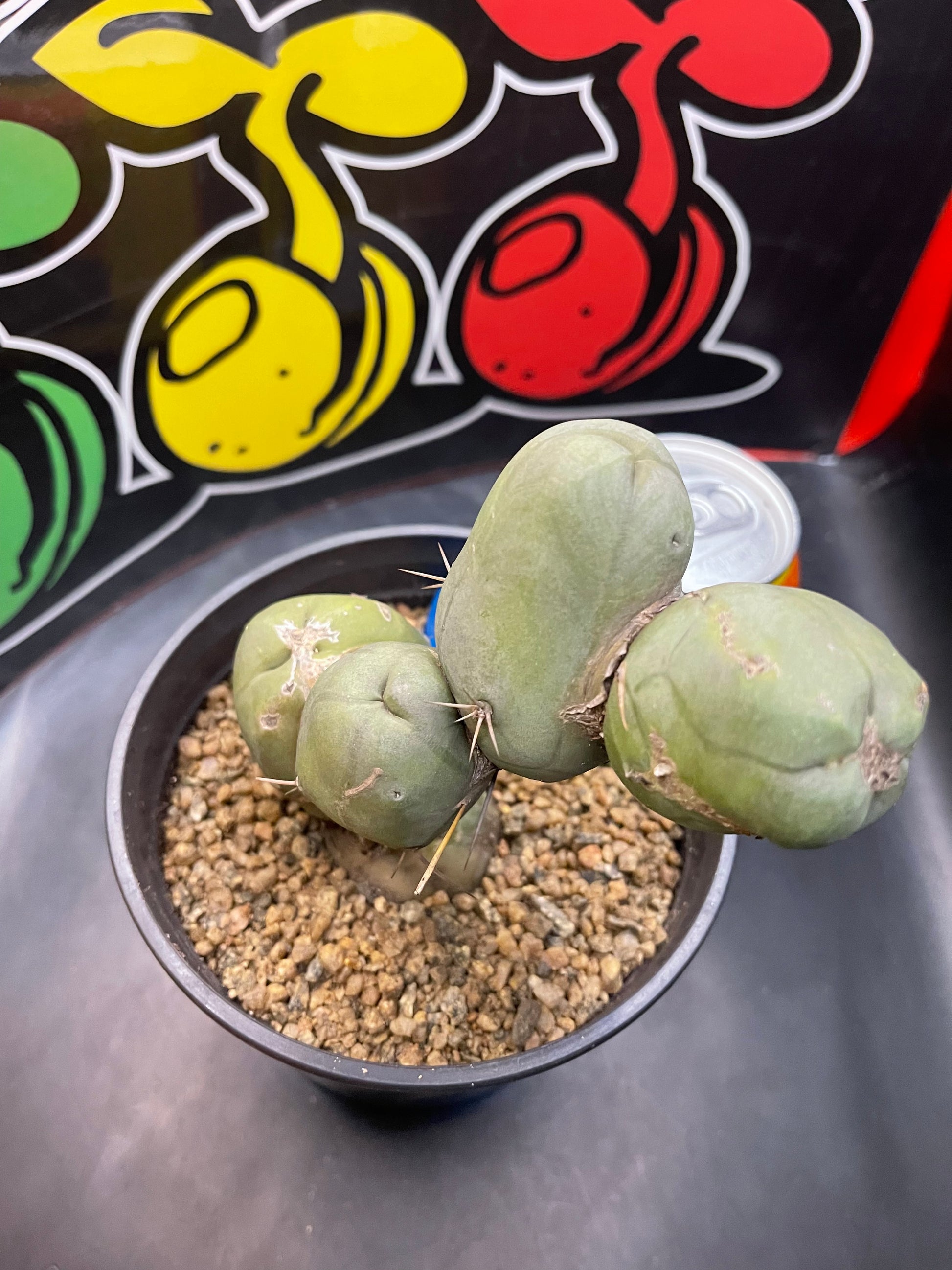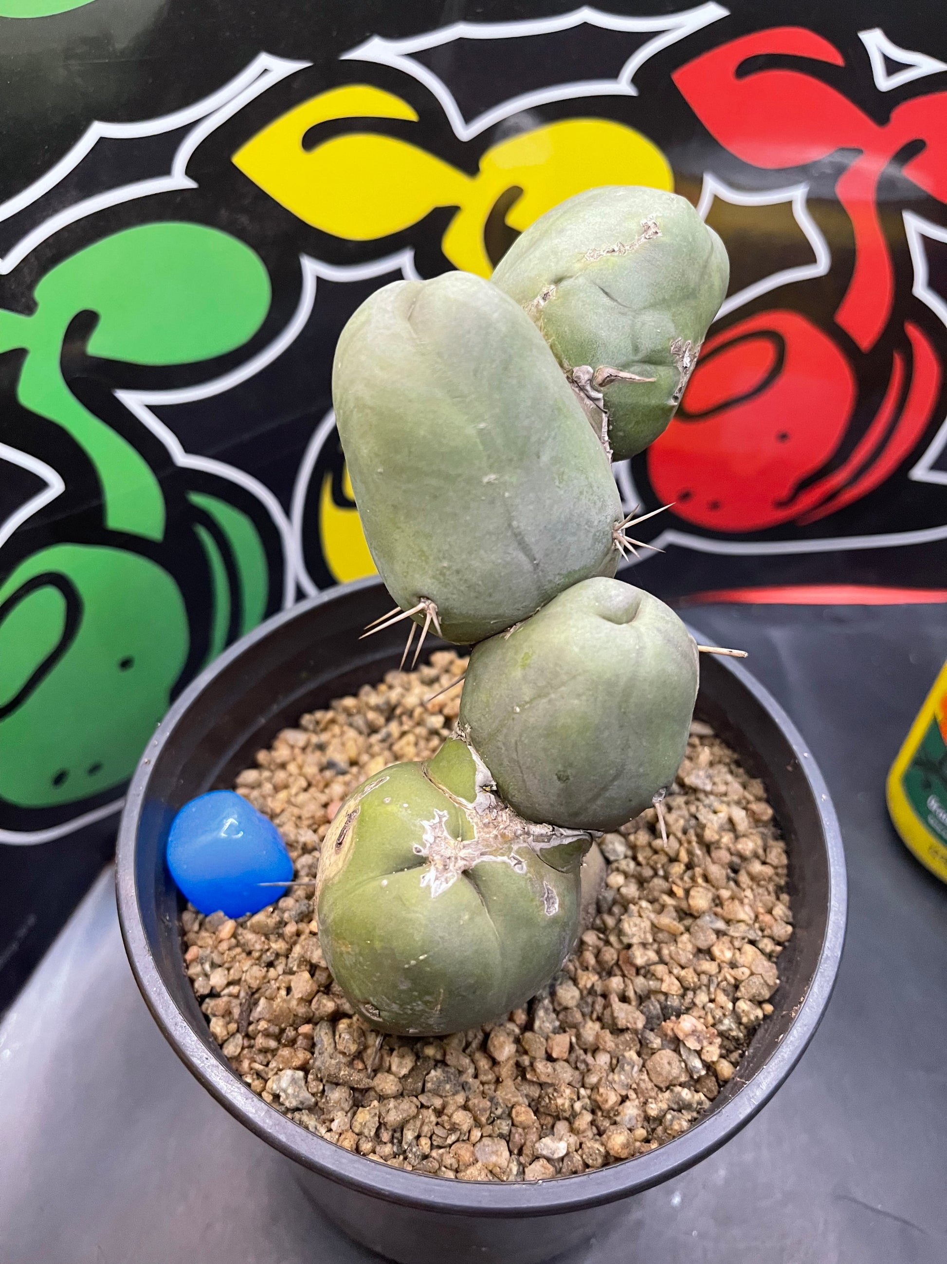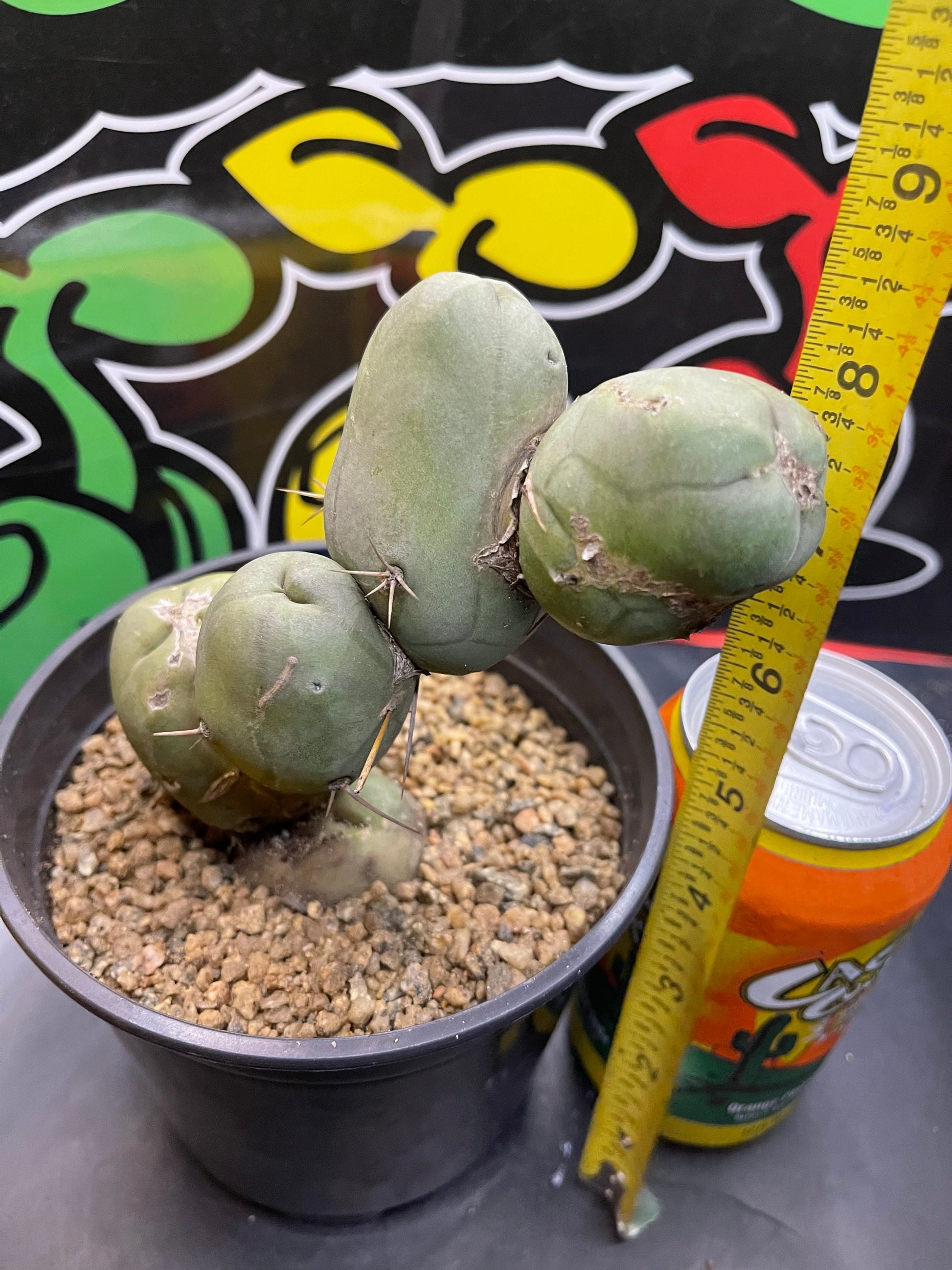 Trichocereus bridgesii monstrous Type B - shortform ! This is a half gallon pot , fully rooted , I took this cutting myself , planted and grew it just for you !!!! Happy to send one of my special cactus to your home !!it will arrive just the way you see it , it it’s pot will top dressing and a lil blue glass for decoration- I’ll pack it with love and care so it arrives safe and sound !