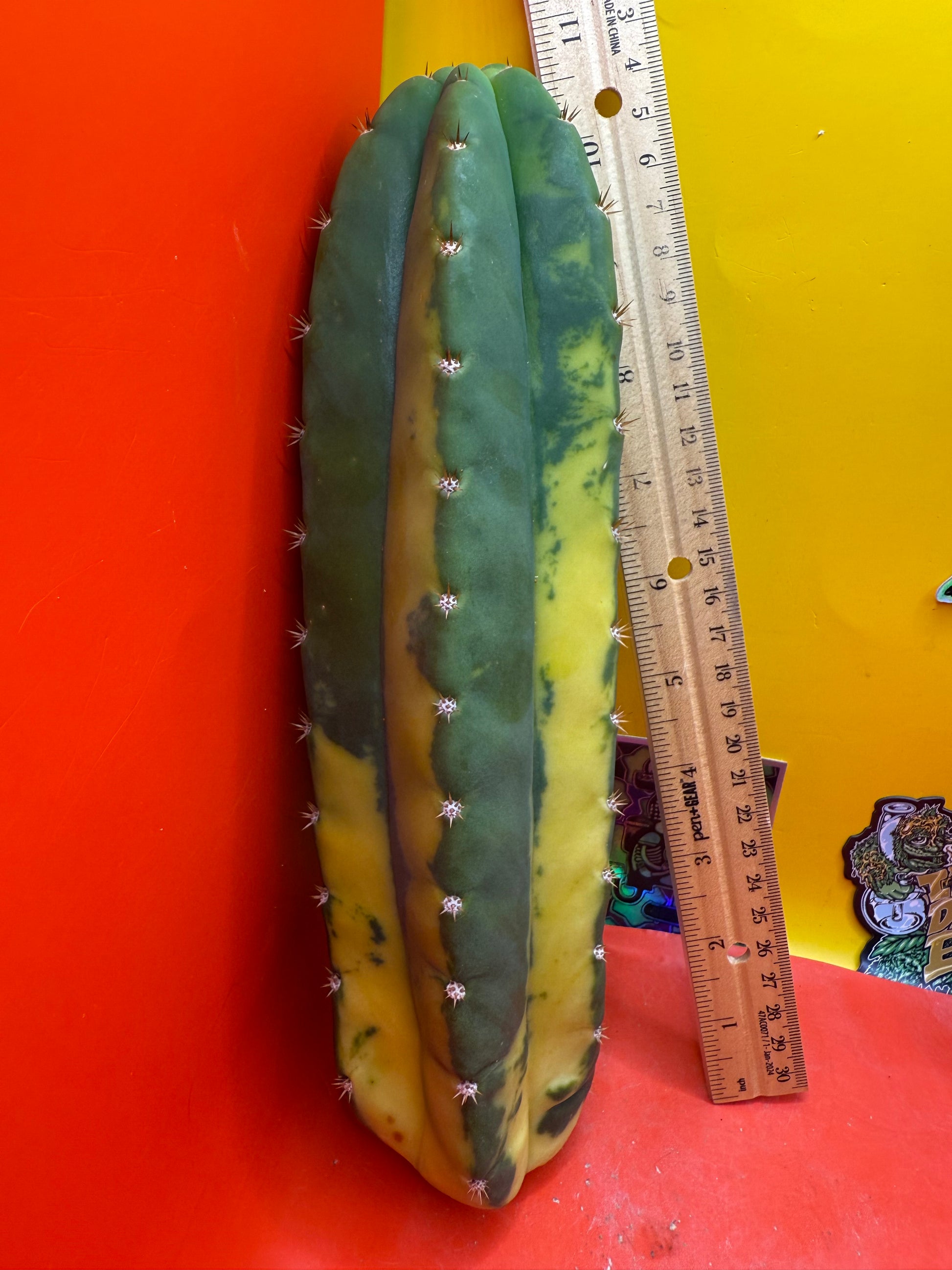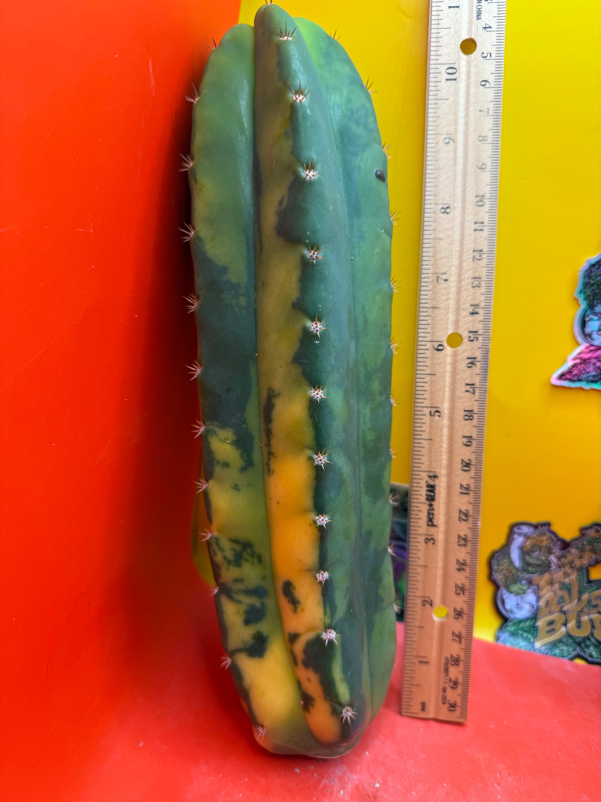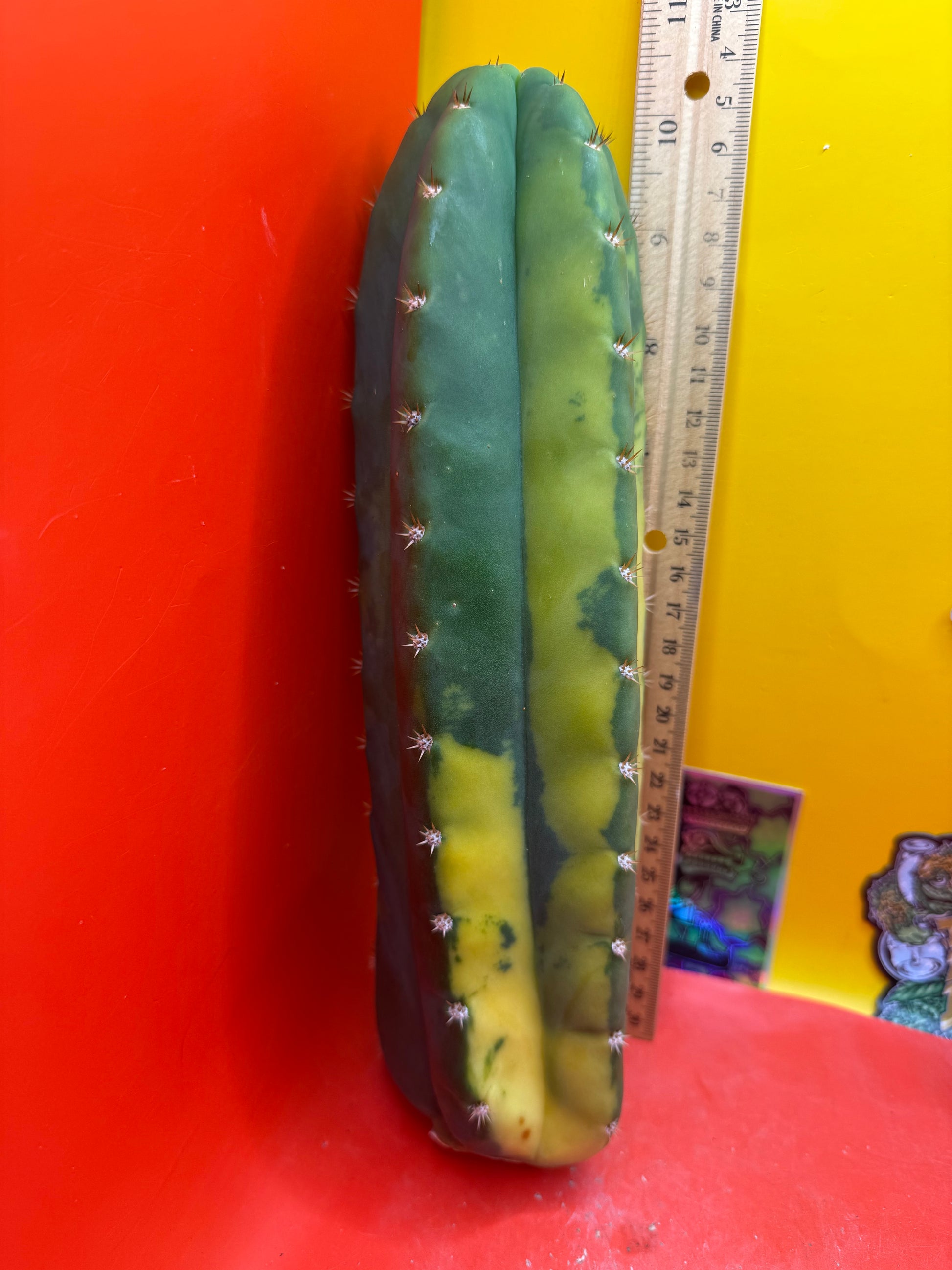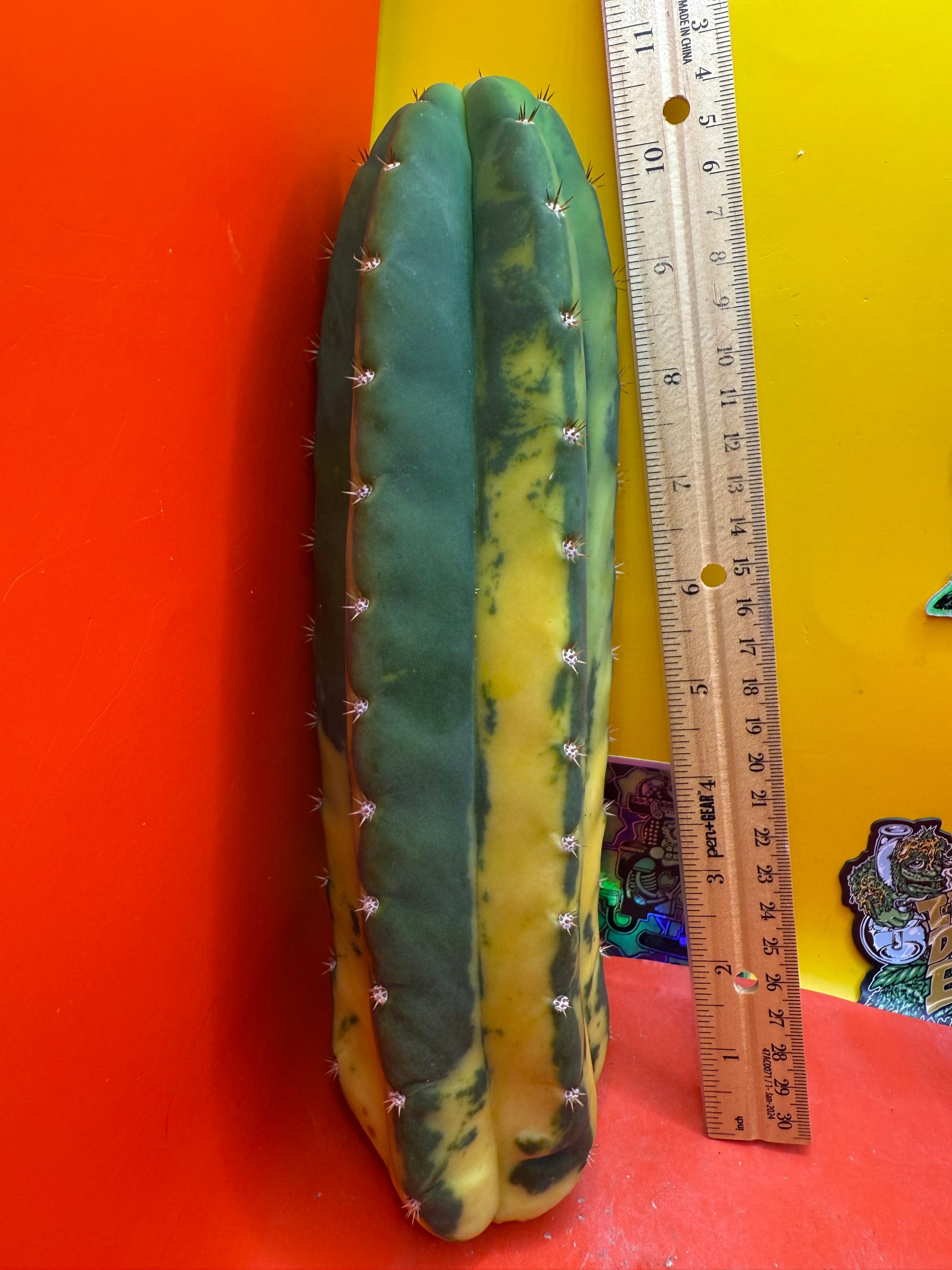 Fully variegated, all sides have awesome coloration ! Tons of marbling on this , multiple tones of green and vivid yellow ! Tip is pumping out new variegation. Healthy happy cut is ready to ship . This trichocereus starts as like green at the tip and with sun and maturity it becomes strong yellow ! Really a very cool cactus to watch grow , can be grafted or grown on its own roots