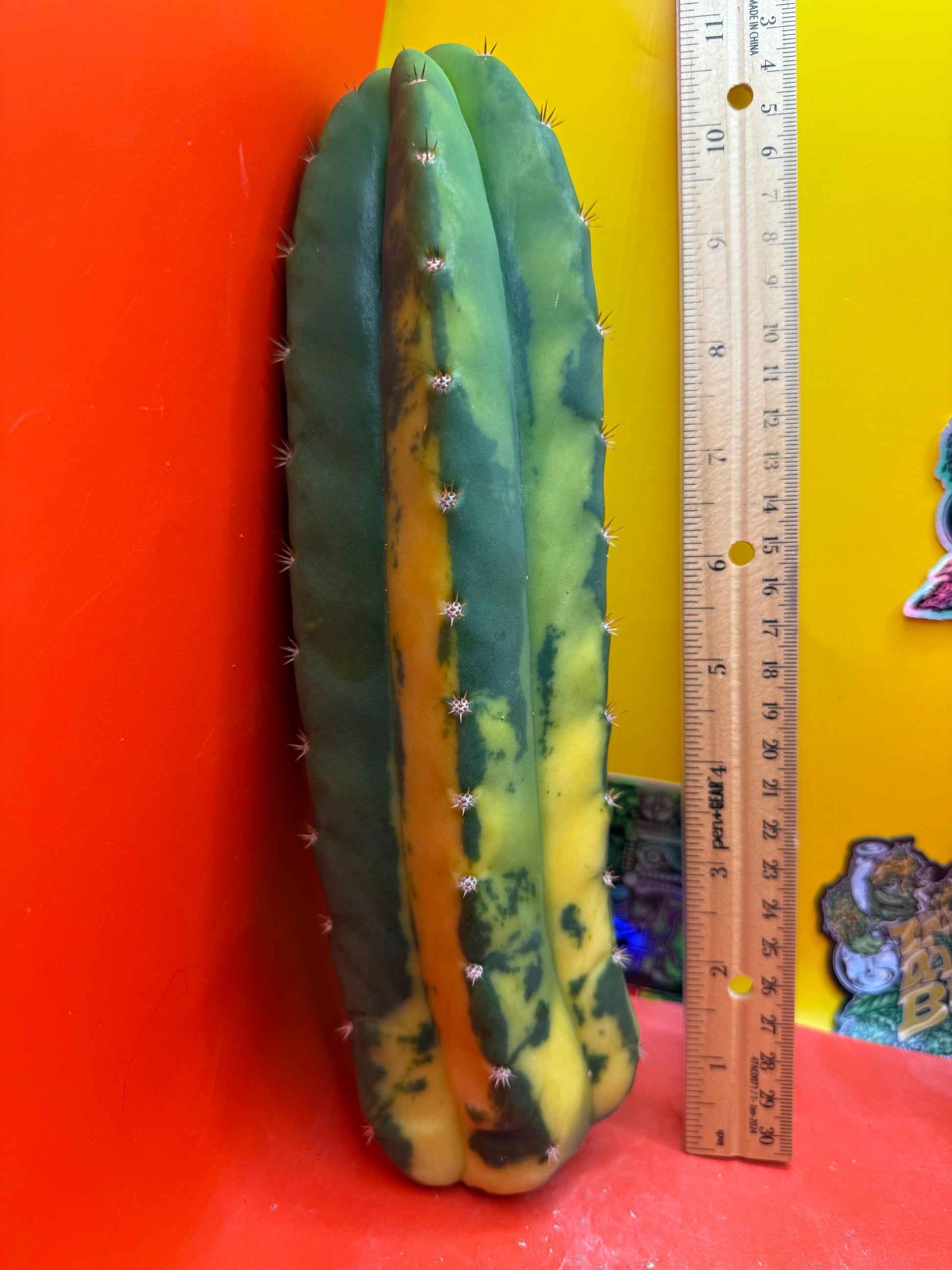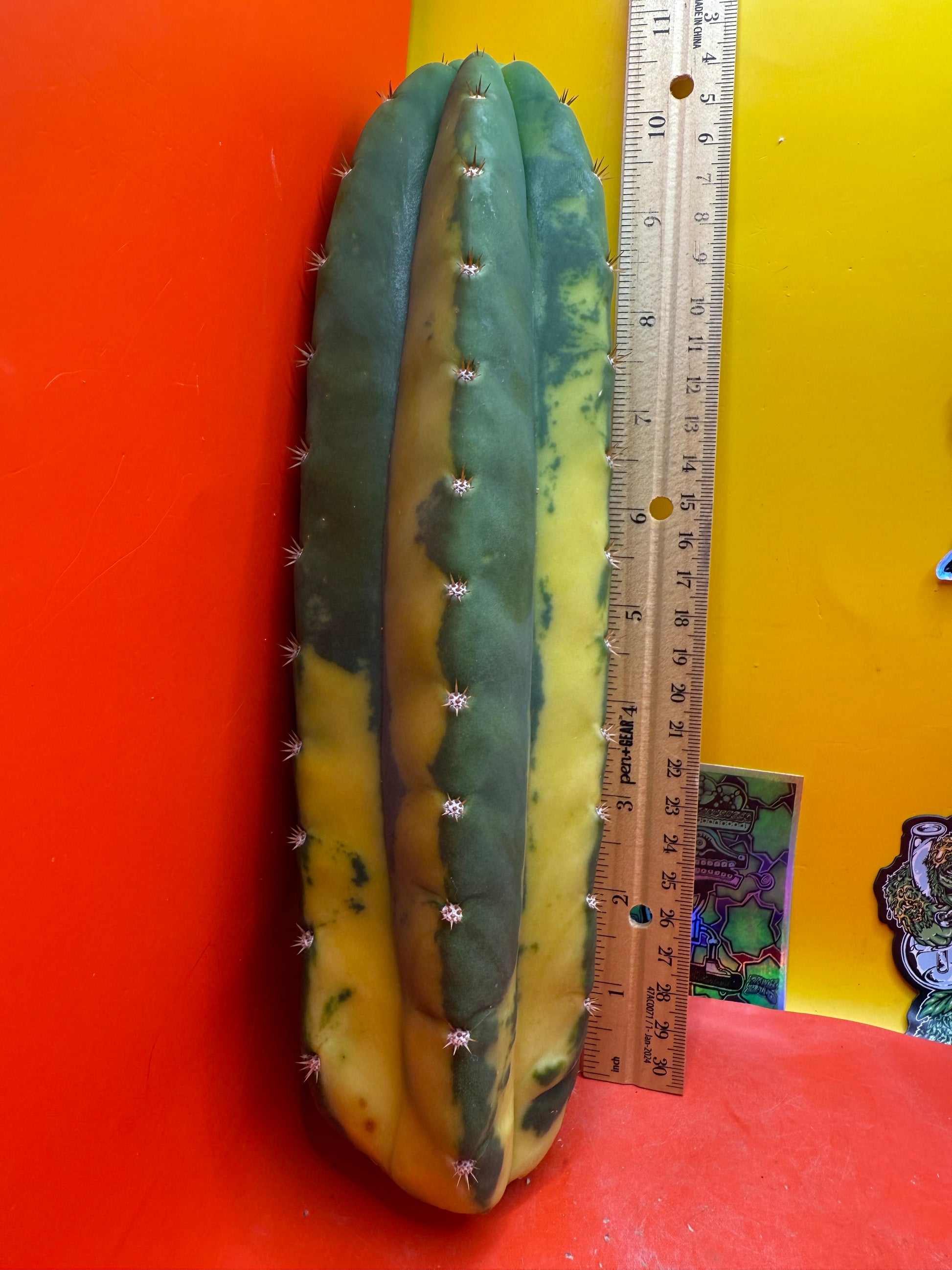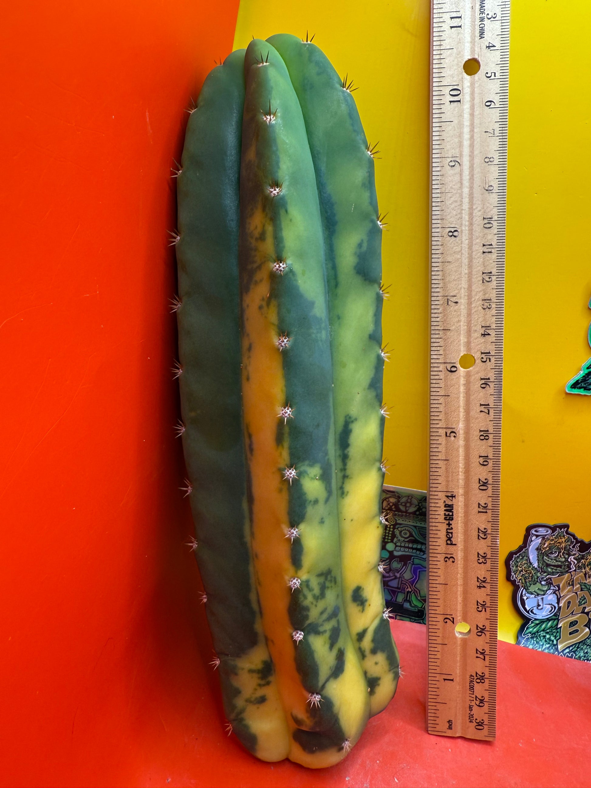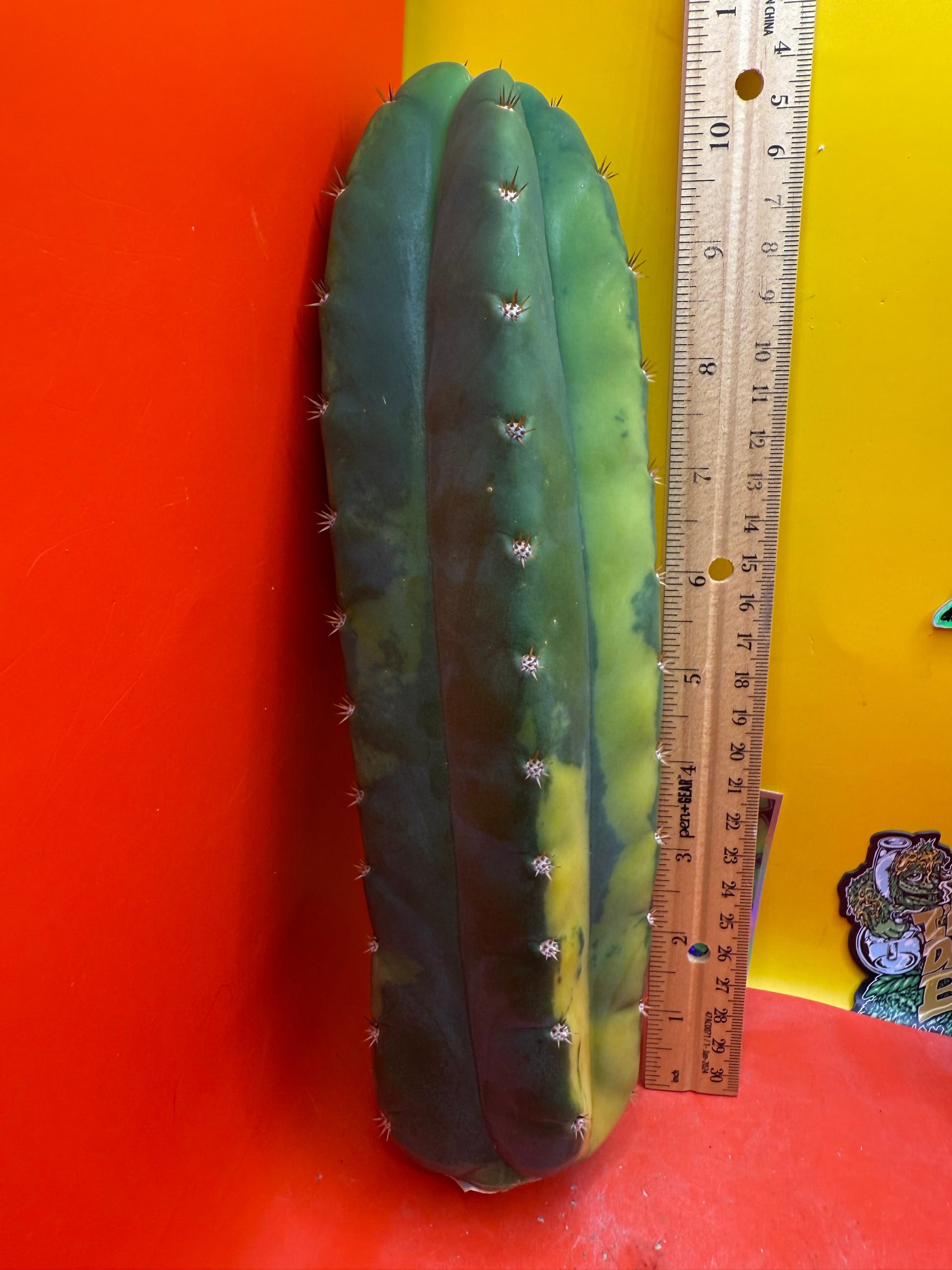 Fully variegated, all sides have awesome coloration ! Tons of marbling on this , multiple tones of green and vivid yellow ! Tip is pumping out new variegation. Healthy happy cut is ready to ship . This trichocereus starts as like green at the tip and with sun and maturity it becomes strong yellow ! Really a very cool cactus to watch grow , can be grafted or grown on its own roots